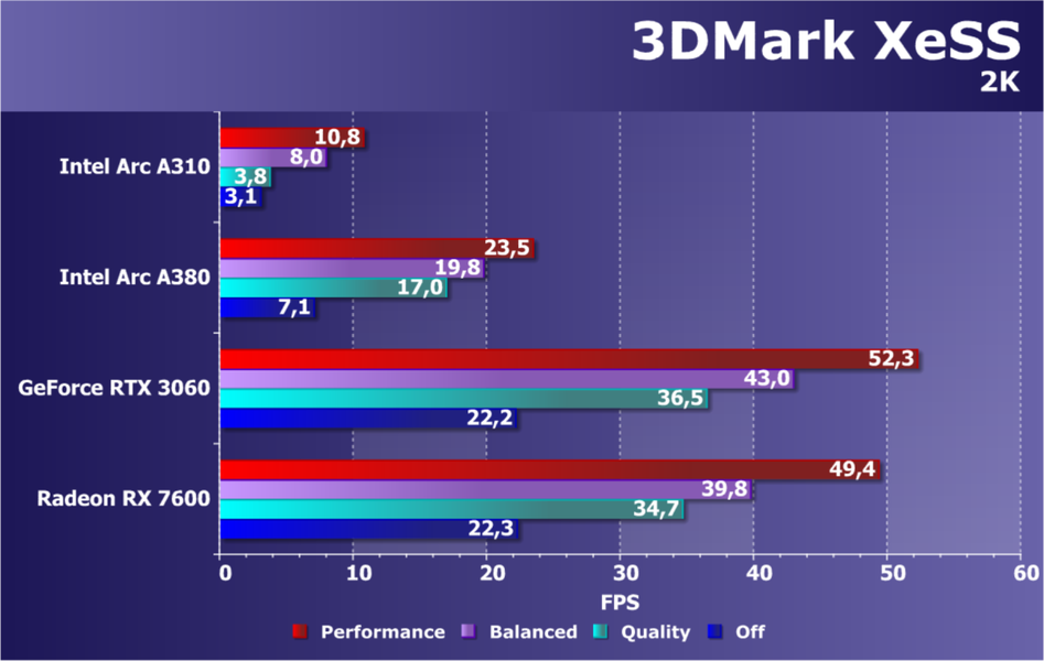 Конечно же, это далеко не мощное игровое решение. С топовыми моделями AMD и Nvidia не конкурируют даже флагманы Intel, их лучшие модели могут поспорить разве что с такими видеокартами, как GeForce GTX 3060 (Ti) и AMD Radeon RX 6600 (XT), а уж Arc A310 — решение самого начального уровня, которое с трудом потянет игры в Full HD даже не при высоких графических настройках. Повысить уровень производительности поможет включение технологий масштабирования изображения XeSS или FSR — в зависимости от поддержки играми. Зато эта недорогая видеокарта отлично работает с видеоданными в формате AV1, обеспечивая аппаратное кодирование, а также способна выводить информацию на дисплеи по DisplayPort 2.0.
