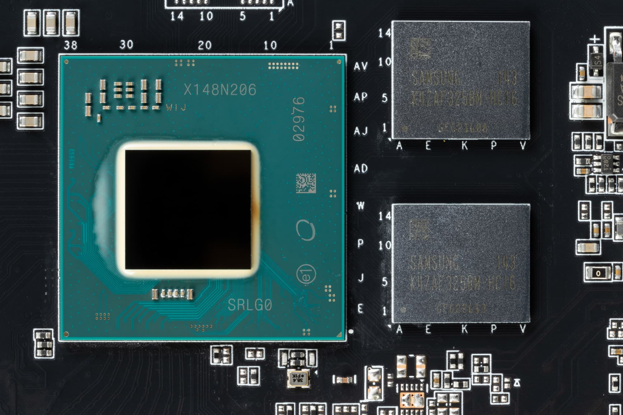 Подсемейство Arc 3 использует младшую версию чипа, а Arc 5 и Arc 7 основаны на другой модели GPU, имеющей разное количество активных вычислительных блоков. Так что первое поколение дискретных видеокарт Intel Arc состоит из двух графических процессоров архитектуры Xe-HPG: DG2-128 и DG2-512 (или ACM-G11 и ACM-G10), и сегодня нас интересует младший из них. При производстве графических процессоров ACM-G11 используется 7-нанометровый техпроцесс TSMC N6, кристалл имеет площадь 157 мм², а количество транзисторов составляет 7,2 млрд — примерно втрое меньше, чем у старшего чипа ACM-G10. Выбор фабрики TSMC для производства GPU обоснован лучшими техническими характеристиками их технологического процесса, а также меньшей себестоимостью производства по сравнению с собственными техпроцессами Intel.