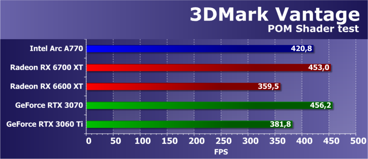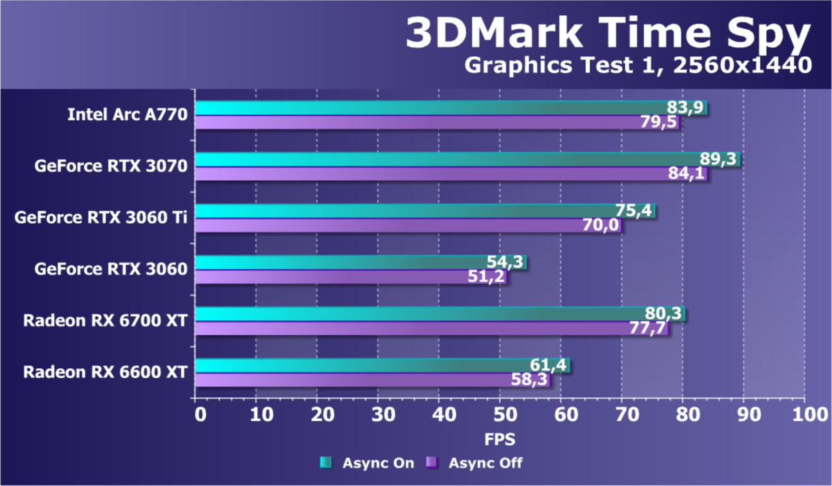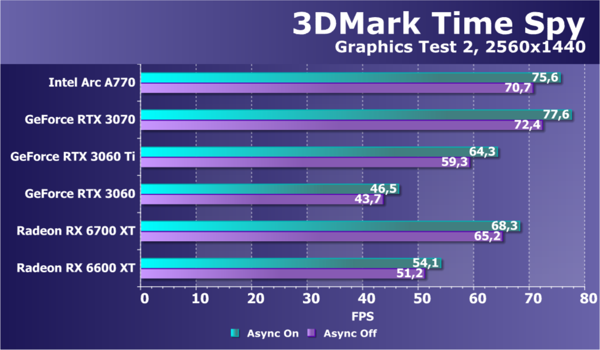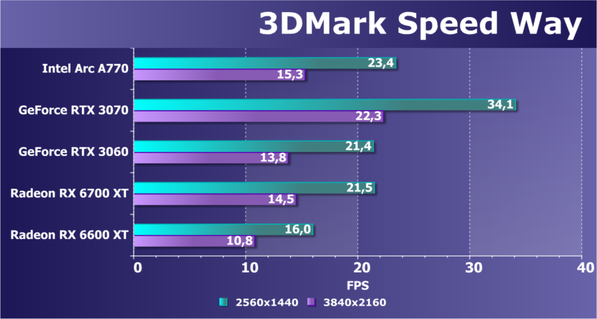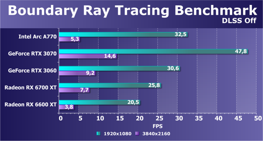 Мы видим, что в классических играх Arc A770 адекватно соперничает с GeForce RTX 3060/Ti, а ожидаемых конкурентов из стана AMD карта Intel явно превосходит. Данные с ручным разгоном A770 мы не стали приводить на диаграммах, но в целом в ряде игр разгон позволяет почти догнать GeForce RTX 3060 Ti.