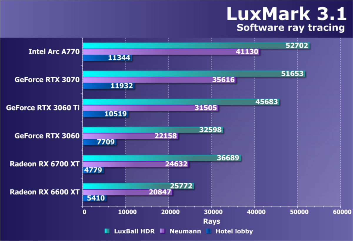 Известно, что блоки трассировки лучей в графической архитектуре Intel имеют некоторый объем кэш-памяти для хранения структур BVH и работают относительно быстро — как минимум, по сравнению с Radeon. Если RT-блок в архитектуре RDNA 2 способен находить одно пересечение луча с треугольником за такт или четыре пересечения с боксом BVH, то блок трассировки Intel — уже 12 пересечений. Nvidia говорит о том, что RT-ядро в чипах архитектуры Turing рассчитывает одно пересечение с треугольником за такт, а Ampere — два. Недавно вышли старшие решения архитектуры Ada Lovelace, в которых еще раз удвоили скорость поиска пересечений луча с треугольником, но тут Intel пока что бояться нечего — топовые видеокарты GeForce RTX 40 не являются конкурентами для Arc A770. А вот по сравнению с видеокартами архитектуры RDNA 2 решение Intel явно должно быть производительнее — даже по пиковой производительности, хотя на практике важнее эффективность вычислений в реальных условиях, а не теоретический максимум, и тут Intel есть чем похвастать.