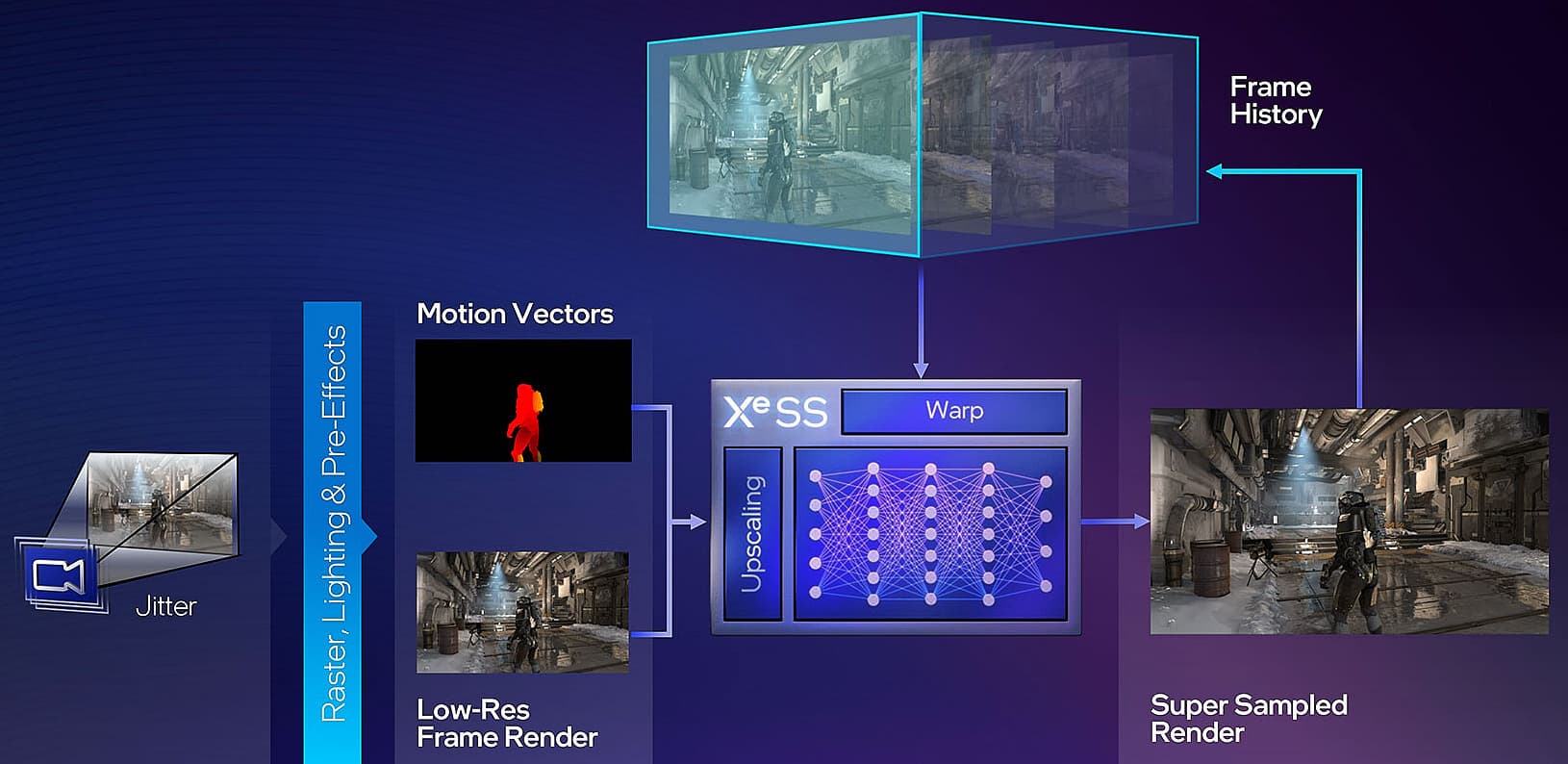 Для чего может понадобиться такая мощь в игровых решениях? При недостатке производительности при трассировке лучей можно использовать аппаратно ускоренное шумоподавление с применением искусственного интеллекта, аналогичное тому, что делает Nvidia при помощи тензорных ядер — у Intel для этого же могут применяться матричные движки XMX. Но это еще в основном дело будущего, а прямо сейчас можно использовать их мощь для технологии увеличения производительности, аналогичной DLSS 2. Intel решила реализовать собственную технологию масштабирования разрешения на основе машинного обучения, разработав для этого свой вариант под названием XeSS.