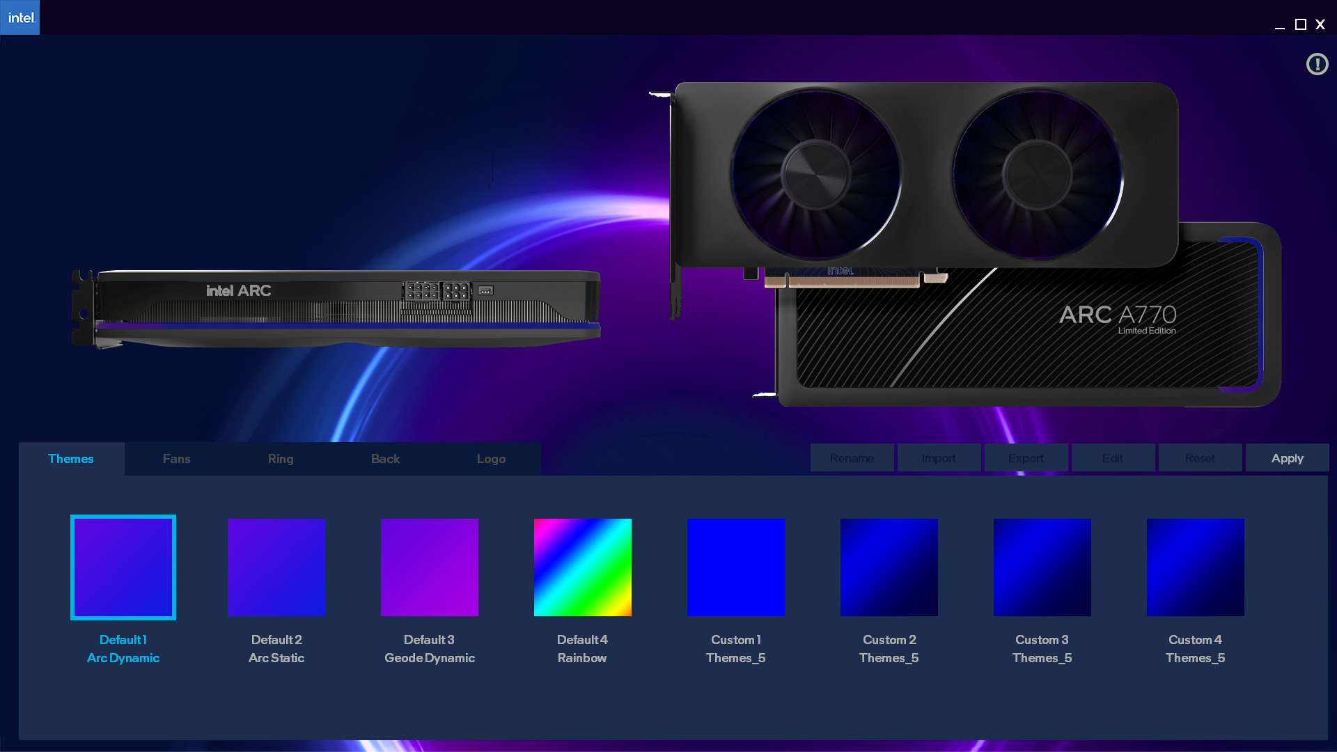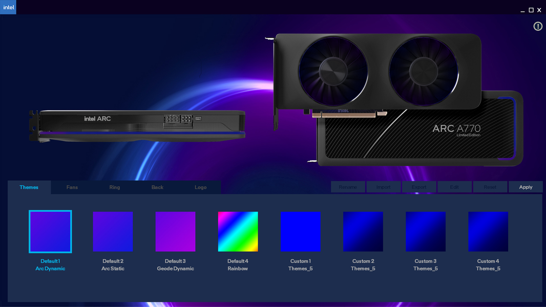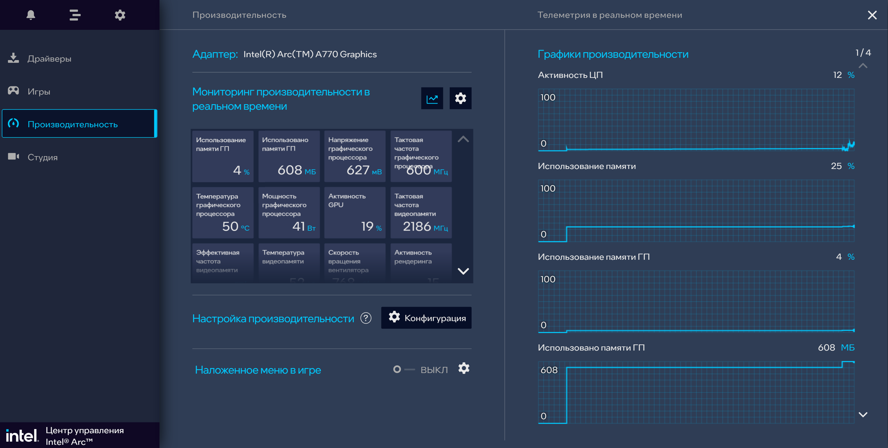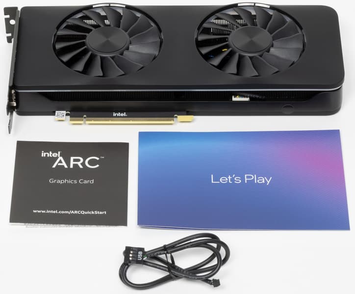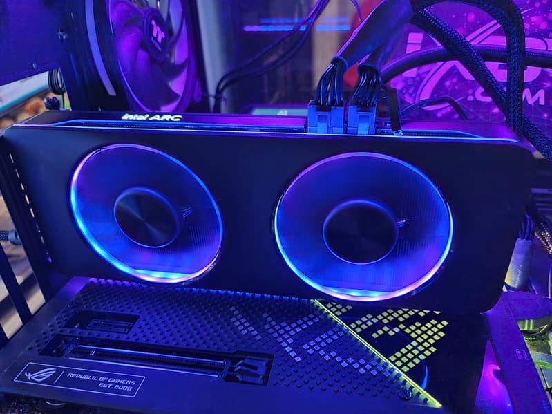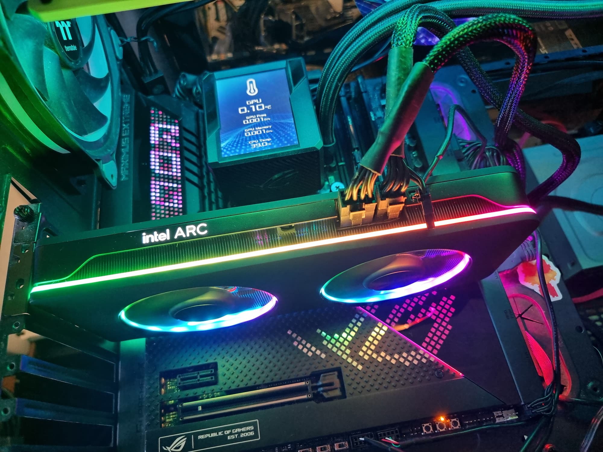 Конкретная протестированная нами карта Intel Arc A770 Limited Edition (16 ГБ) обладает довольно компактными размерами, занимая всего 2 слота в системном блоке. Карта имеет 2 разъема питания (8- и 6-контактный), стандартный набор видеовыходов, но с поддержкой более современных версий стандартов (три DP 2.0 и один HDMI 2.1). Отметим тихую и довольно эффективную систему охлаждения, вентиляторы которой, однако, почти не выключаются в простое. Подсветка придает карте оригинальности, хотя мы не привыкли к тому, что для этого требуется подключать дополнительный USB-кабель.