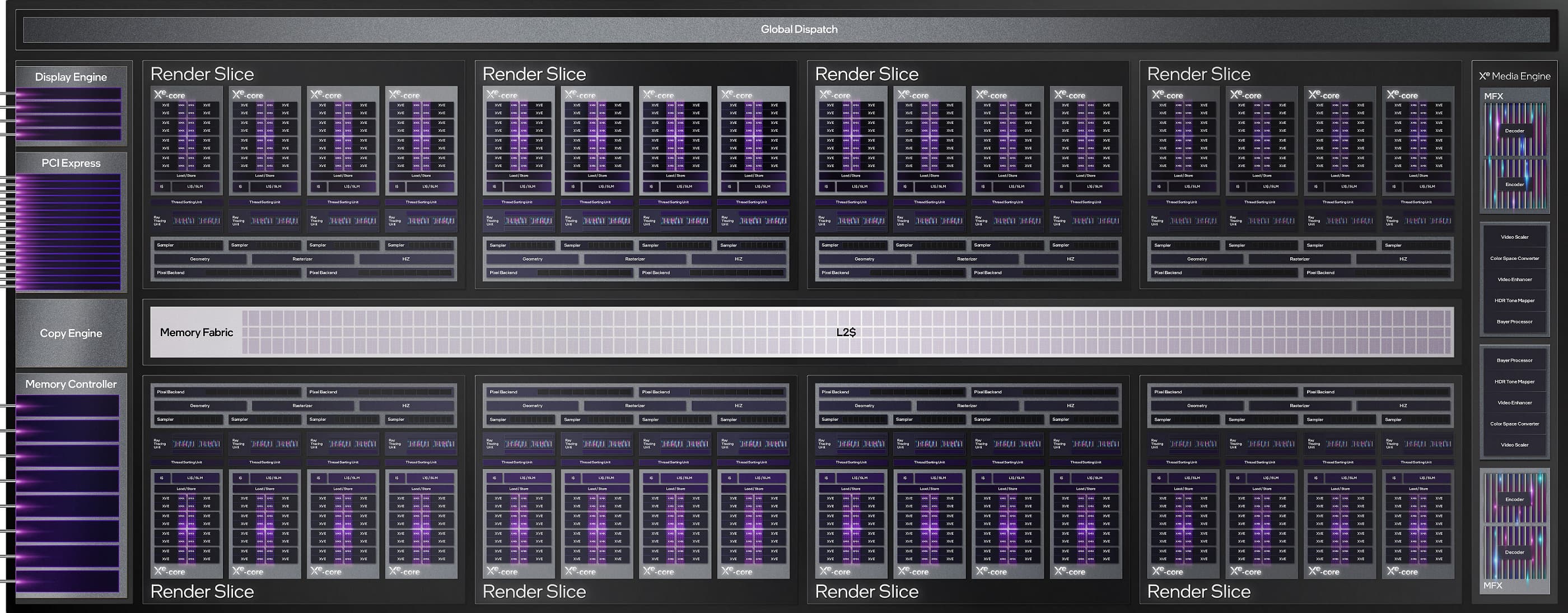 Каждый такой раздел содержит по четыре Xe-ядра, по четыре блока трассировки лучей, движки обработки геометрии, 32 блоков текстурирования, 16 блоков ROP и т. п. За счет разного количества таких разделов в разных моделях GPU компания Intel масштабирует свои решения от интегрированных до используемых в высокопроизводительных вычислениях. Так можно создавать графические процессоры разного класса, к ним нужно лишь добавить управляющую логику, шину памяти, кэш-память второго уровня и прочее: видеодвижок, контроллер дисплея и другие блоки. Вот из восьми таких разделов Render Slice и собрали чип ACM-G10, ранее известный как DG2-512.