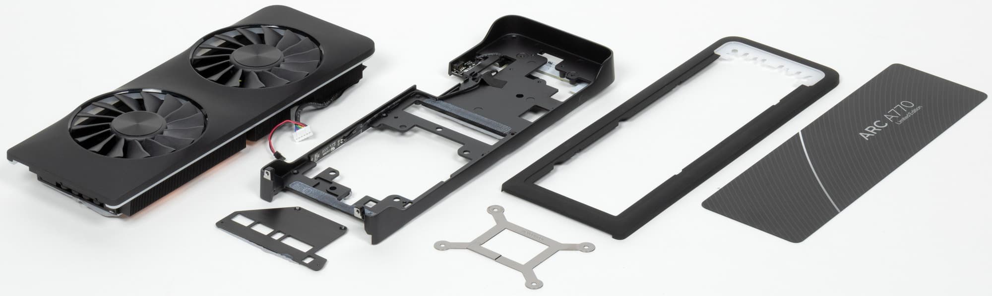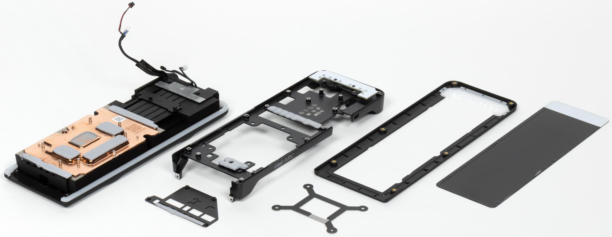Модель Arc A770 использует полную версию чипа, которая имеет восемь блоков Render Slice и 32 Xe-ядра, включающие 4096 шейдерных блоков, 256 блоков текстурирования TMU и 128 блоков растеризации ROP. Кроме него, в линейке есть еще ACM-G11 (DG2-128), на котором основаны видеокарты Arc 3, а старший чип ACM-G10 служит основой и для Arc 5, и для Arc 7. Оба графических процессора производятся по техпроцессу N6 на фабриках TSMC — это техпроцесс 7 нм, но с чуть улучшенными характеристиками по сравнению с 7-нанометровым техпроцессом, по которому производятся графические процессоры Radeon.