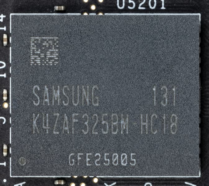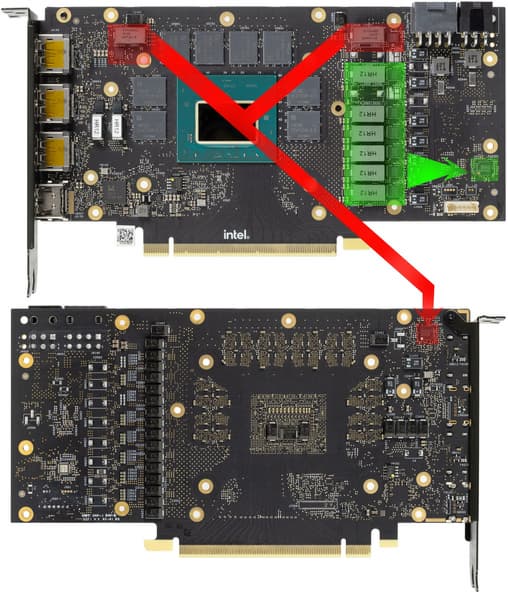 Такое решение помогает сгладить требования к пропускной способности видеопамяти. Которая у старшего чипа, впрочем, и без того достаточно высока: при 256-битной шине памяти и объеме видеопамяти 8 или 16 ГБ она составляет 512 ГБ/с и 560 ГБ/с для пары Arc A770. Это очень прилично для данного ценового диапазона. В младшей модели с 8 ГБ памяти используются другие чипы GDDR6-памяти — с эффективной частотой в 16 ГГц против 17,5 ГГц у старшей, но обе модификации имеют полноценную 256-битную шину памяти. Ну а потенциальным плюсом старшего варианта на перспективу является то, что он имеет 16 ГБ локальной памяти, тогда как GeForce RTX 3060 Ti и Radeon RX 6600 XT довольствуются лишь 8 ГБ, что в редких случаях уже может ограничивать производительность.