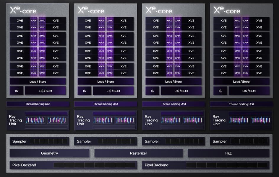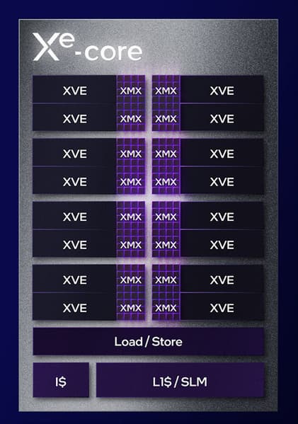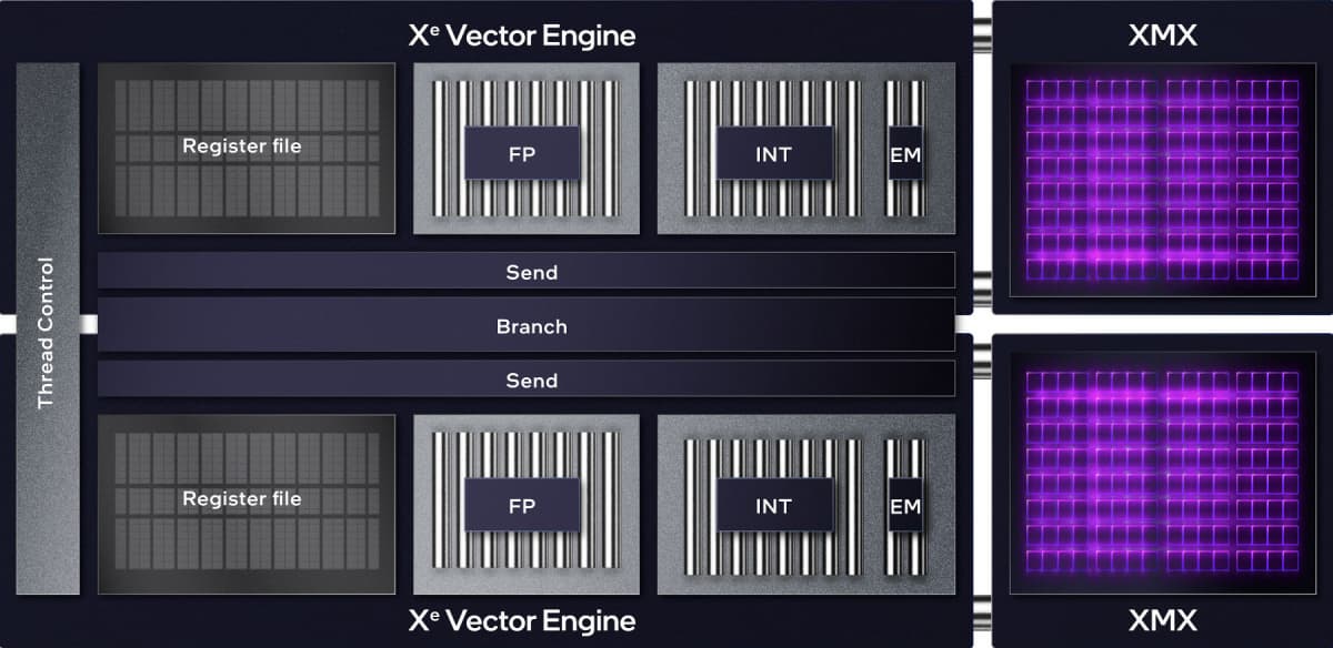 Xe-ядро по строению схоже с мультипроцессором SM у Nvidia и аналогичным процессором WGP у AMD — все они имеют собственную локальную память и кэш инструкций и служат минимальными блоками при построении GPU. SM и WGP разделены на четыре раздела, каждый из которых имеет свой планировщик и регистровый файл для работы 32 линий FP32. Xe-ядро Intel также имеет 128 линий FP32, но делит их уже на 16 разделов, называемых векторными движками — Xe Vector Engine (XVE).