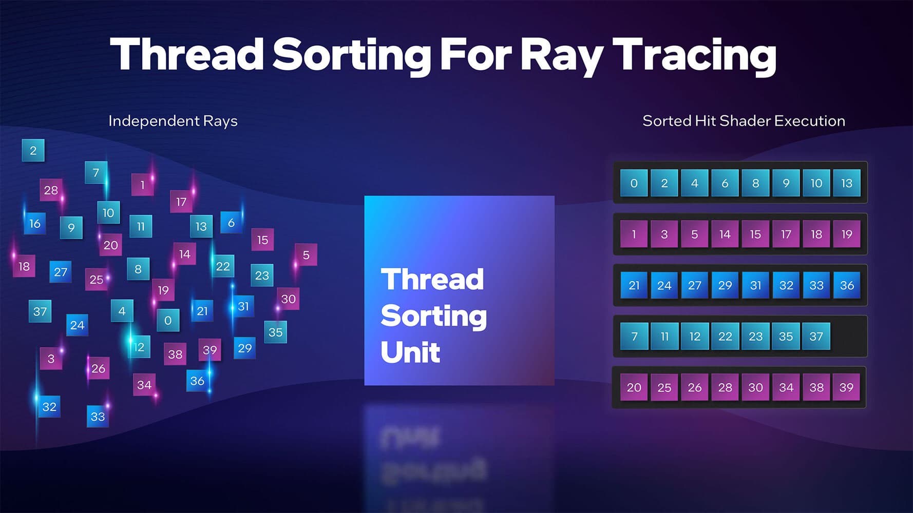 Видимо, в Intel применили более продвинутую управляющую логику, они даже называют свою архитектуру аппаратной трассировки асинхронной. В новом GPU отдельный блок для анализа и сортировки потоков шейдеров занимается переупорядочиванием (реорганизацией) шейдеров для более полного использования возможностей шейдерных блоков SIMD и более эффективного исполнения трассировки лучей в итоге. Как это будет работать на практике — сегодня узнаем.