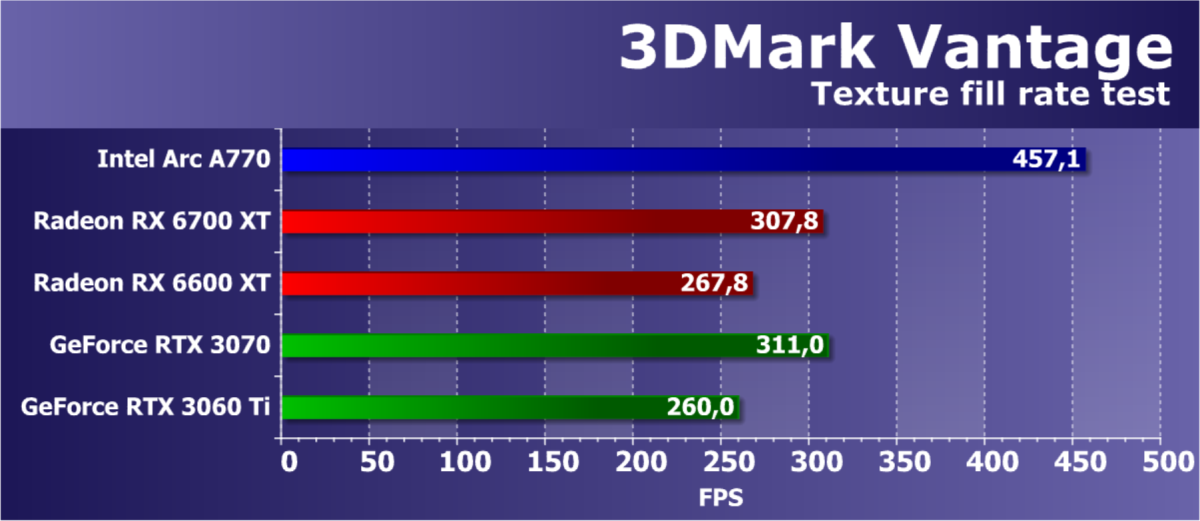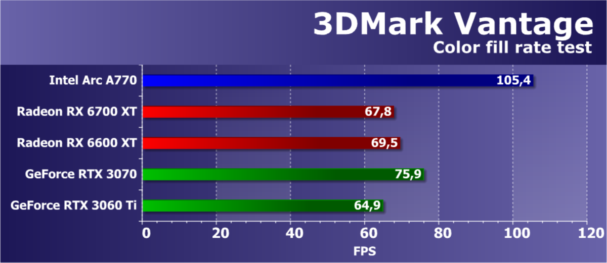 Для анализа производительности видеокарты Arc A770 мы взяли по несколько моделей от обеих компаний, конкурирующих с Intel. Во-первых, от Nvidia мы выбрали GeForce RTX 3060 (GA106), как конкурента по рекомендованной цене (хотя по реальным розничным дела обстоят несколько иначе), но так как в синтетических тестах нам интересны не только ценовые соперники, но и примерно равные GPU по сложности и площади кристалла, то добавили к ней еще и парочку GeForce на более сложном чипе GA104 с разной степенью урезанности: RTX 3060 Ti и RTX 3070.