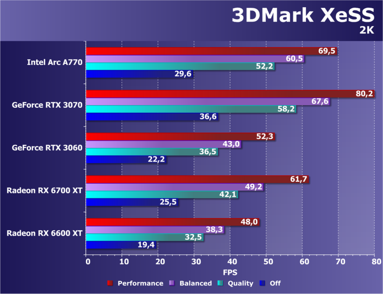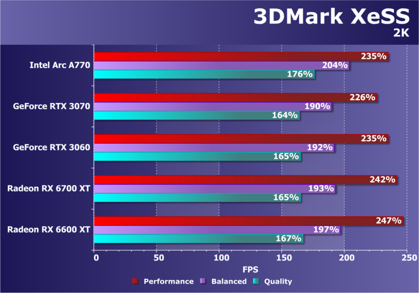 Падение производительности от использования трассировки лучей у карты Intel примерно такое же, как у RTX 3060 Ti (с учетом DLSS/FSR/XeSS). Но все же положение у RTX 3060 Ti немного лучше, так как DLSS имеет более высокий КПД. В целом скажем, что карта Intel прекрасно годится для игры в разрешении Full HD с максимальными настройками, включая и трассировку лучей, если задействовать одну из технологий масштабирования. Поддержку собственной технологии Intel — XeSS — пока найти можно лишь в паре игр, в нашем списке таковых нет.