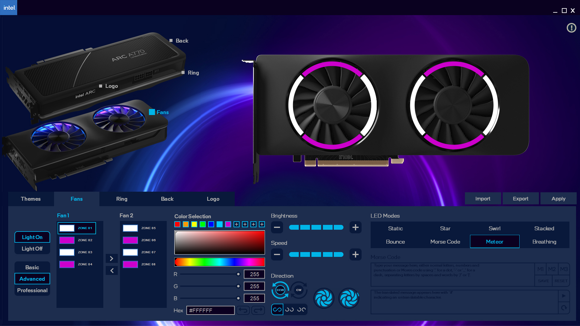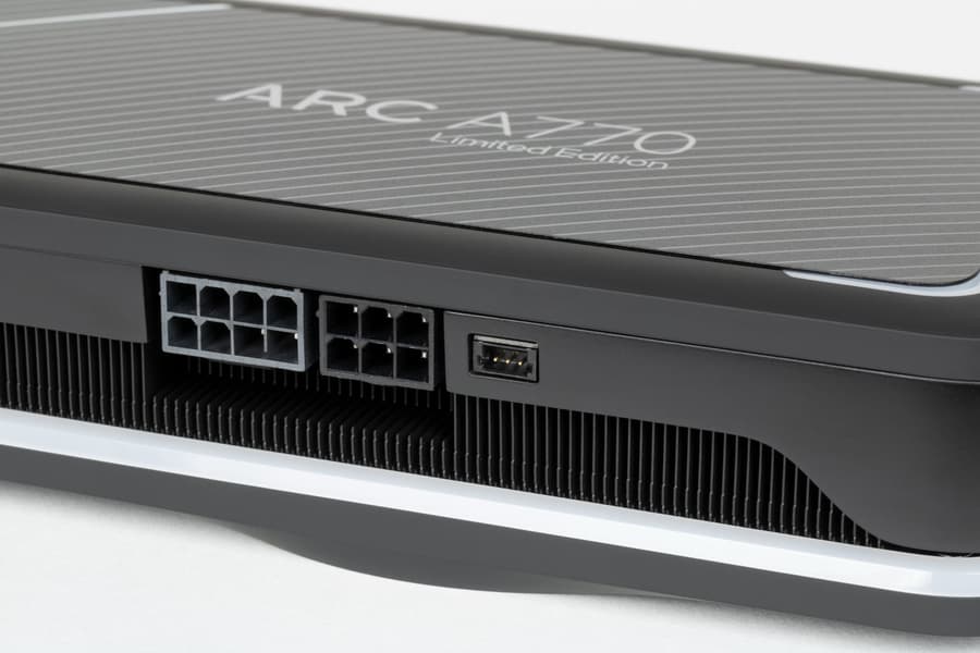 Модель Arc A770 предлагается рынку в варианте самой Intel — в виде видеокарты специального издания Limited Edition, которую мы сегодня как раз и рассматриваем. Правда, речь только о старшей модели с 16 ГБ, младшей 8-гигабайтной в таком дизайне нет. Для своей видеокарты инженеры компании Intel разработали строгий дизайн с аккуратной RGB-подсветкой. Для питания карты модели A770 Limited Edition используется два разъема: 8-контактный и 6-контактный, что вместе с возможностями питания по разъему PCIe составляет ровно те 225 Вт, что заявлены в качестве максимального энергопотребления видеокарты. К слову, это не так уж мало на фоне 160-180 Вт у основных конкурентов.