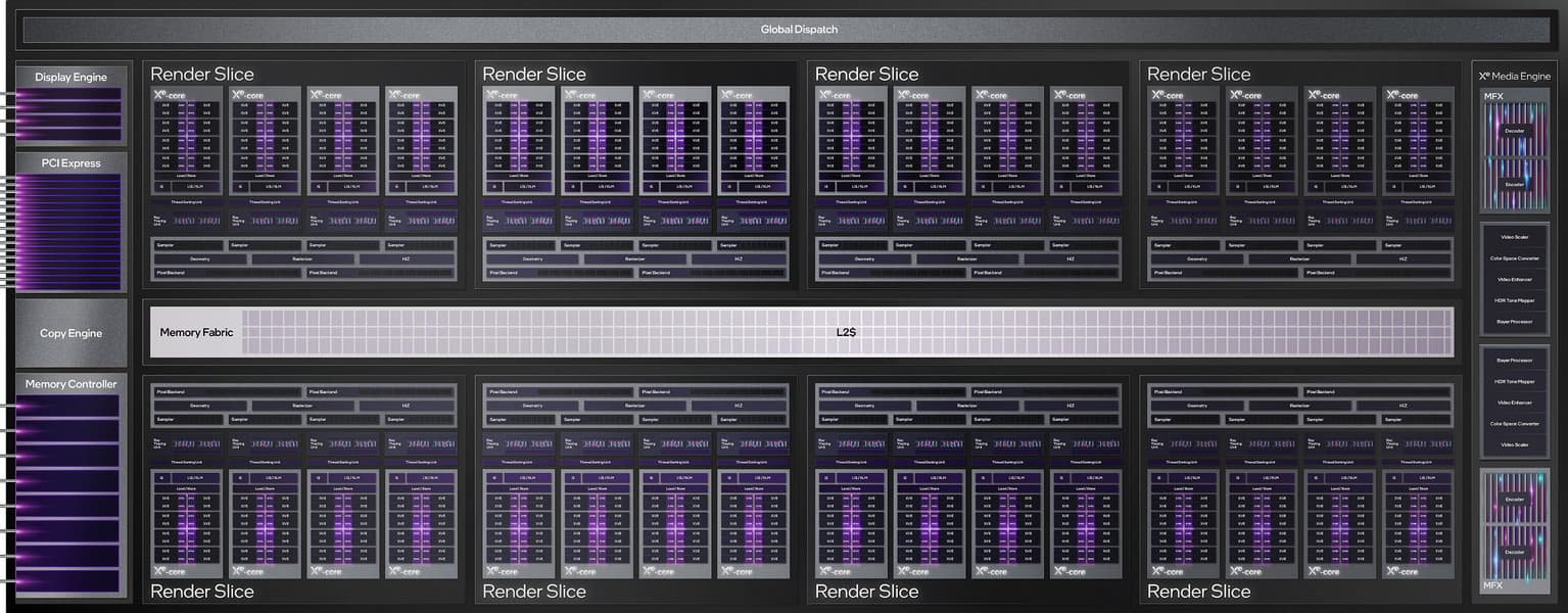 Самым большим графическим процессором Alchemist стал чип ACM-G10, на котором основаны модели видеокарт A770 и A750. Структурно чипы архитектуры Xe-HPG схожи с тем, как построены решения Nvidia. Аналогично кластерам GPU в чипах Nvidia, в архитектуре Intel несколько ядер собраны в верхнеуровневый блок организации, называемый Render Slice — каждый из них содержит всё необходимое для независимых вычислений, включая сами вычислительные блоки, текстурные модули, блоки аппаратной трассировки лучей, обработки геометрии и растеризации.