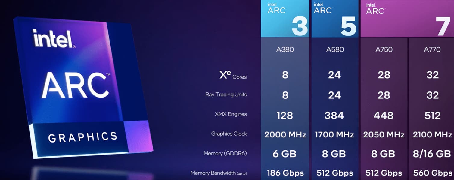 В семействе настольных видеокарт Arc «Alchemist» топовой является серия Arc 7, в нее входит две модели: Arc A750 и Arc A770. Обе они основаны на графическом процессоре ACM-G10, но A770 использует полную версию этого чипа с 32 ядрами Xe, а в A750 активны лишь 28 из 32 ядер. Обе модели функционально идентичны, предлагают поддержку DirectX 12 Ultimate и XeSS и ориентированы на пользователей, играющих в разрешениях 1080p и 1440p с высокими или максимальными настройками графики. Вероятно, Intel решила целиться в первую очередь именно в средний ценовой сегмент потому, что большинство геймеров покупает видеокарты именно из него.