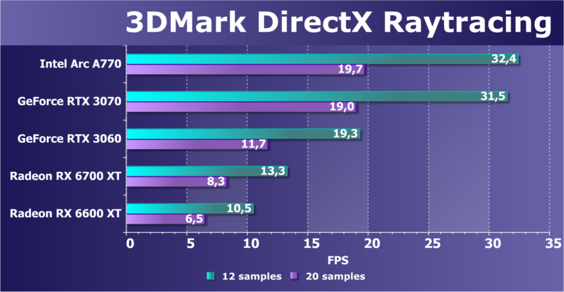 Архитектура Intel Xe-HPG по ускорению трассировки больше похожа на то, что использует Nvidia, причем даже скорее в RTX 40, а не в RTX 30 или RTX 20. В графической архитектуре Intel содержатся выделенные специализированные блоки, занимающиеся поиском пересечения луча и геометрии в иерархической структуре BVH. К каждому Xe-ядру прилагается один блок трассировки, и всего на Render Slice их получается четыре, а в рассматриваемом GPU — 32 штуки. Это близко к количеству соответствующих блоков у конкурирующих GPU AMD и Nvidia: 28 штук у RTX 3060 и 32 штуки у RX 6600 XT. Но Intel заявляет, что с применением трассировки Arc A770 будет ближе к RTX 3060 Ti (38 штук) или даже к RTX 3070 (46 штук), и это мы сегодня проверим.