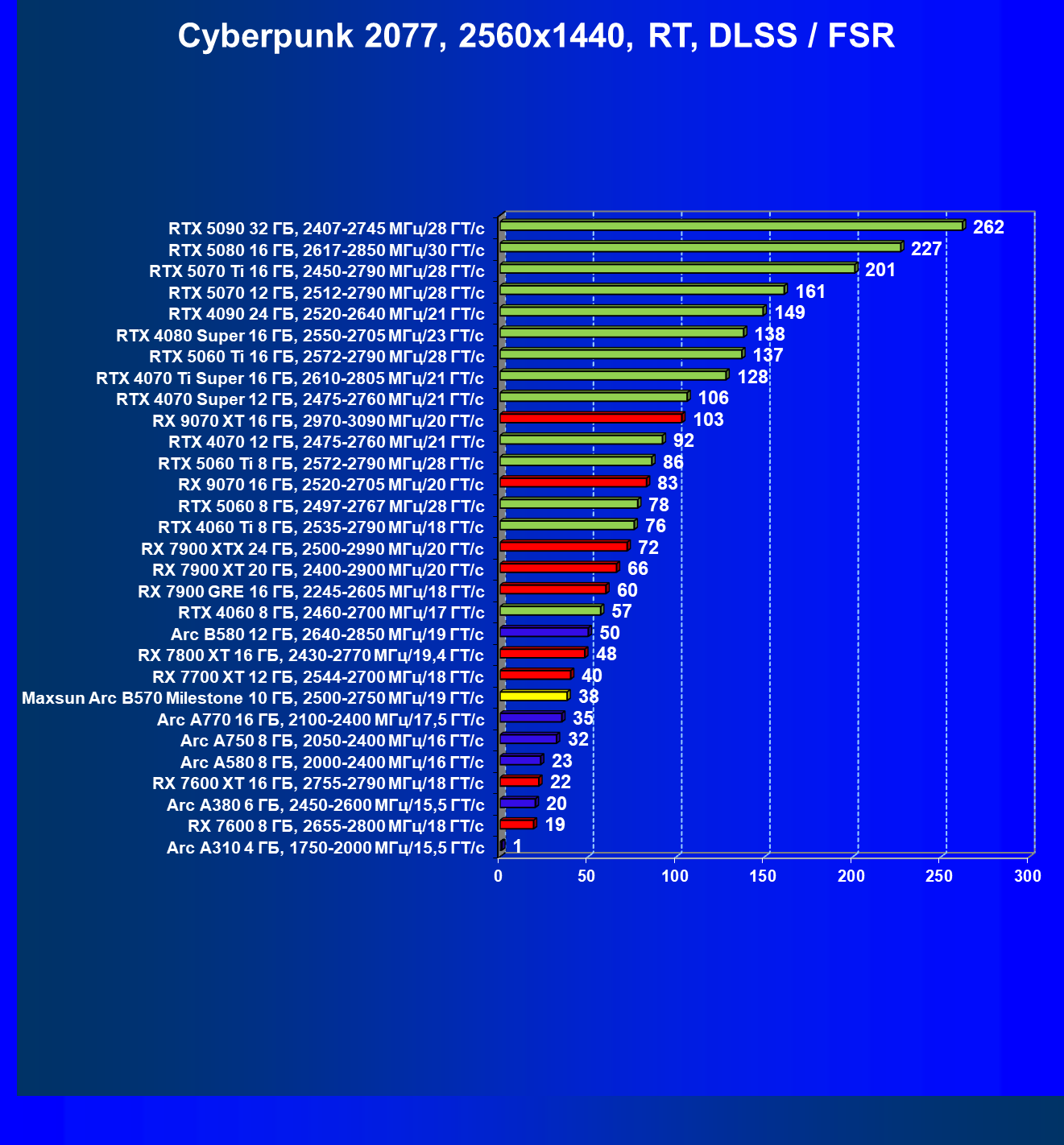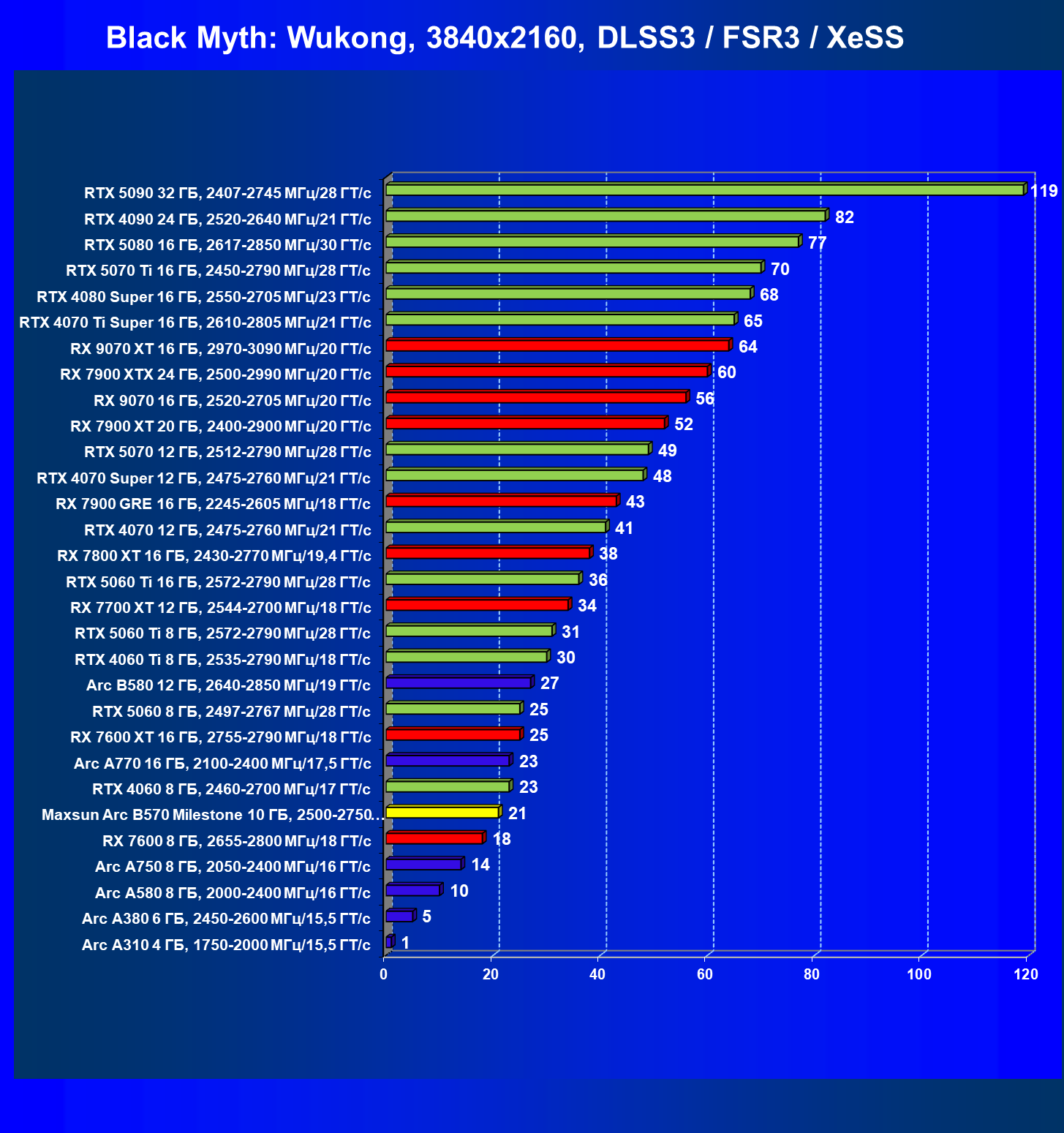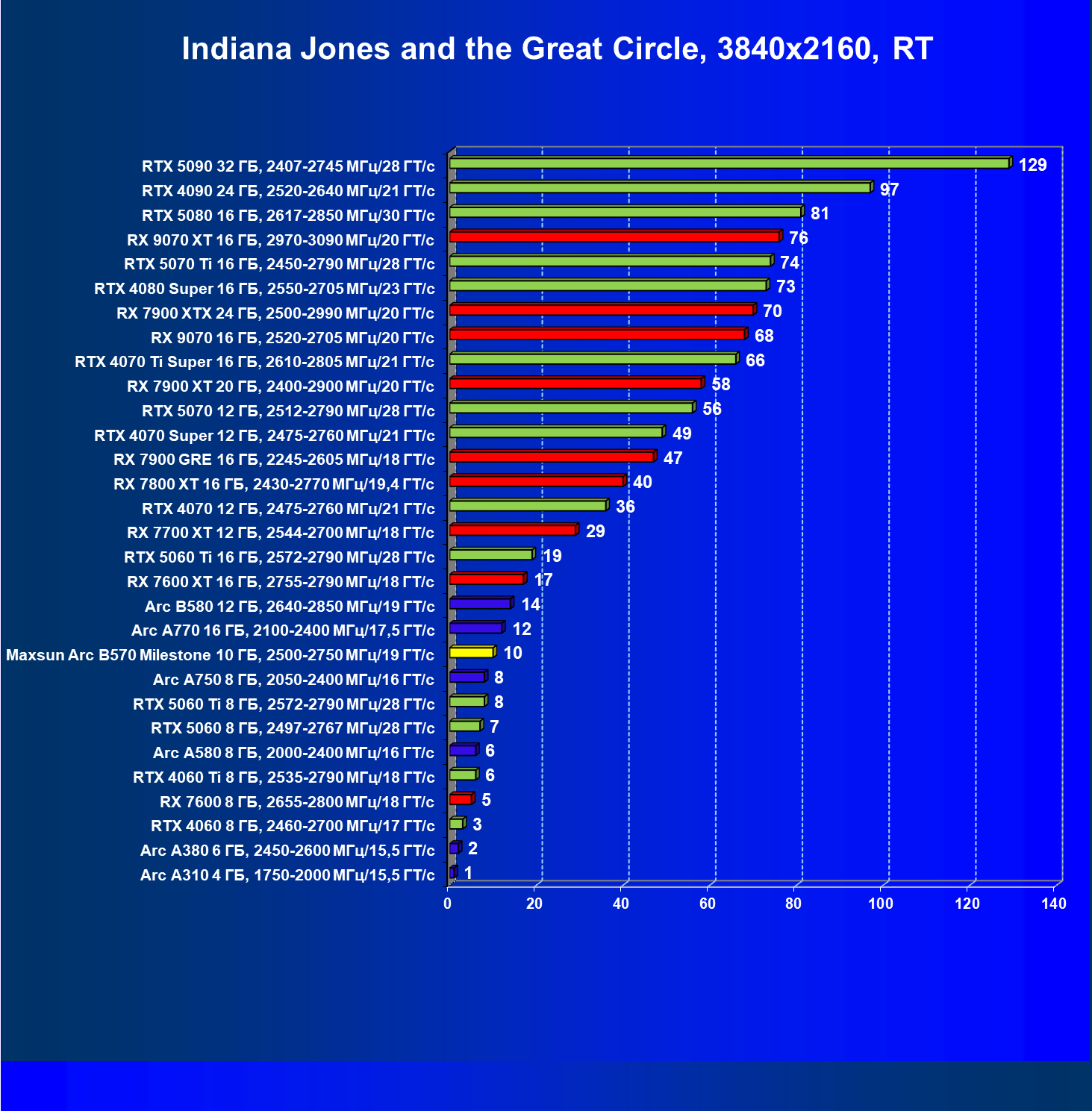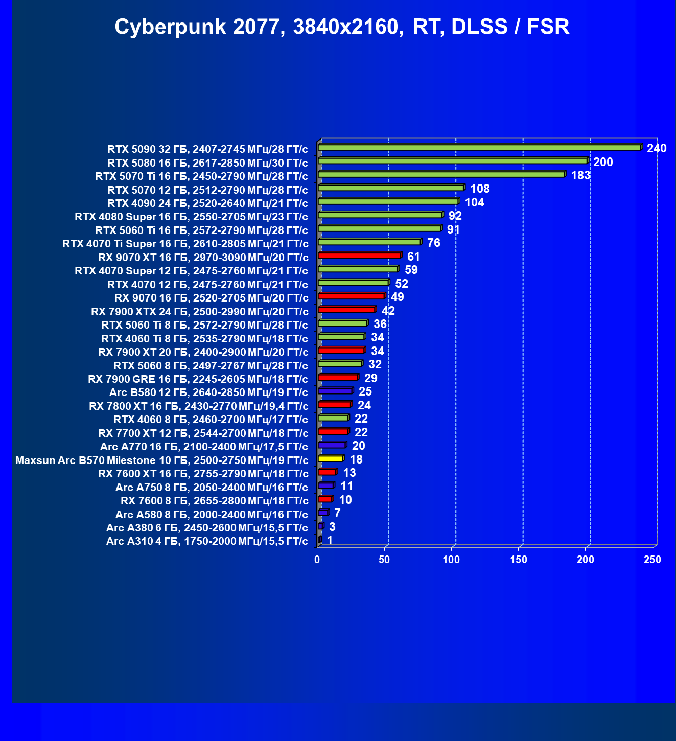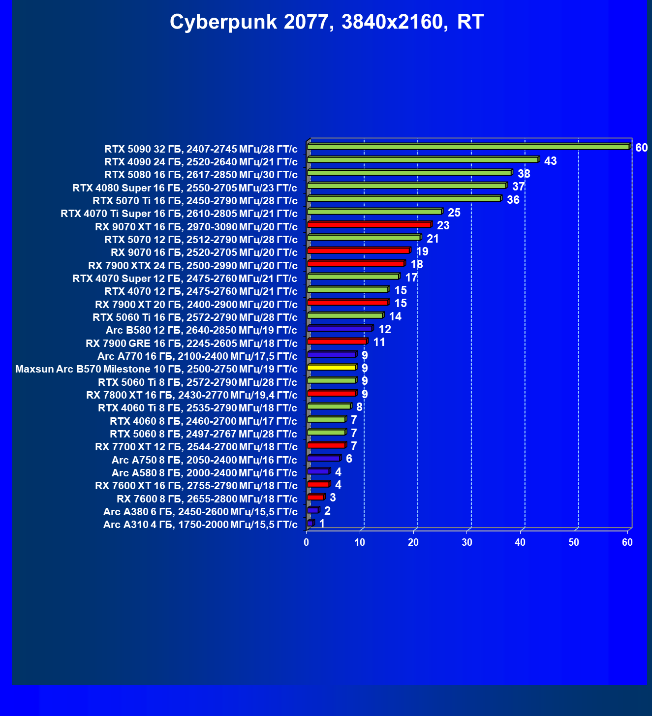 | 09 | Arc B580 12 ГБ, 2640—2850 МГц/19 ГТ/с | 143 | 516 | 36 000 |