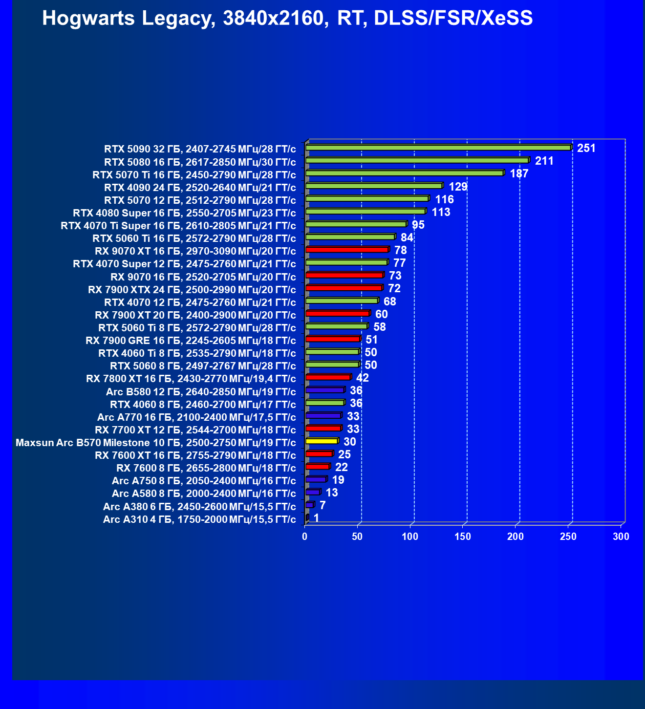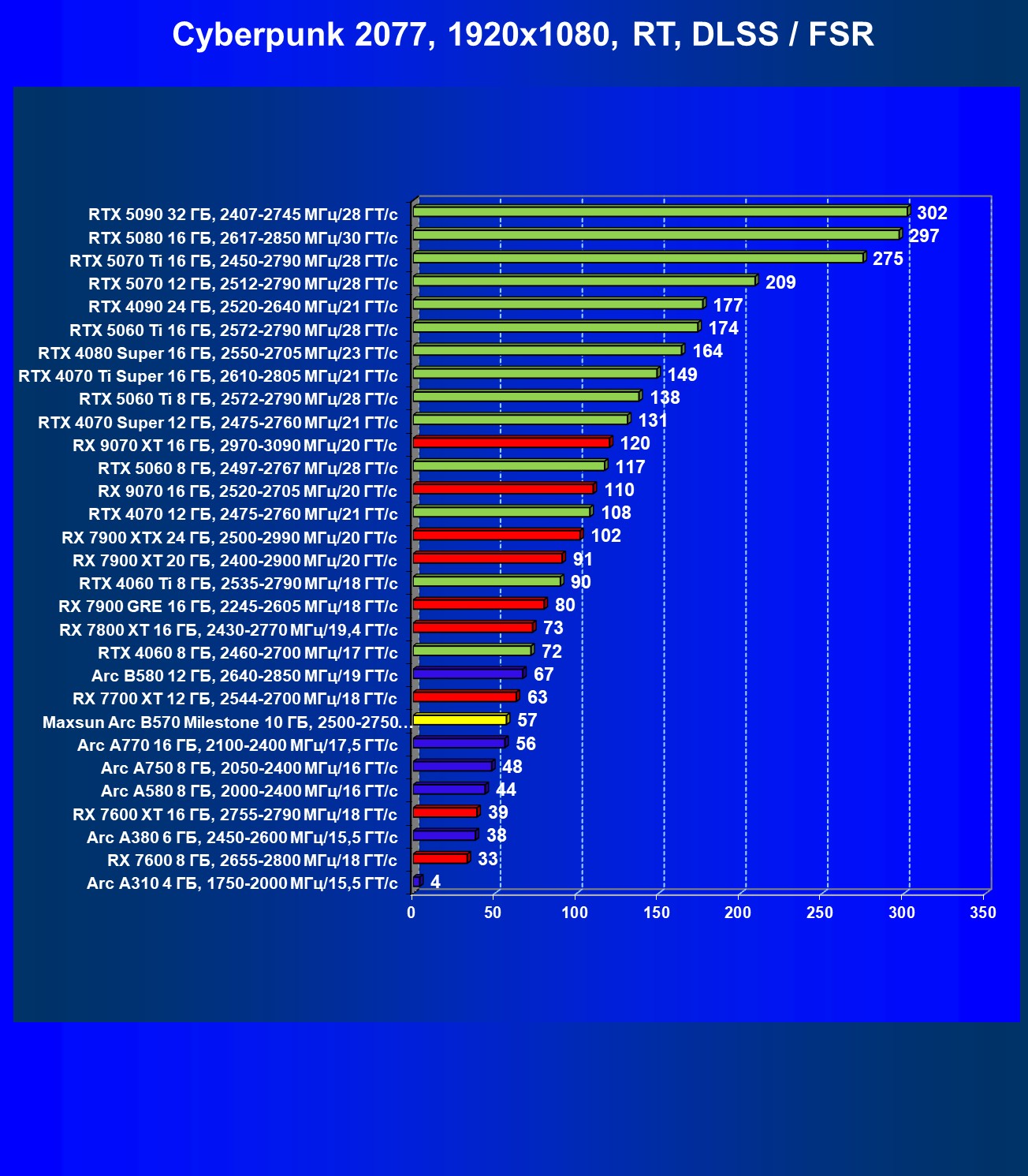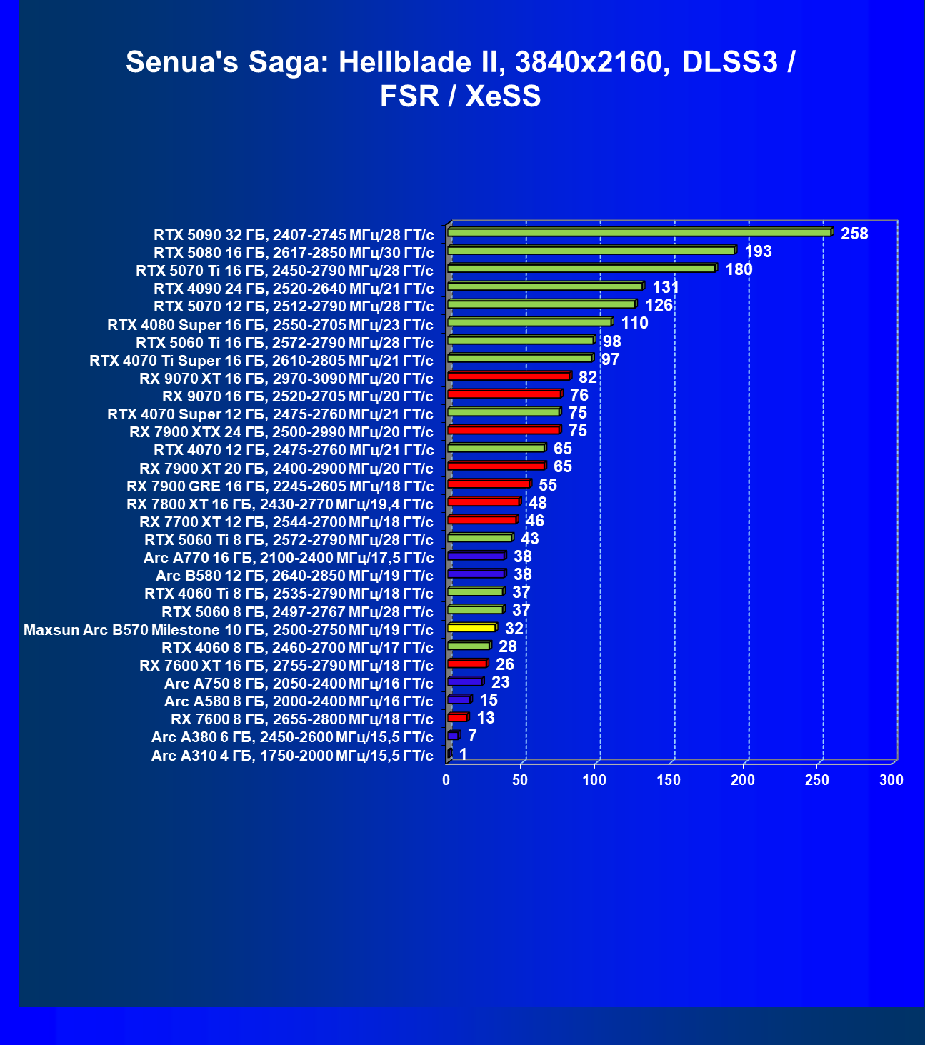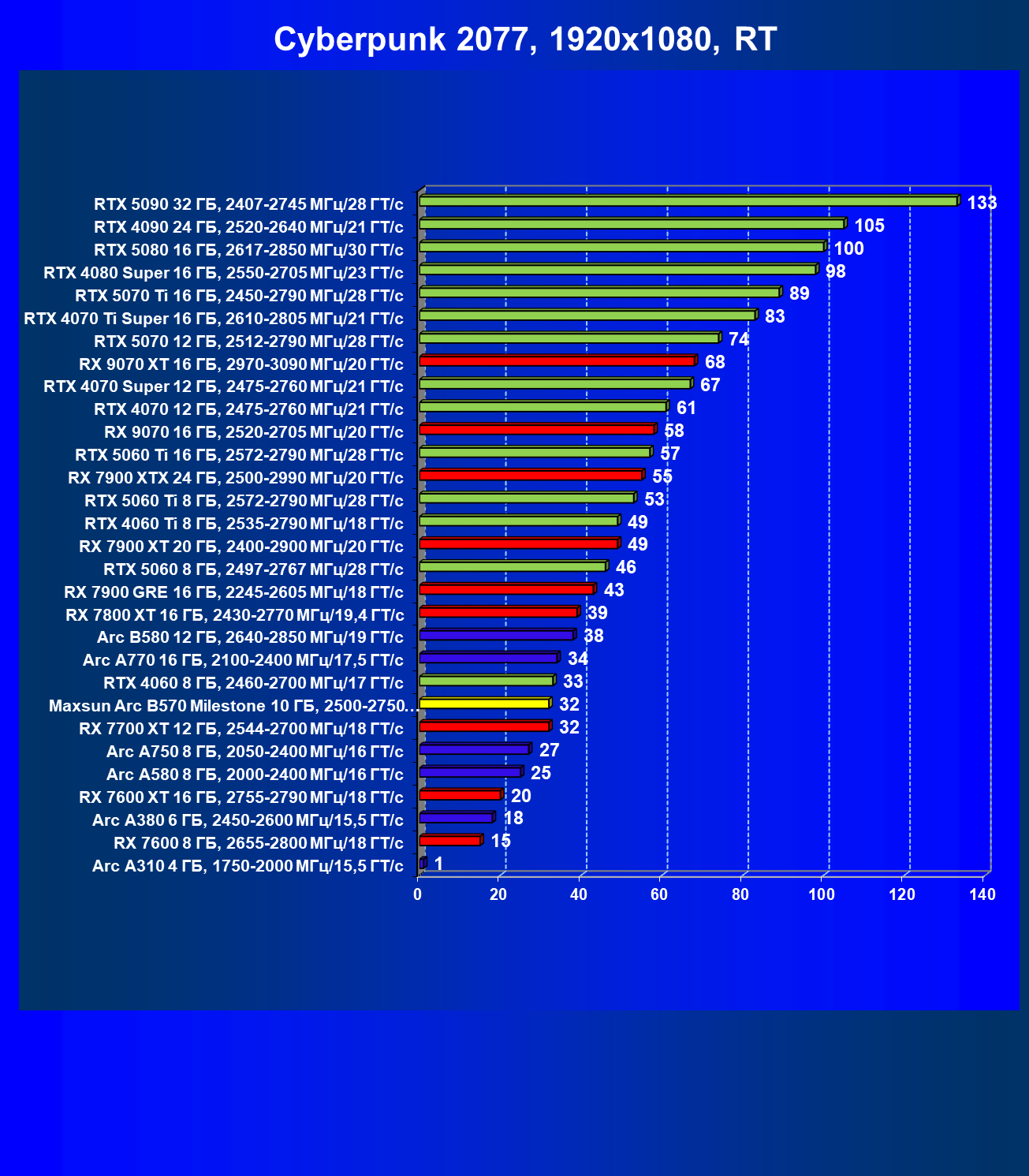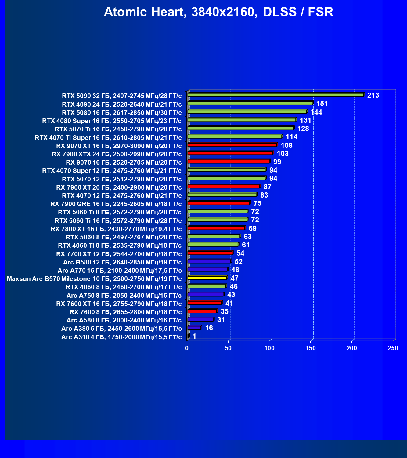 | 09 | Arc B580 12 ГБ, 2640—2850 МГц/19 ГТ/с | 143 | 516 | 36 000 |