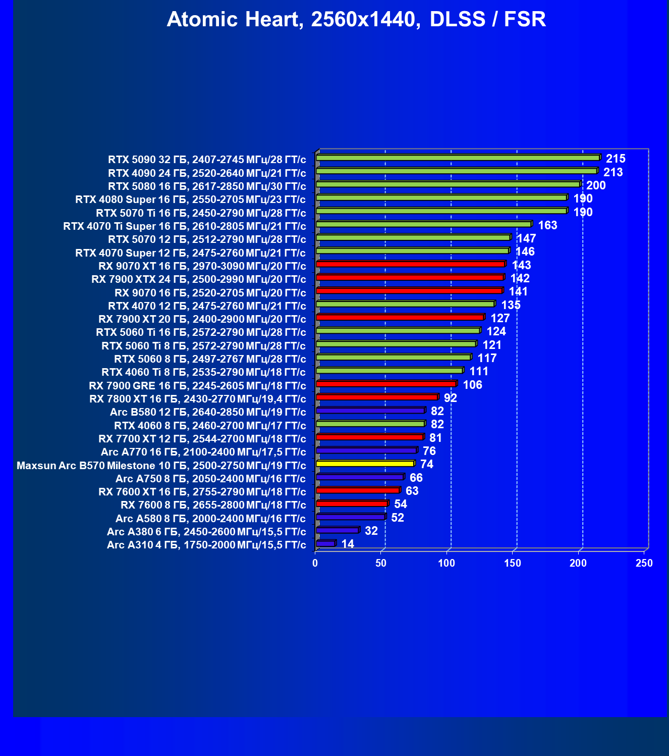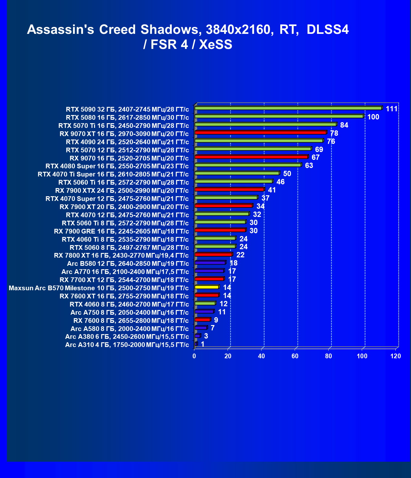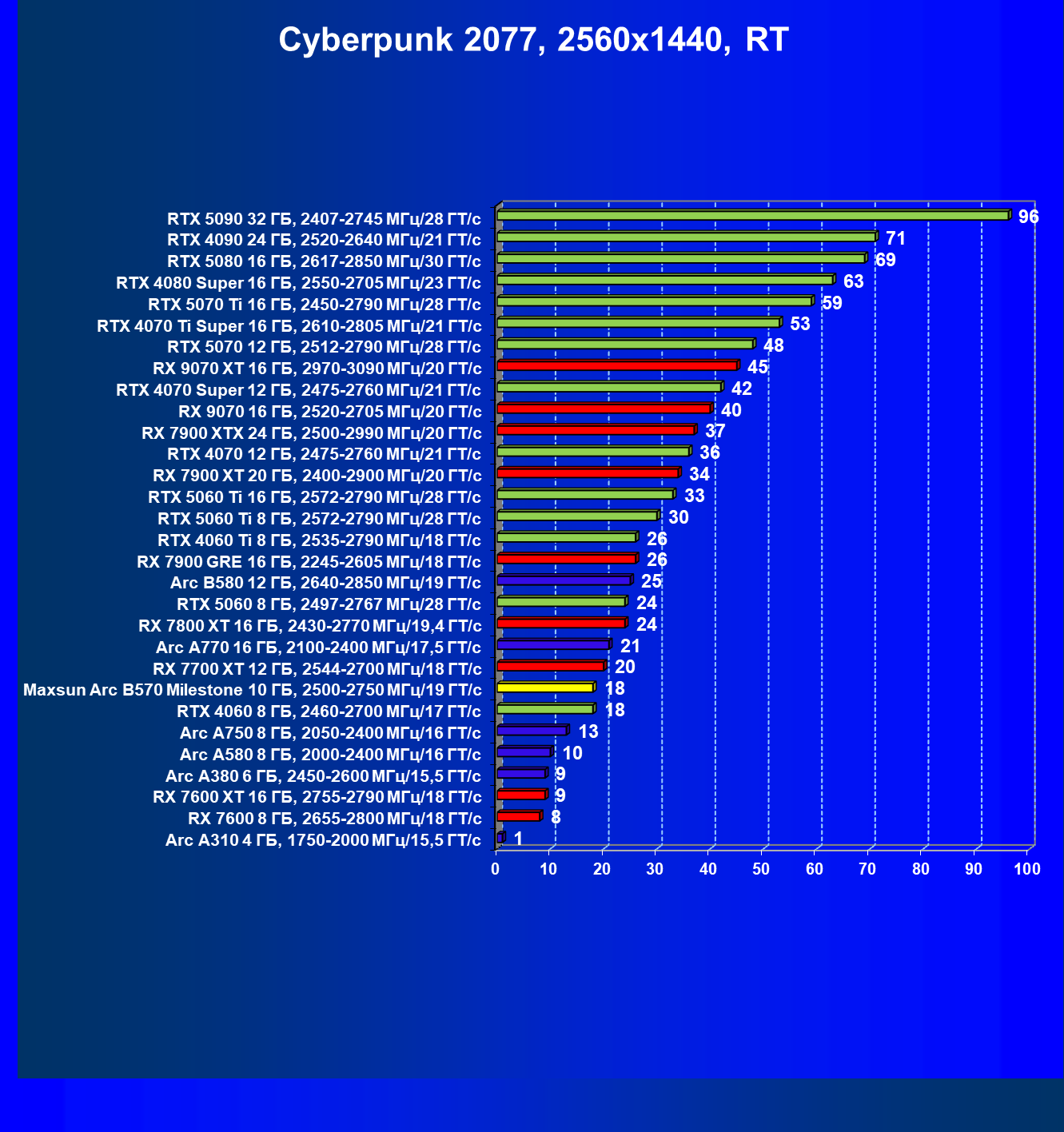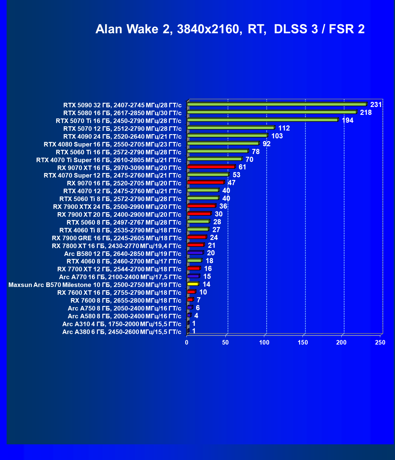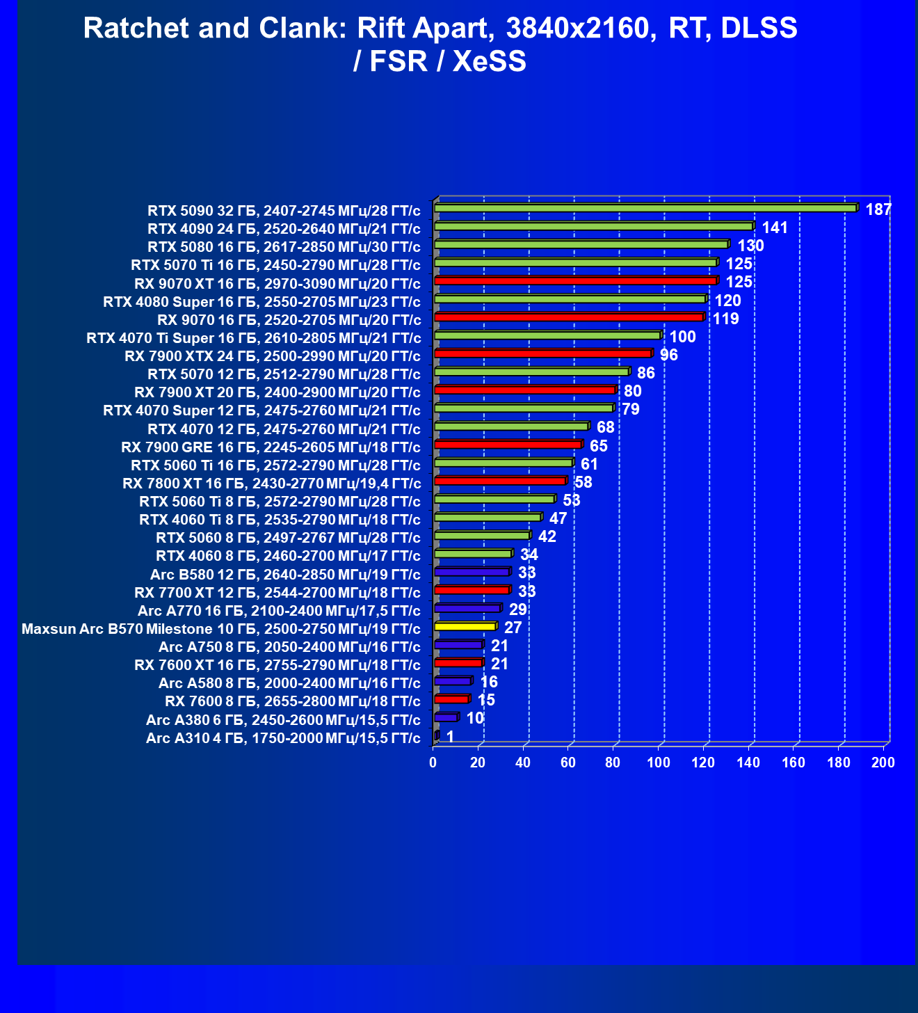 | 09 | Arc B580 12 ГБ, 2640—2850 МГц/19 ГТ/с | 143 | 516 | 36 000 |