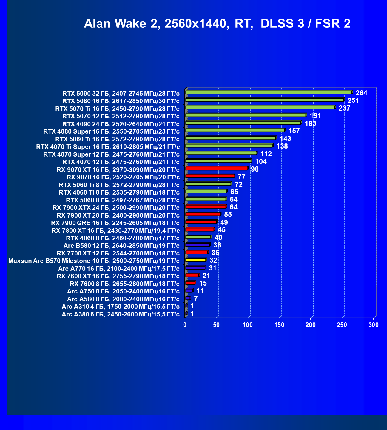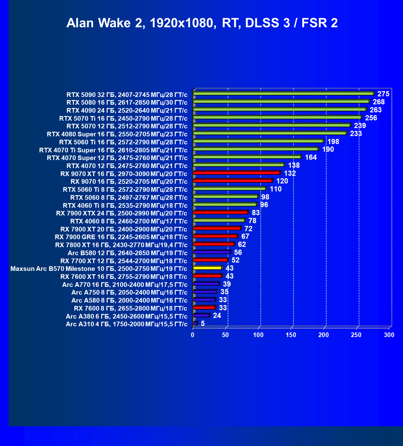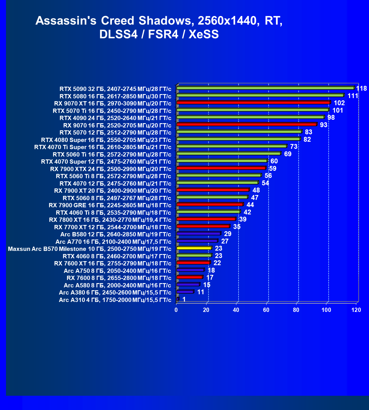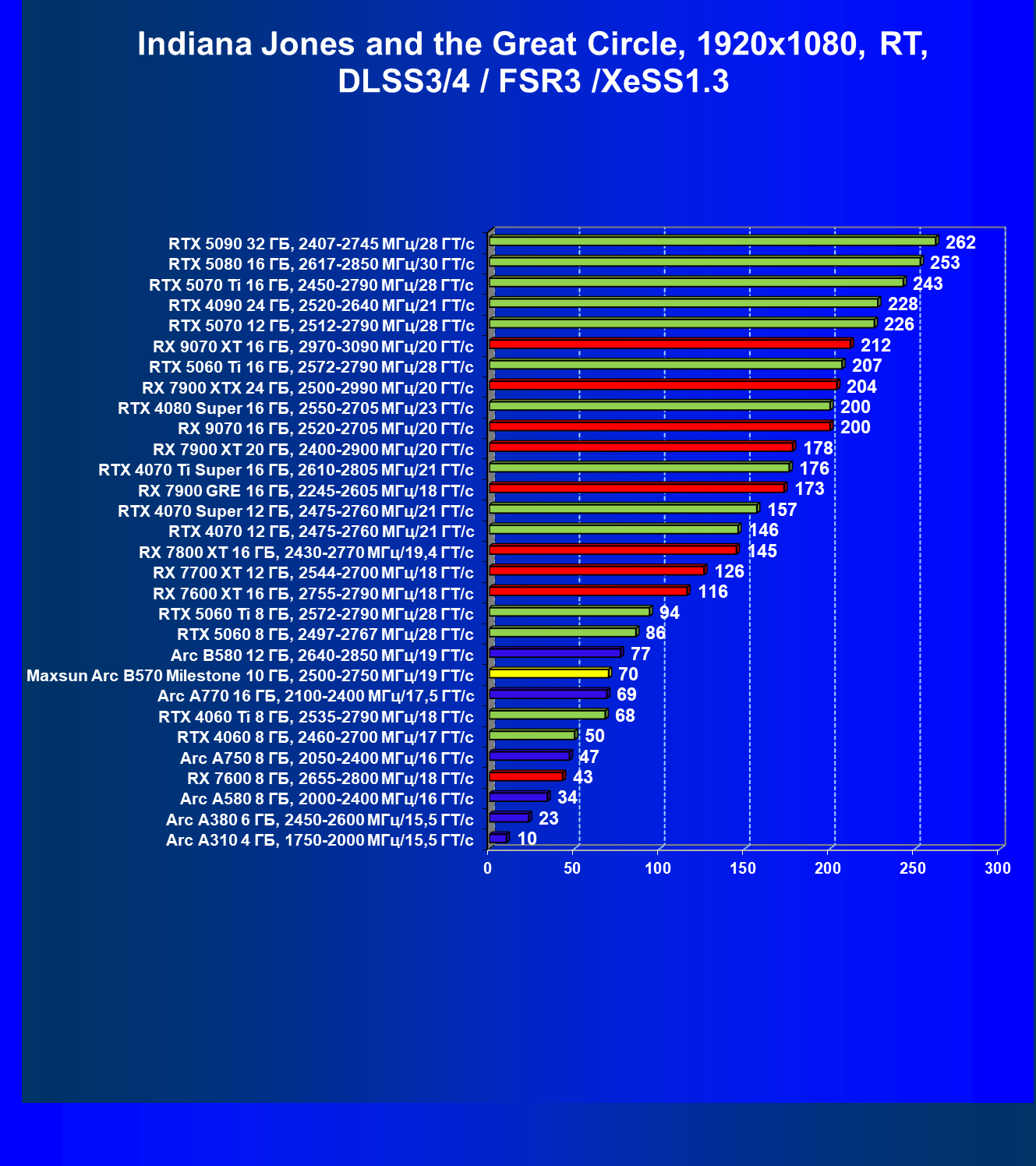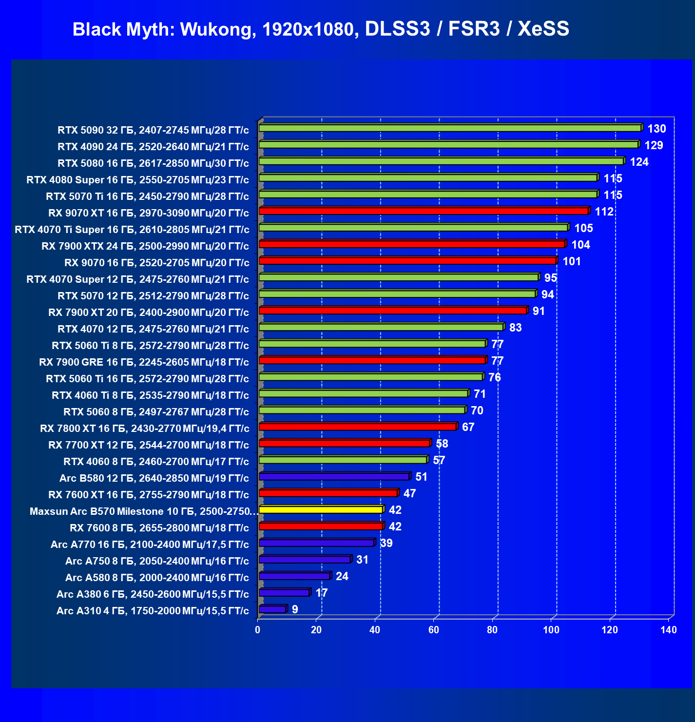 | 09 | Arc B580 12 ГБ, 2640—2850 МГц/19 ГТ/с | 143 | 516 | 36 000 |