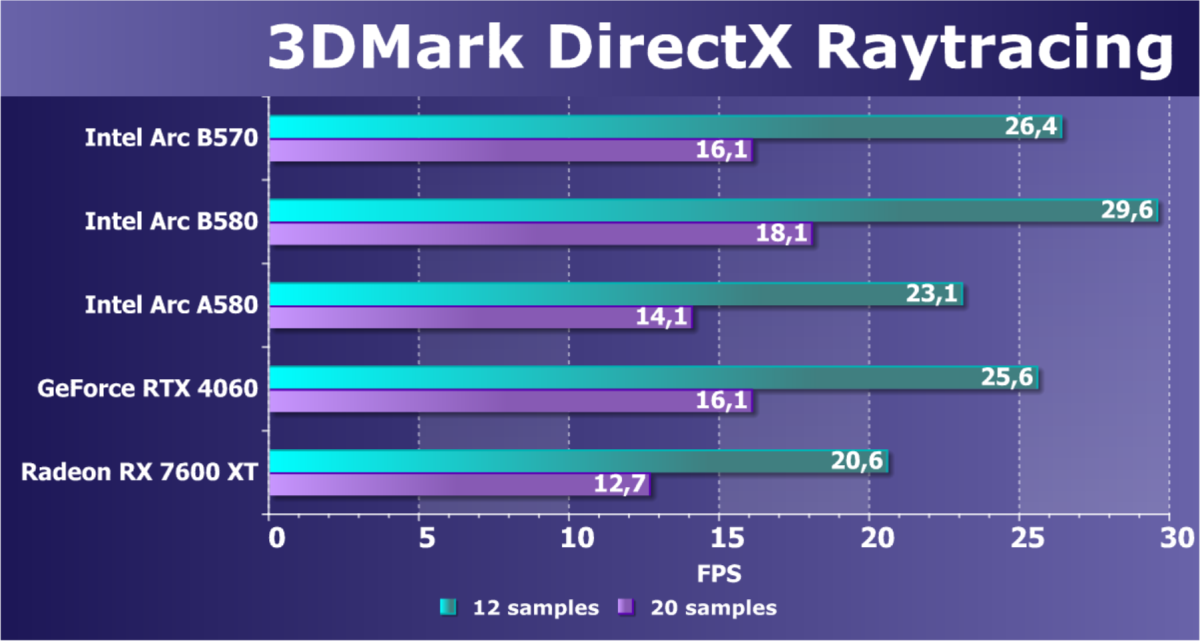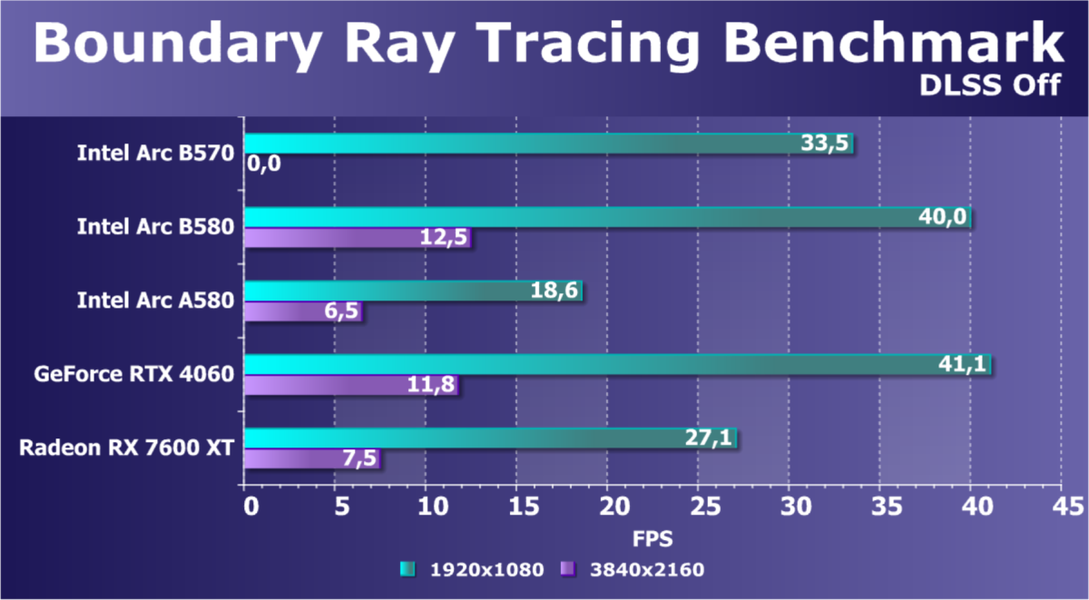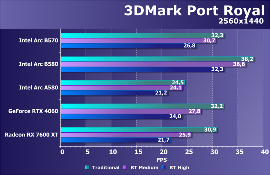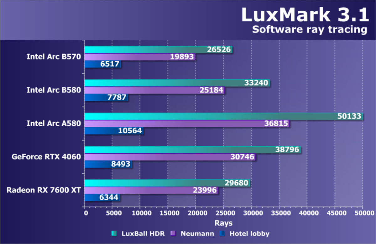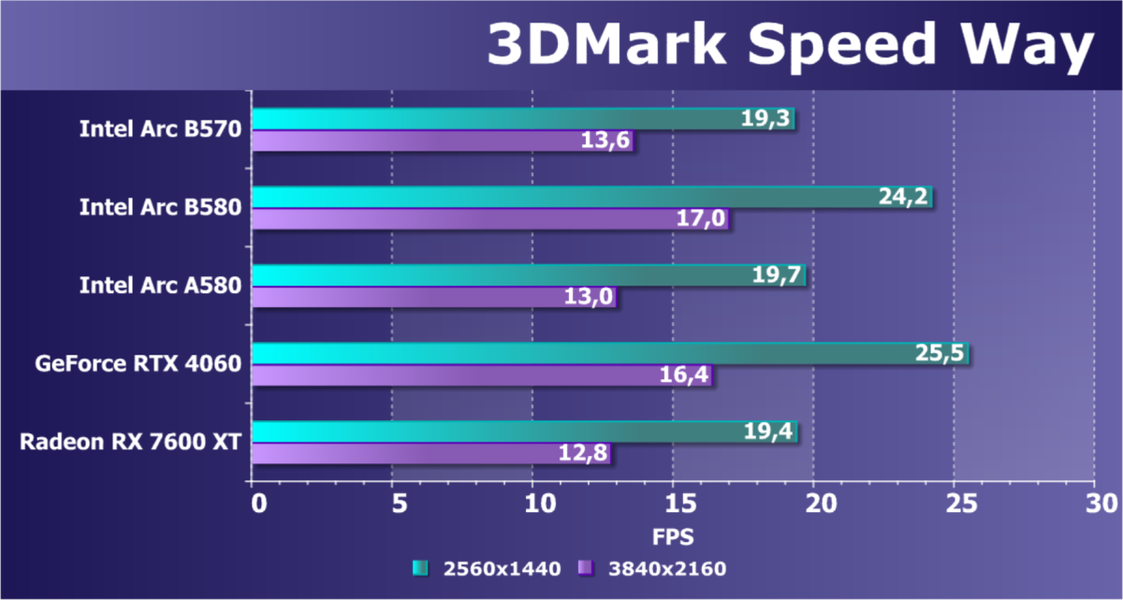 В классических играх с растеризацией ускоритель Arc B570, являясь относительно бюджетным решением (ожидаемая розничной стоимость — менее 30 тысяч рублей), чуть-чуть обошел флагмана Intel предыдущего поколения Arc A770, а также более дорогого конкурента в лице Radeon RX 7600 XT. Прямого ценового конкурента Radeon RX 7600 он опережает на 13%. Что касается решений Nvidia, то Arc B570 немного превосходит GeForce RTX 4060. GeForce RTX 5060 оказывается производительнее не только Arc B570, но и Arc B580.