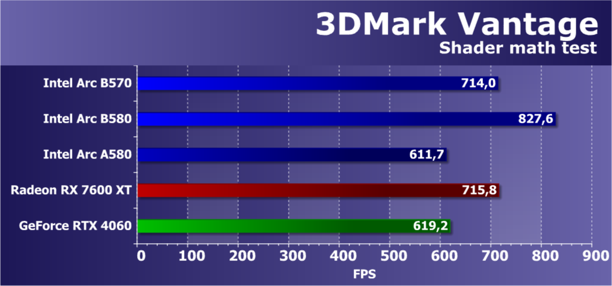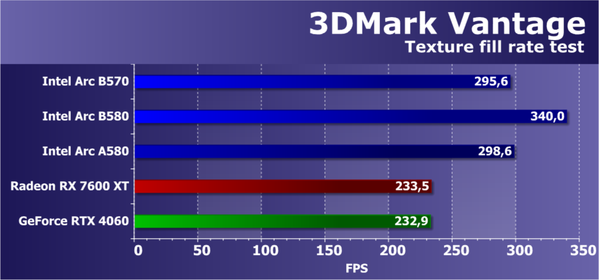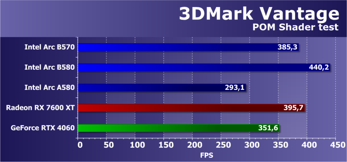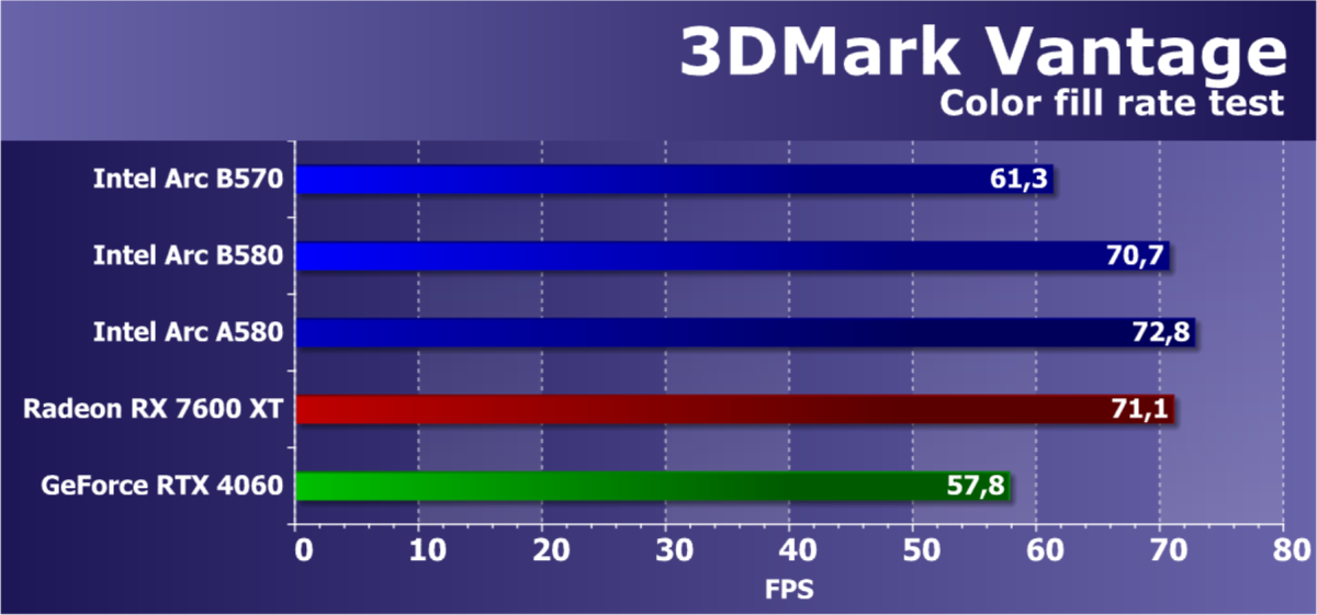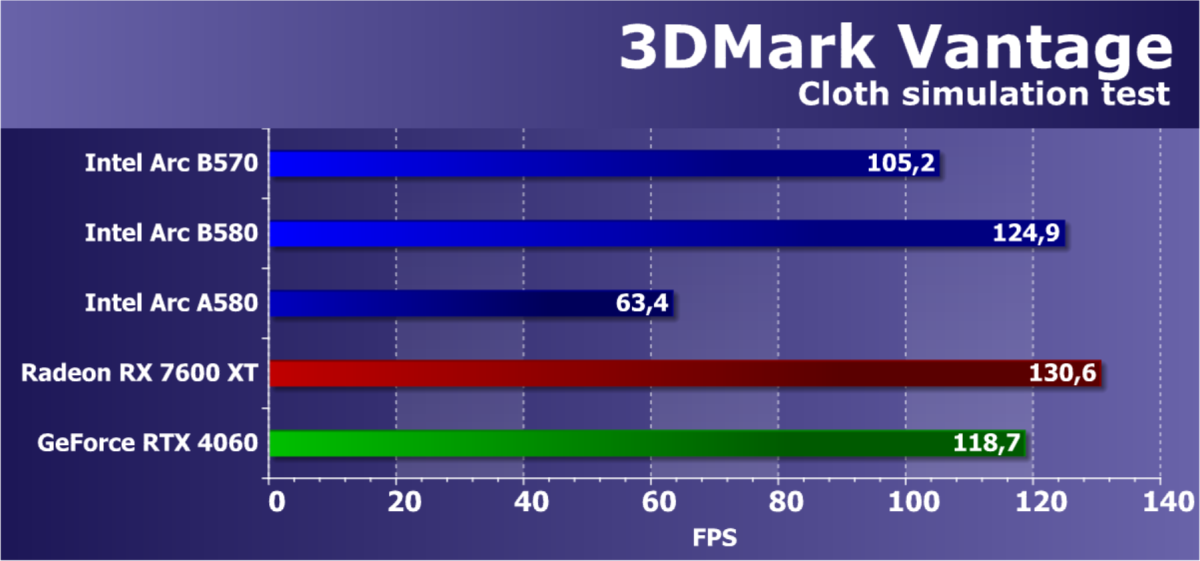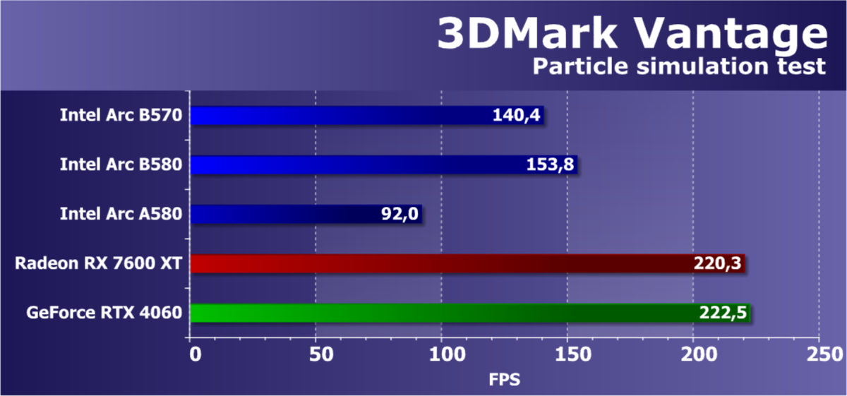 В классических играх с растеризацией ускоритель Arc B570, являясь относительно бюджетным решением (ожидаемая розничной стоимость — менее 30 тысяч рублей), чуть-чуть обошел флагмана Intel предыдущего поколения Arc A770, а также более дорогого конкурента в лице Radeon RX 7600 XT. Прямого ценового конкурента Radeon RX 7600 он опережает на 13%. Что касается решений Nvidia, то Arc B570 немного превосходит GeForce RTX 4060. GeForce RTX 5060 оказывается производительнее не только Arc B570, но и Arc B580.