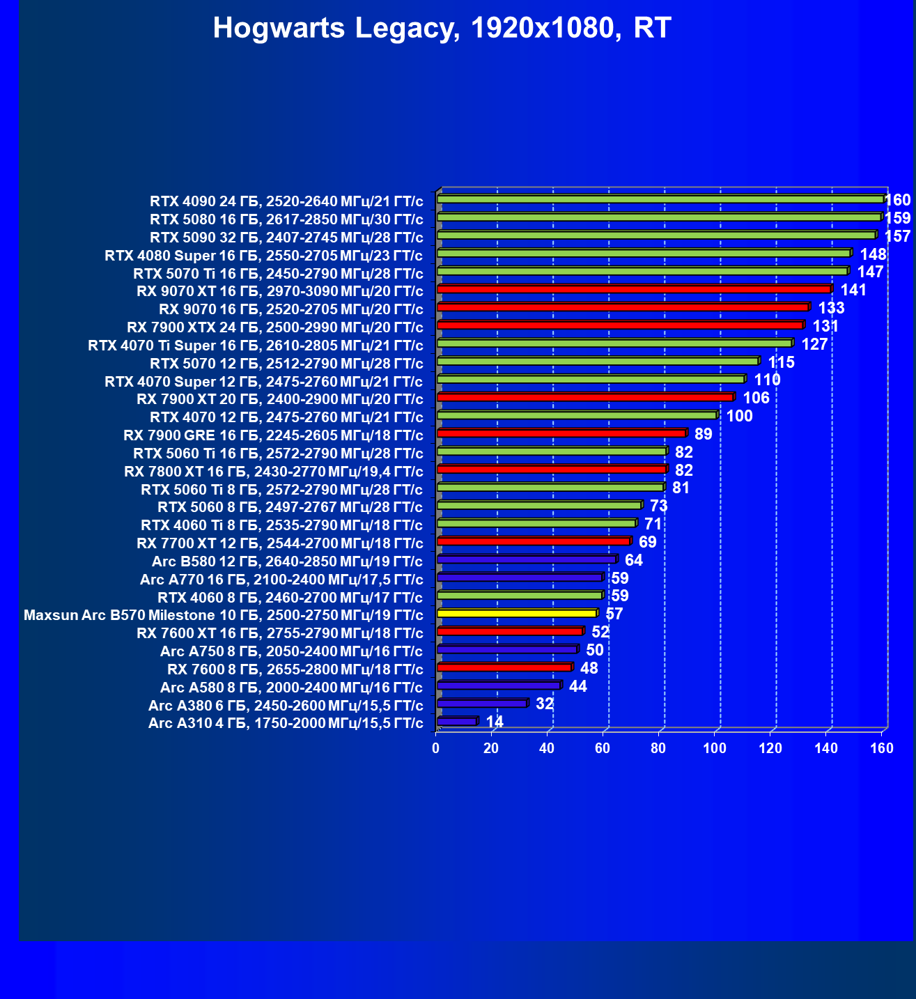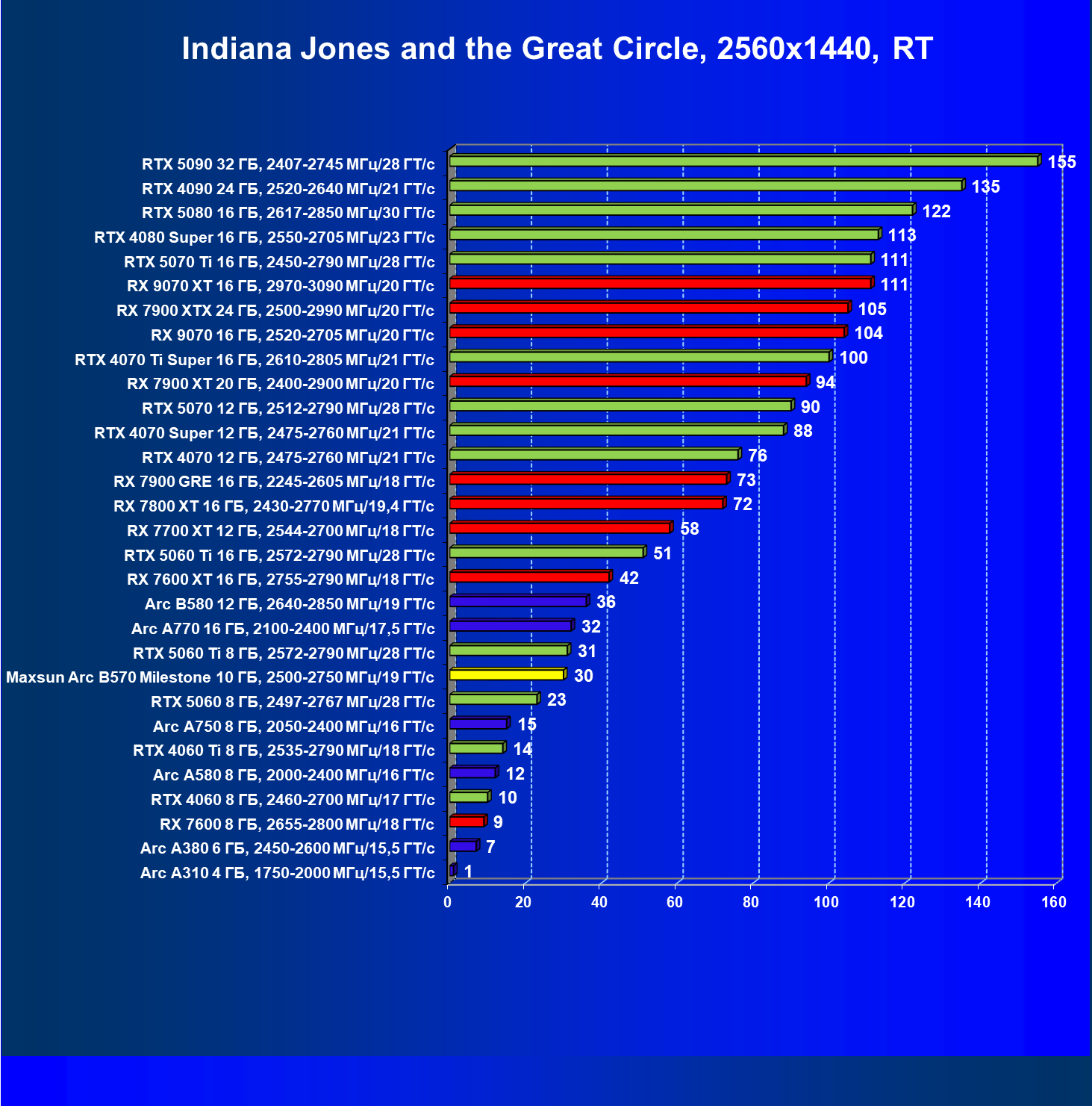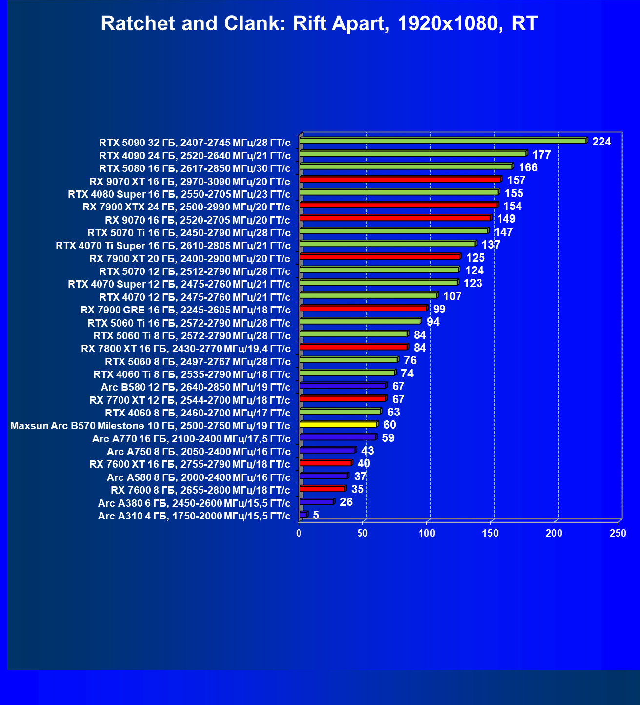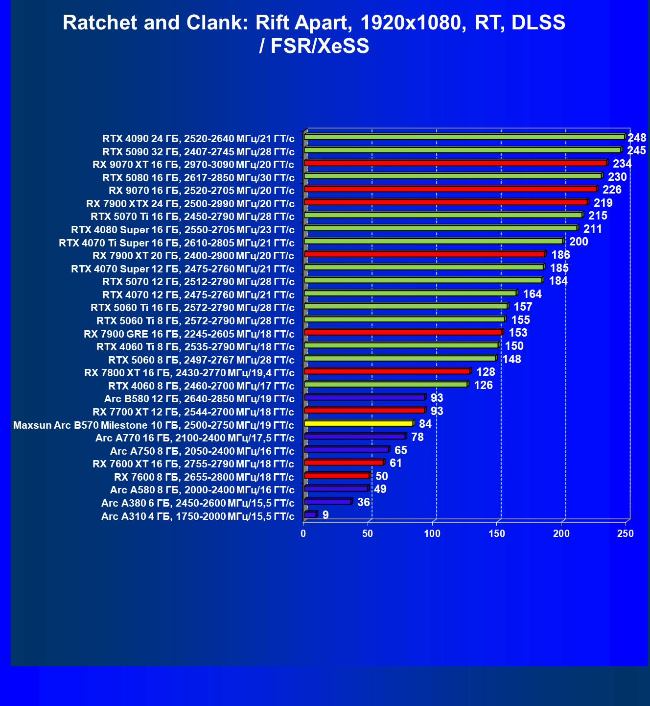 | 04 | Maxsun Arc B570 Milestone 10 ГБ, 2500—2750 МГц/19 ГТ/с | 155 | 451 | 29 000 |