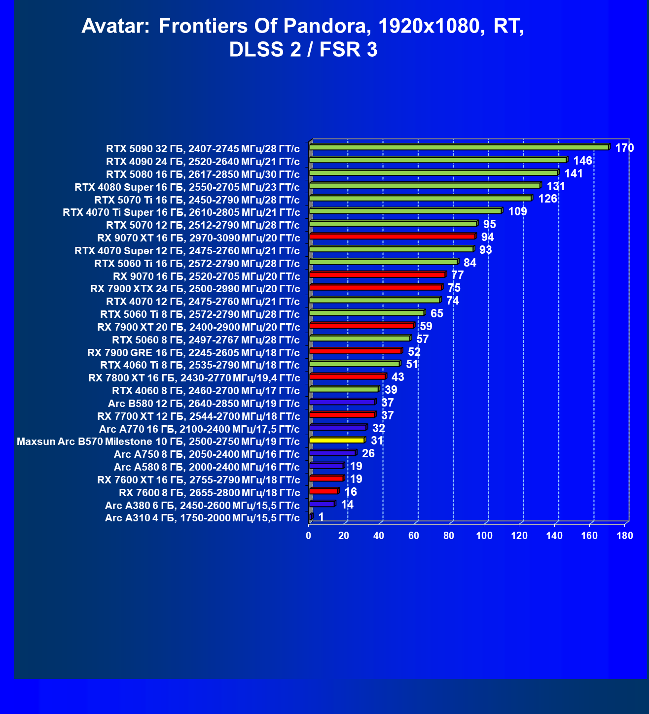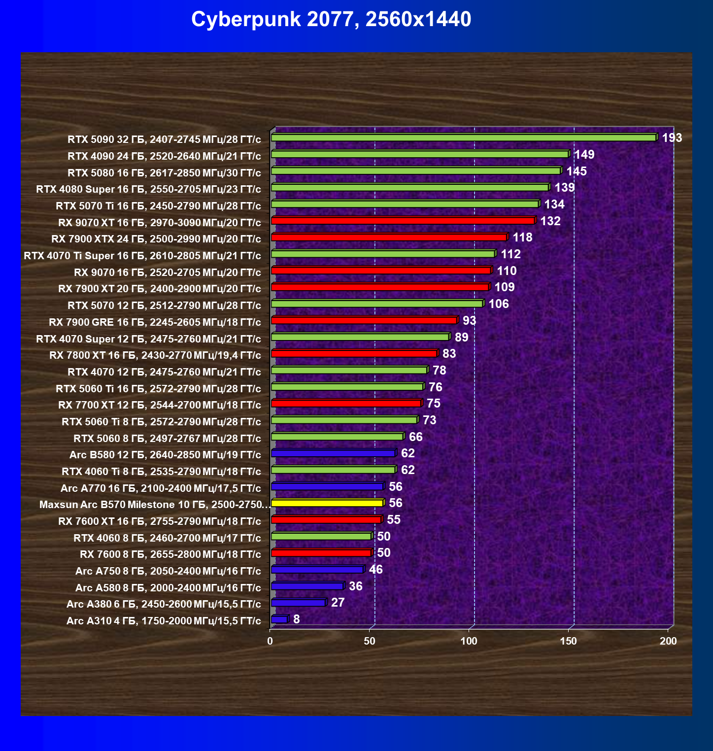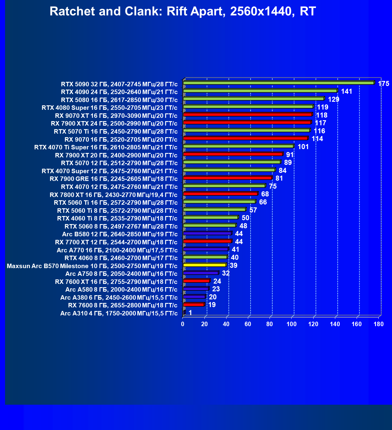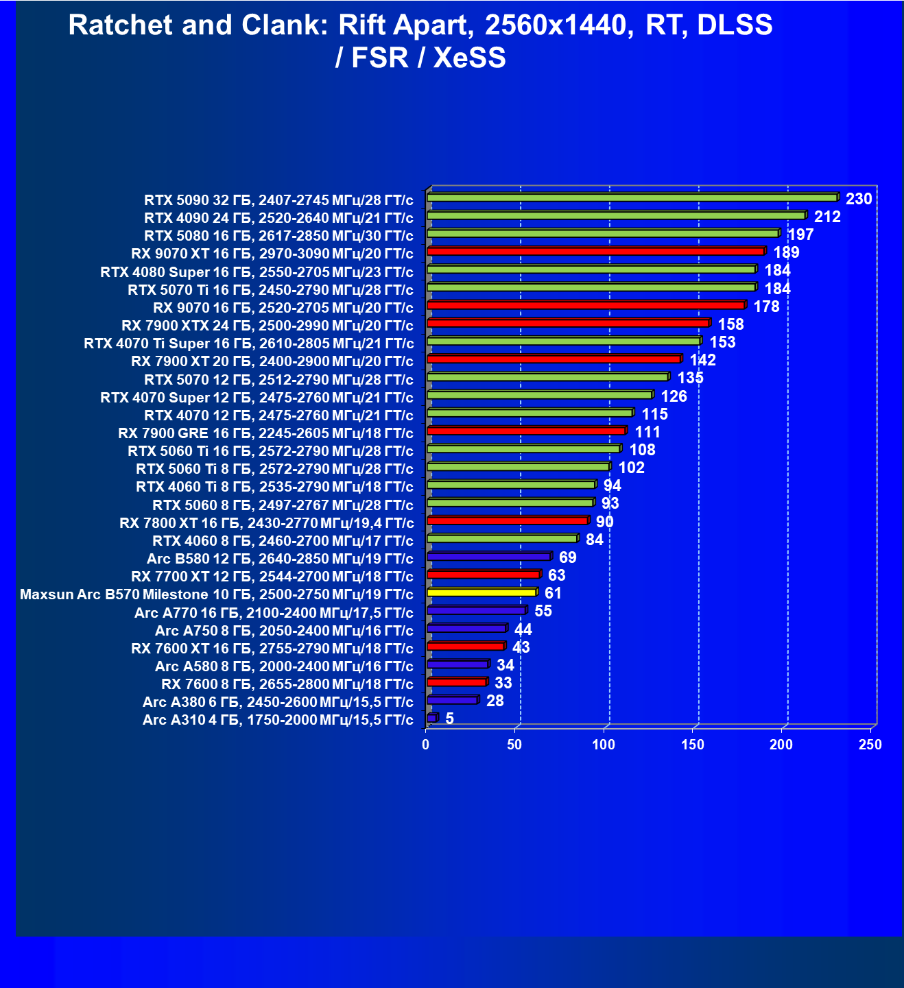 | 04 | Maxsun Arc B570 Milestone 10 ГБ, 2500—2750 МГц/19 ГТ/с | 155 | 451 | 29 000 |