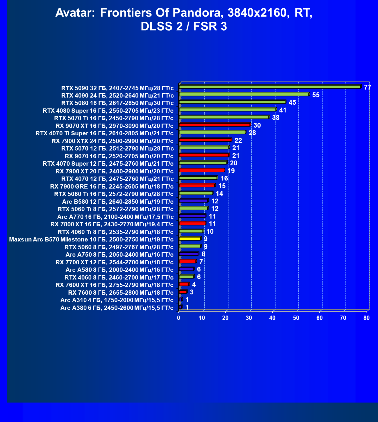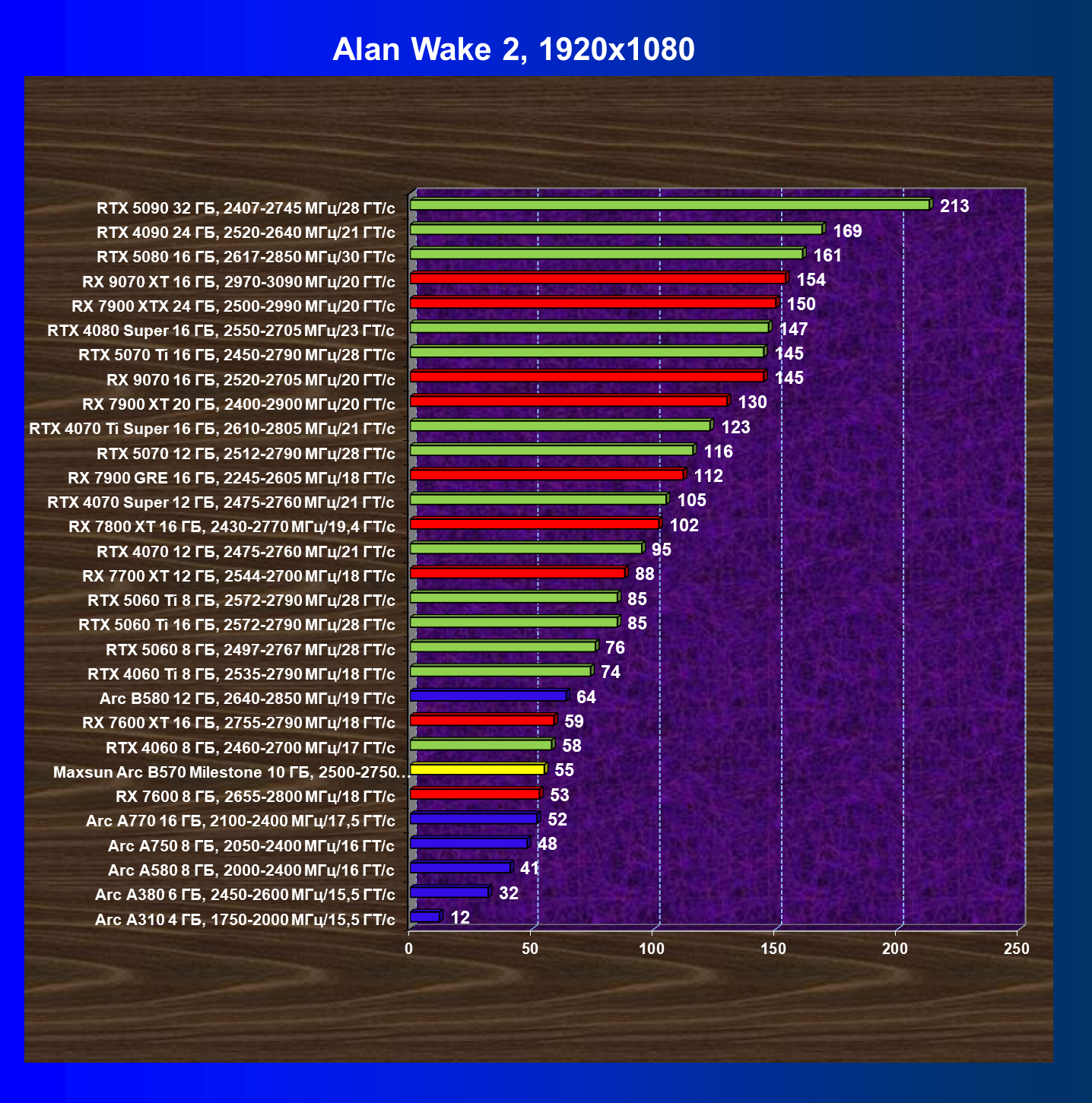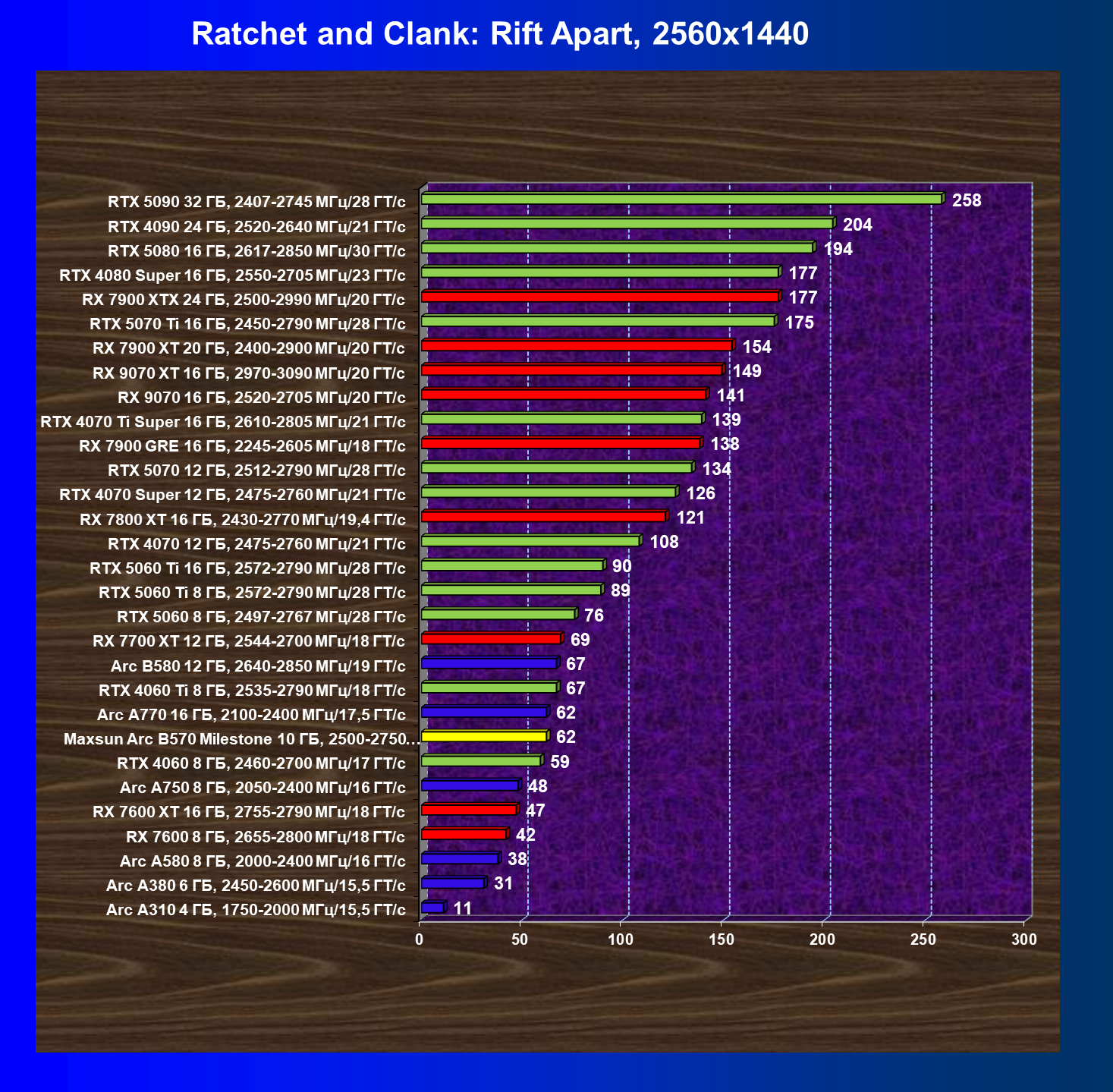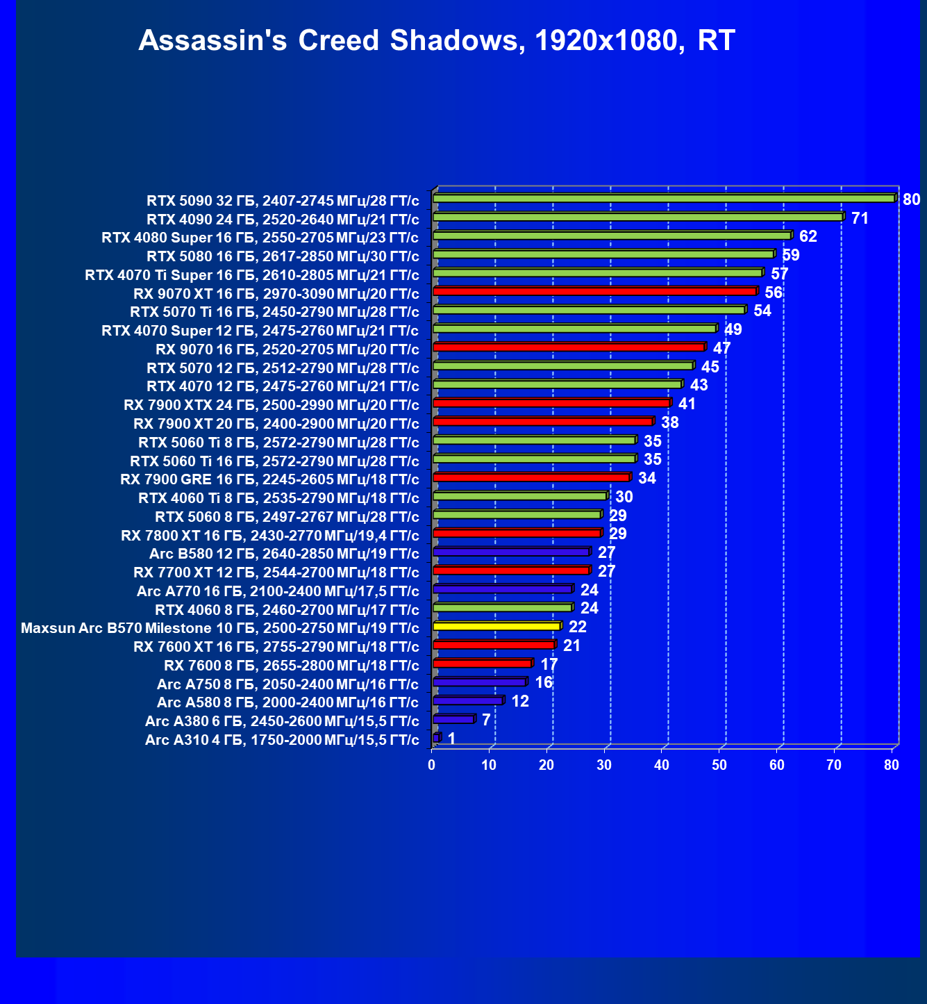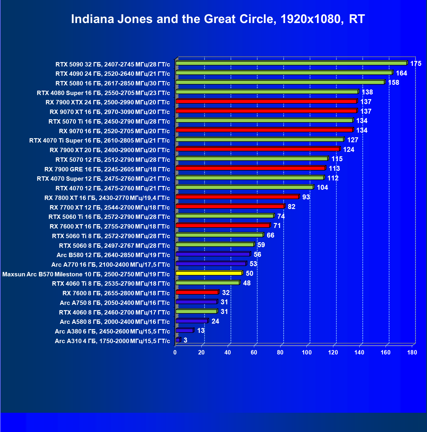 | 04 | Maxsun Arc B570 Milestone 10 ГБ, 2500—2750 МГц/19 ГТ/с | 155 | 451 | 29 000 |