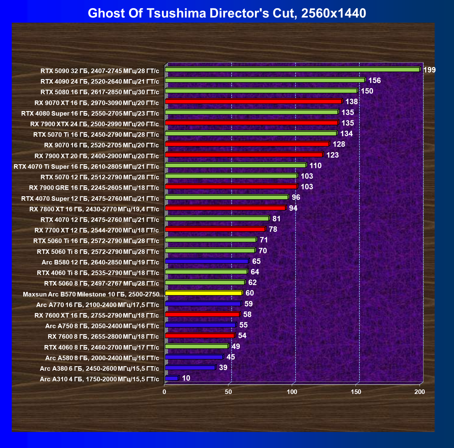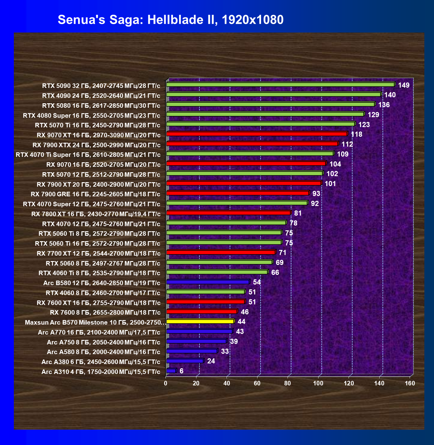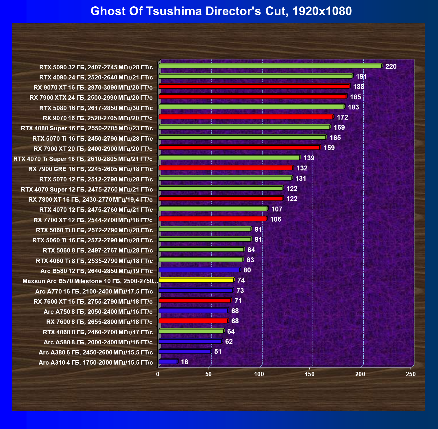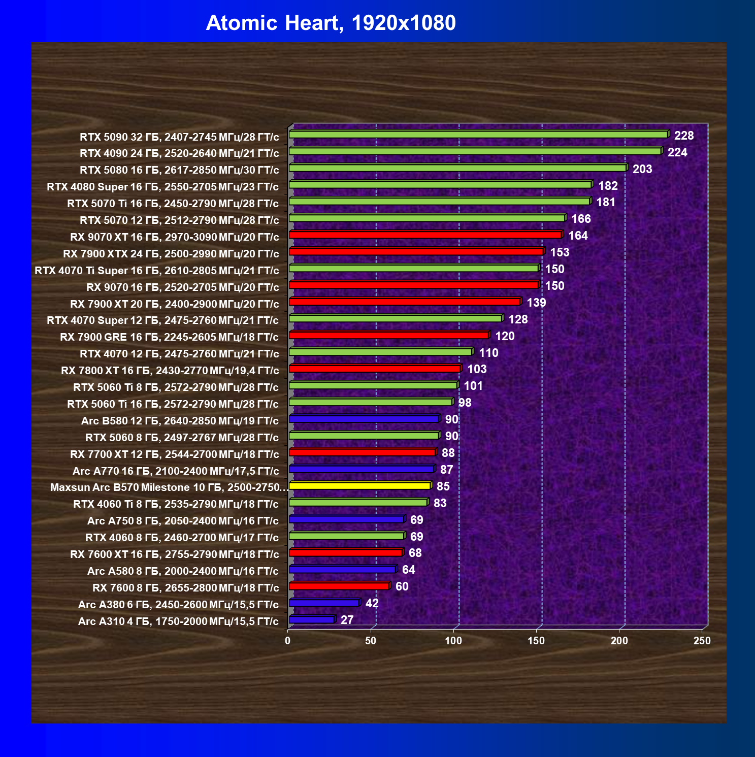 | 04 | Maxsun Arc B570 Milestone 10 ГБ, 2500—2750 МГц/19 ГТ/с | 155 | 451 | 29 000 |