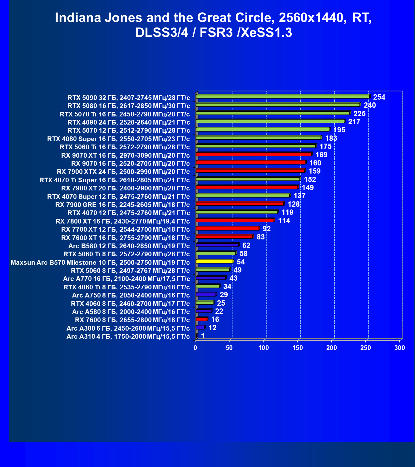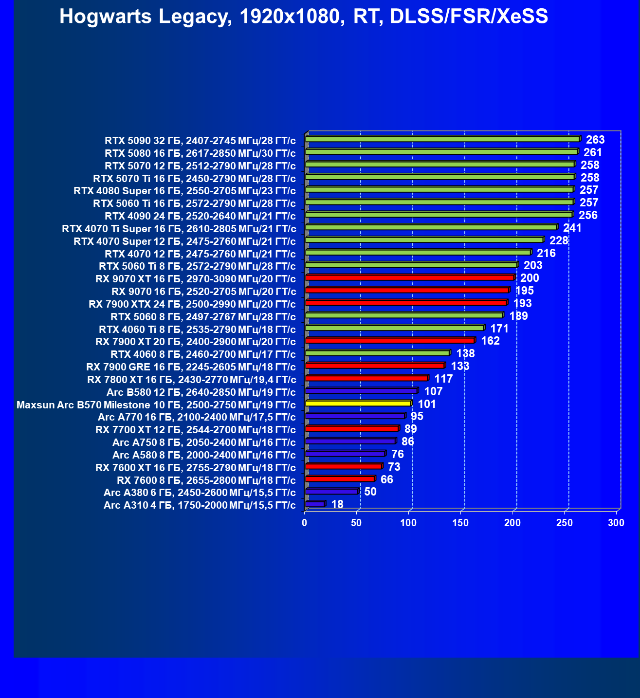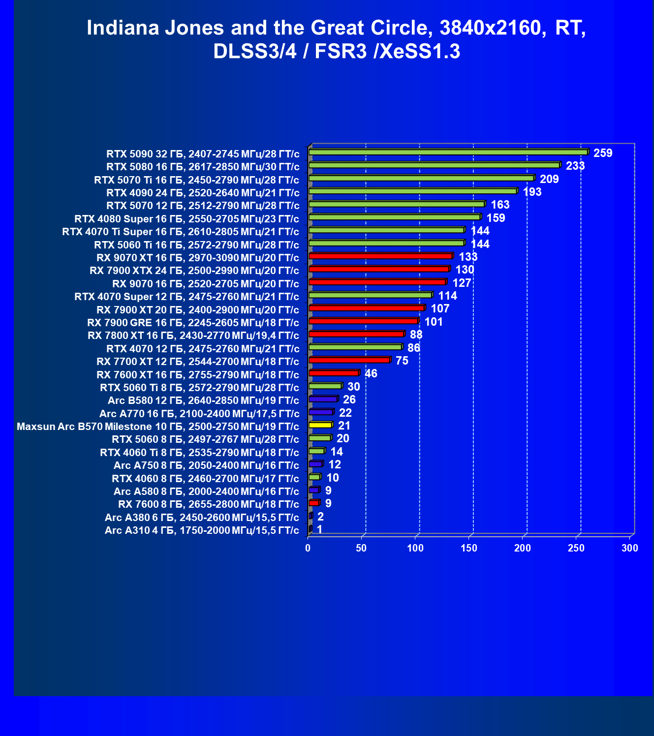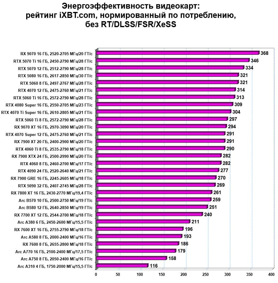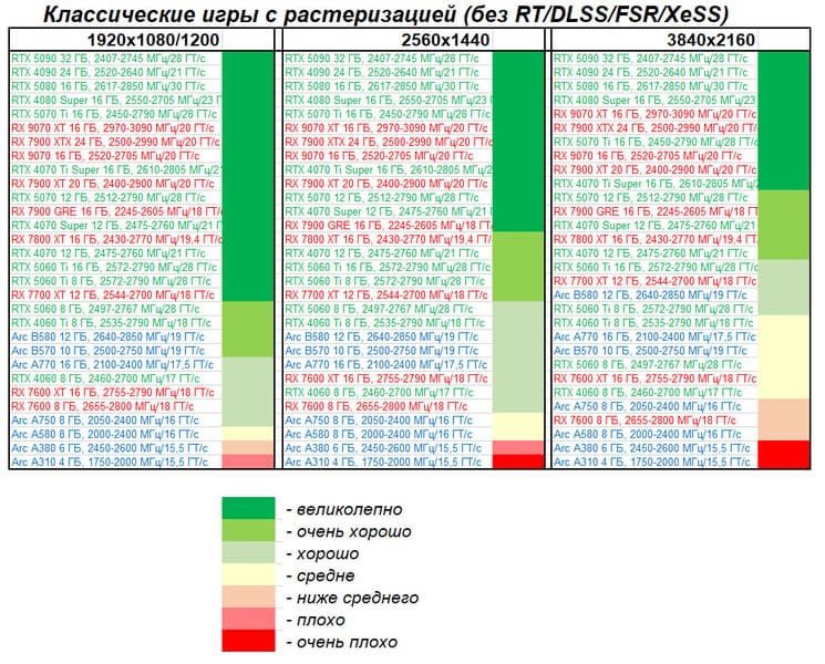 | 12 | Arc B580 12 ГБ, 2640—2850 МГц/19 ГТ/с | 259 | 933 | 36 000 |