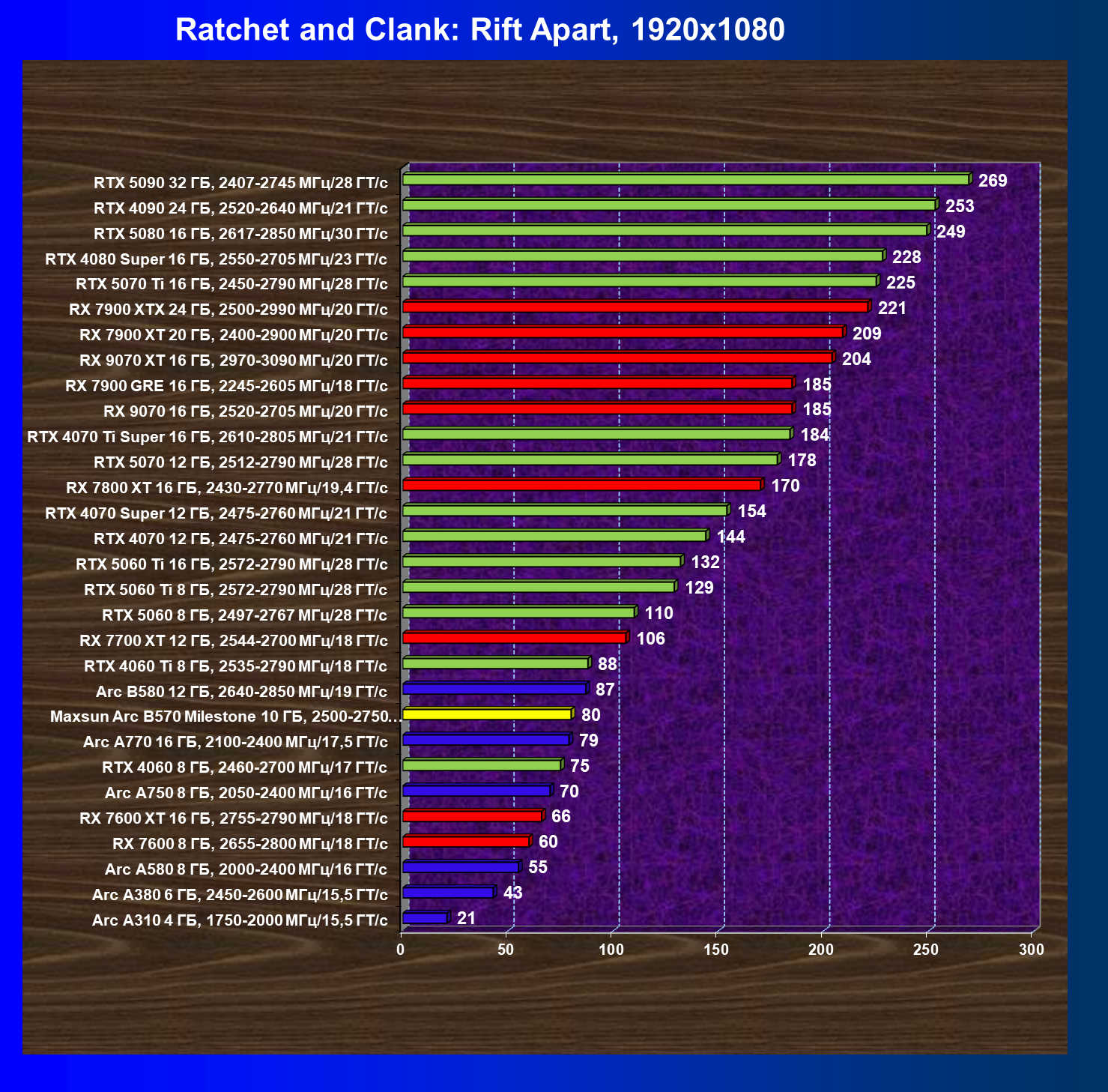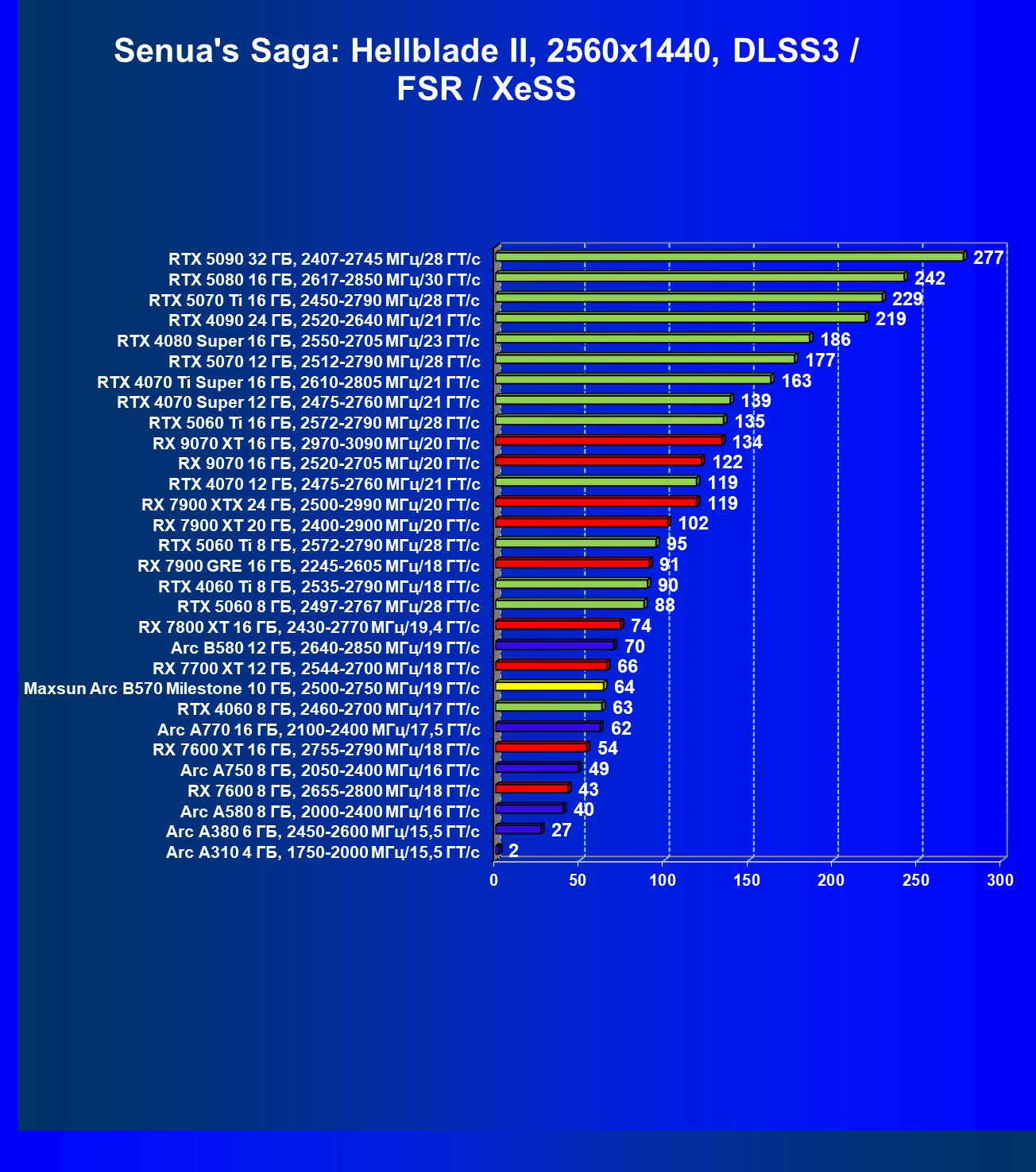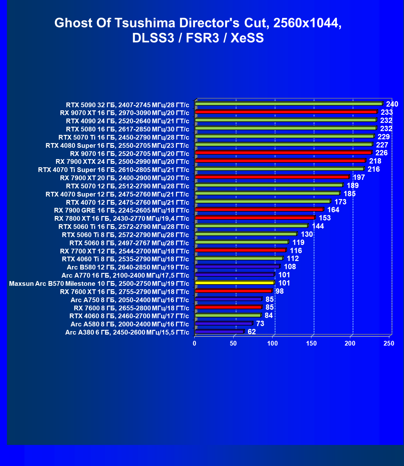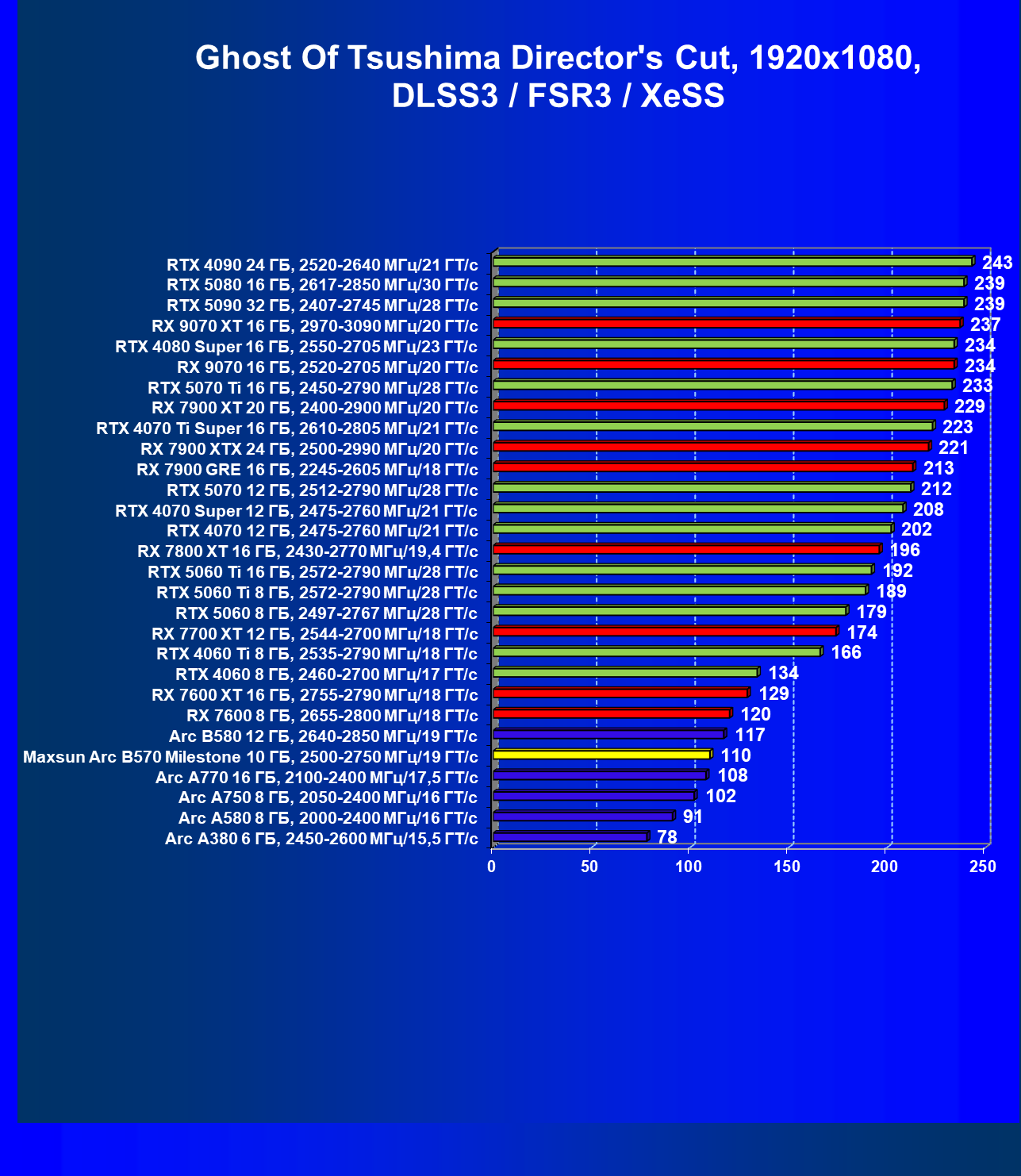 | 12 | Arc B580 12 ГБ, 2640—2850 МГц/19 ГТ/с | 259 | 933 | 36 000 |
