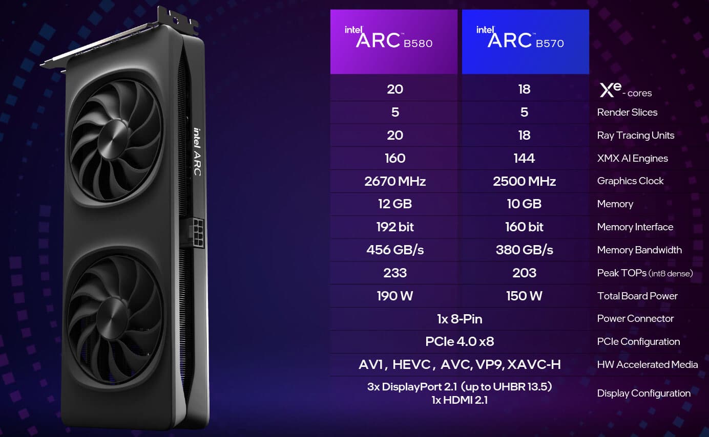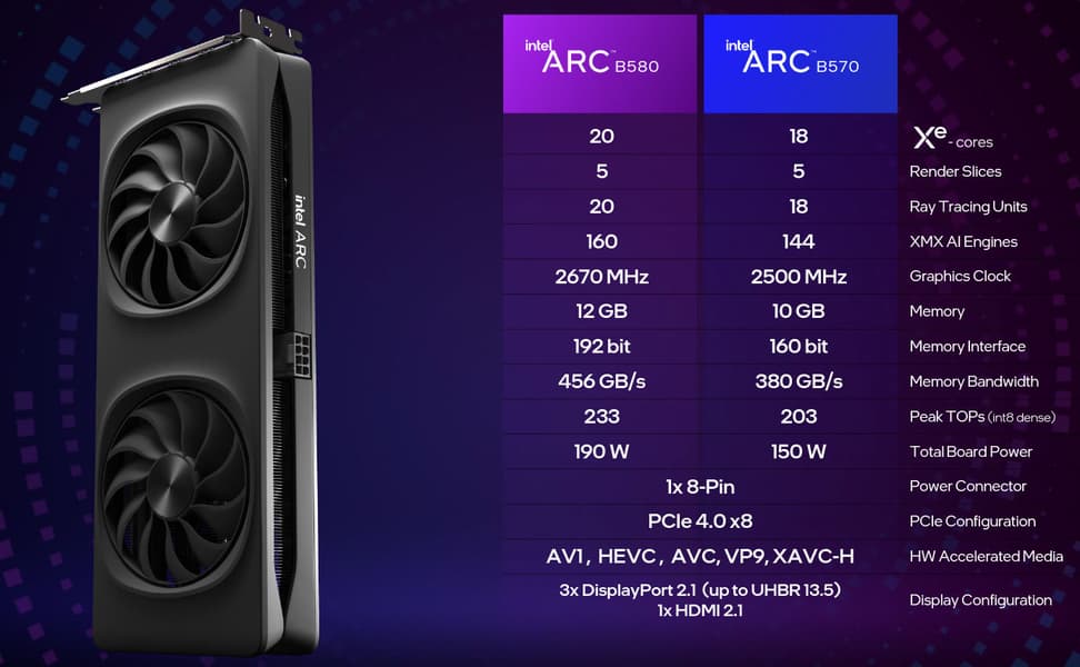 Сразу же Intel объявила и чуть менее мощную видеокарту на том же чипе, и 16 января 2025 года наконец-то произошло расширение линейки при помощи еще более конкурентоспособной модели Arc B570, для которой была установлена рекомендованная цена еще ниже — всего $220. И за эти деньги у Nvidia просто не было и нет ничего уровня GeForce RTX 3050 в семействах RTX 40 и RTX 50, так что этот сегмент рынка был открыт для конкуренции, ведь AMD также не предлагала ничего ниже Radeon RX 7600, а RX 6600 была сильно медленнее. Так что младшая Arc B570 продолжила дело старшей Arc B580, внедряясь в сегмент недорогих графических решений именно там, где лидирующие компании имели сравнительно слабые позиции.