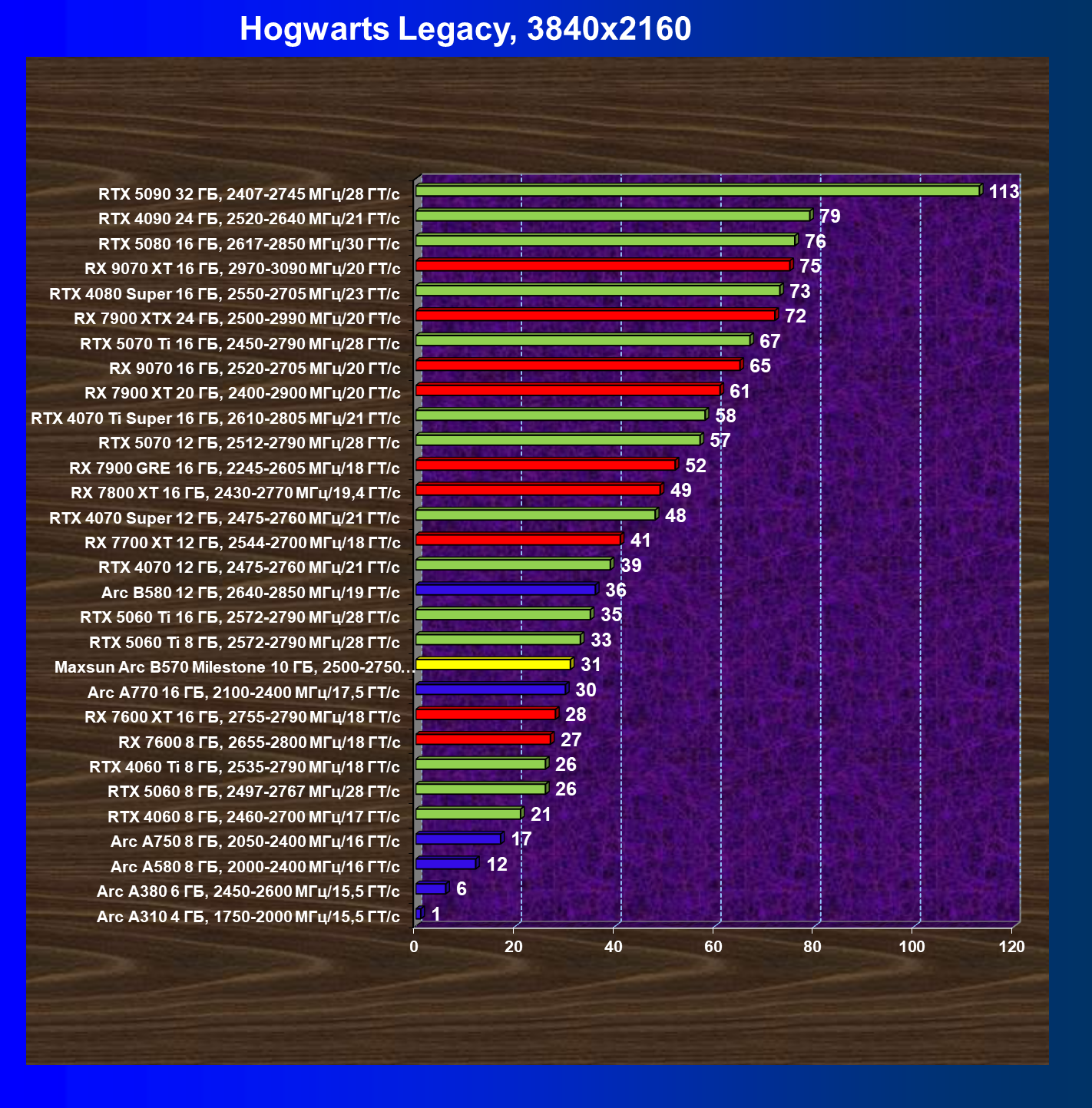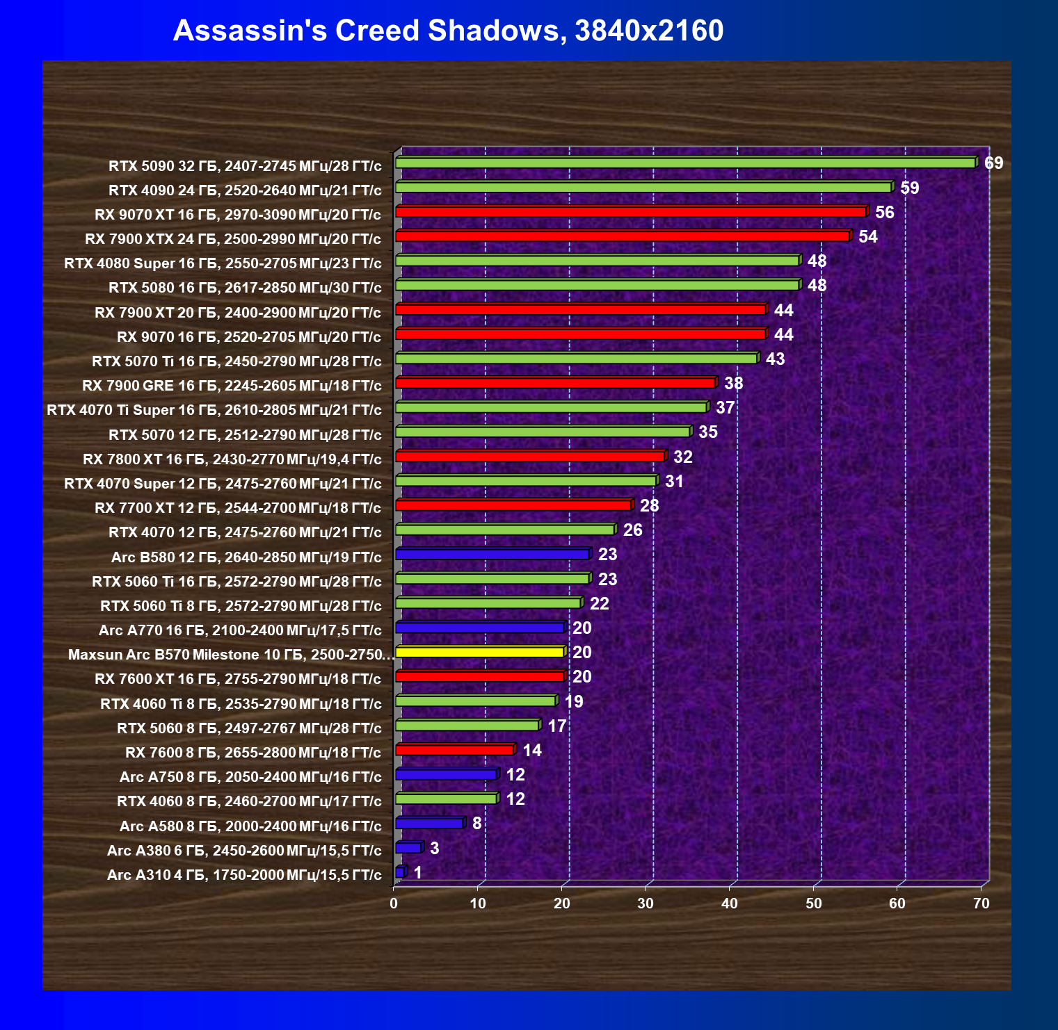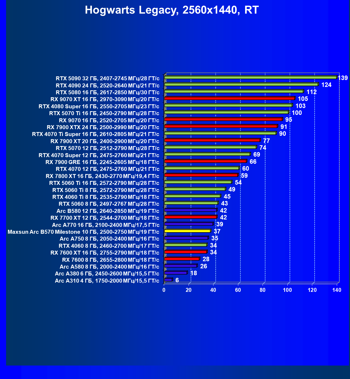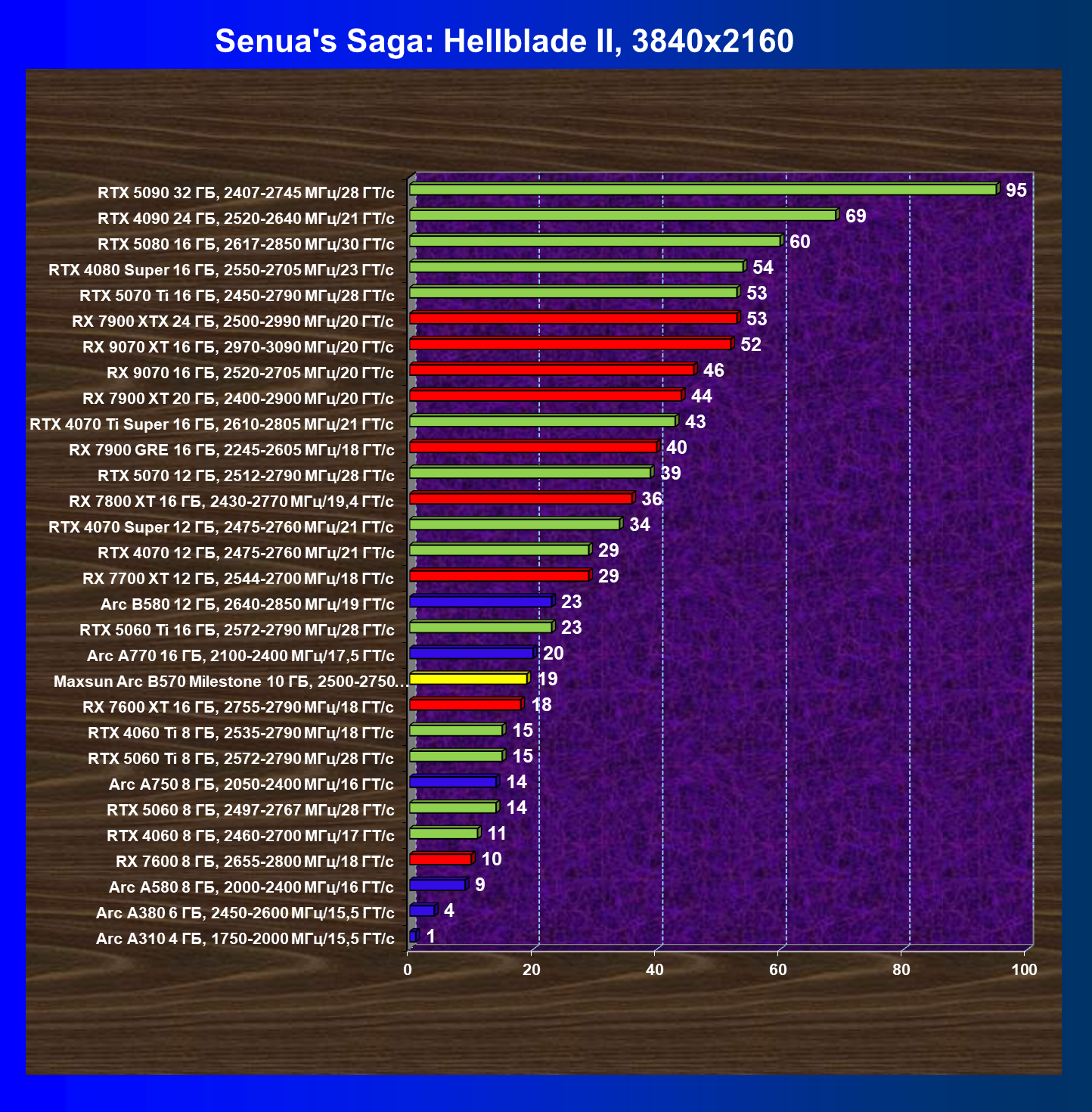 | 21 | Arc B580 12 ГБ, 2640—2850 МГц/19 ГТ/с | 516 | 143 | 36 000 |