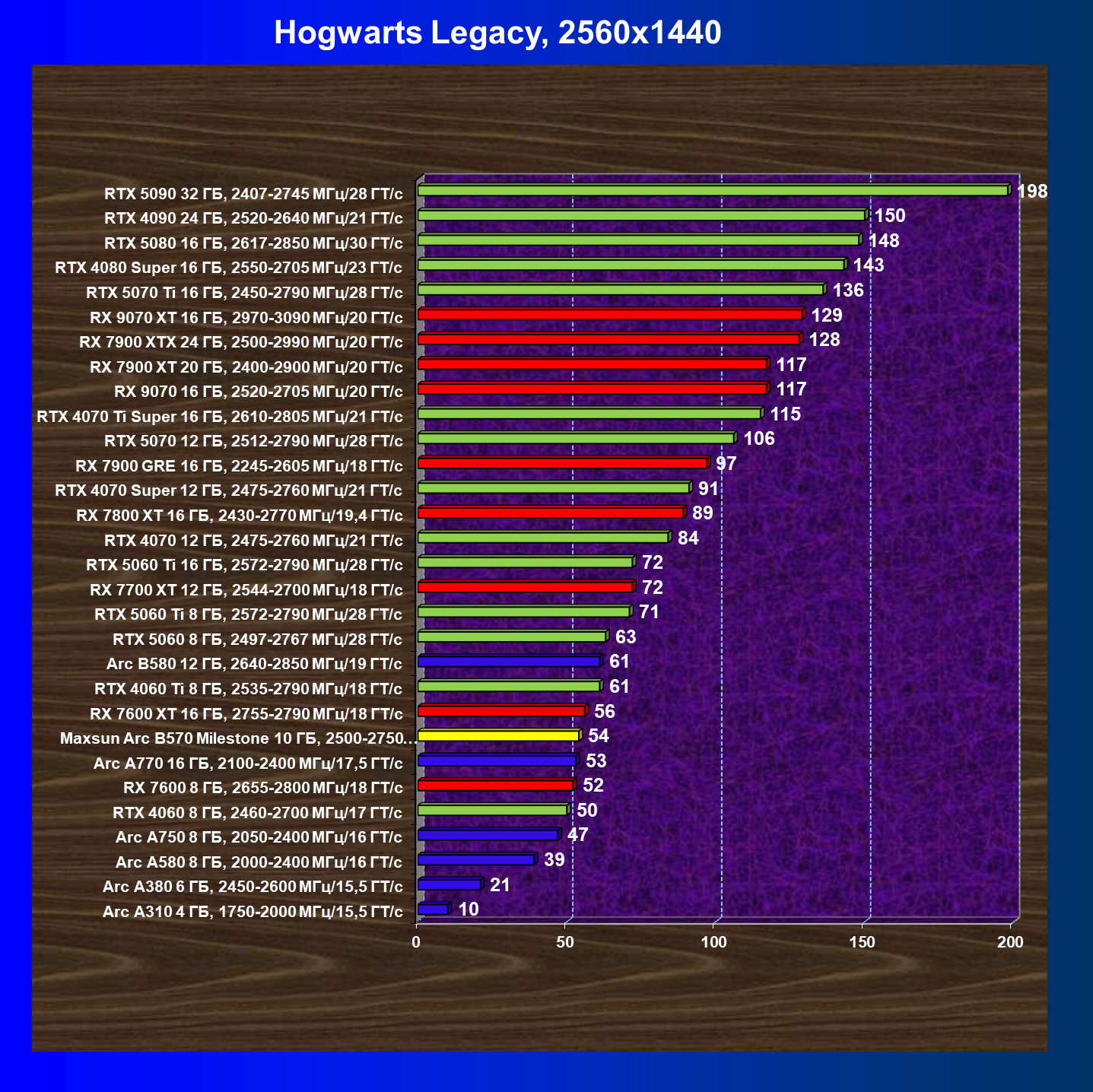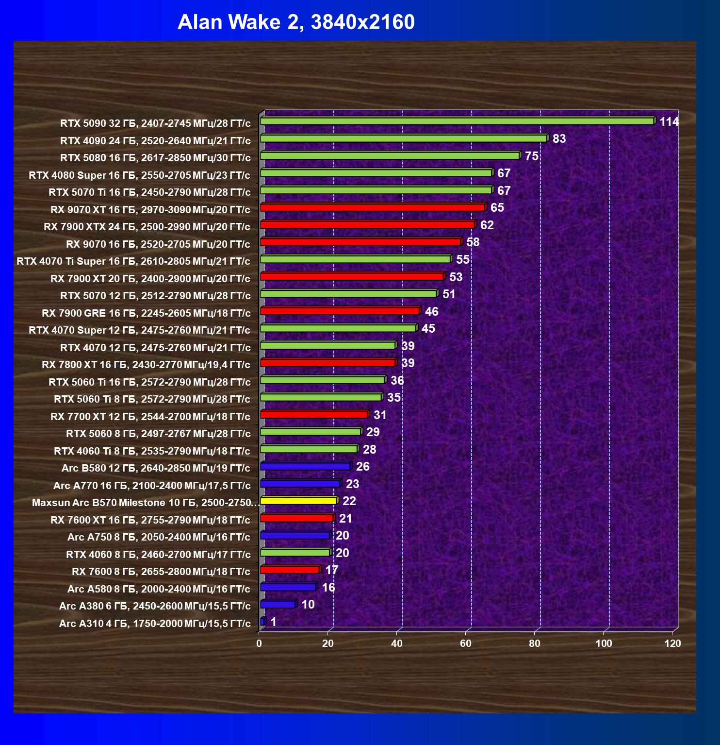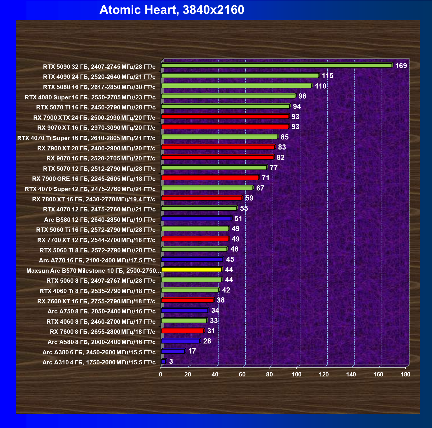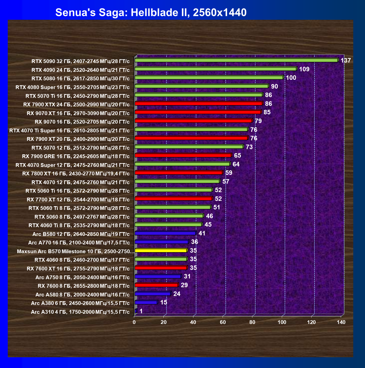 | 21 | Arc B580 12 ГБ, 2640—2850 МГц/19 ГТ/с | 516 | 143 | 36 000 |