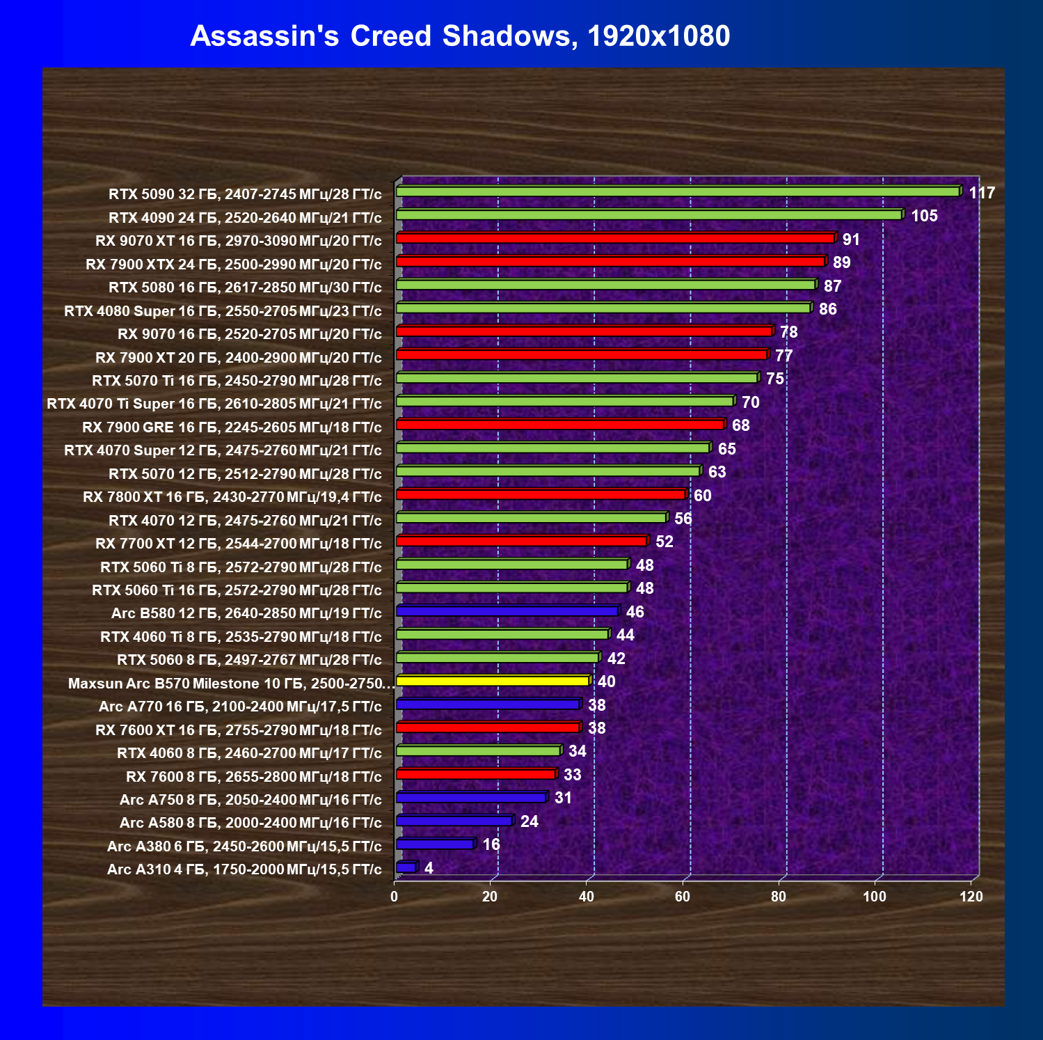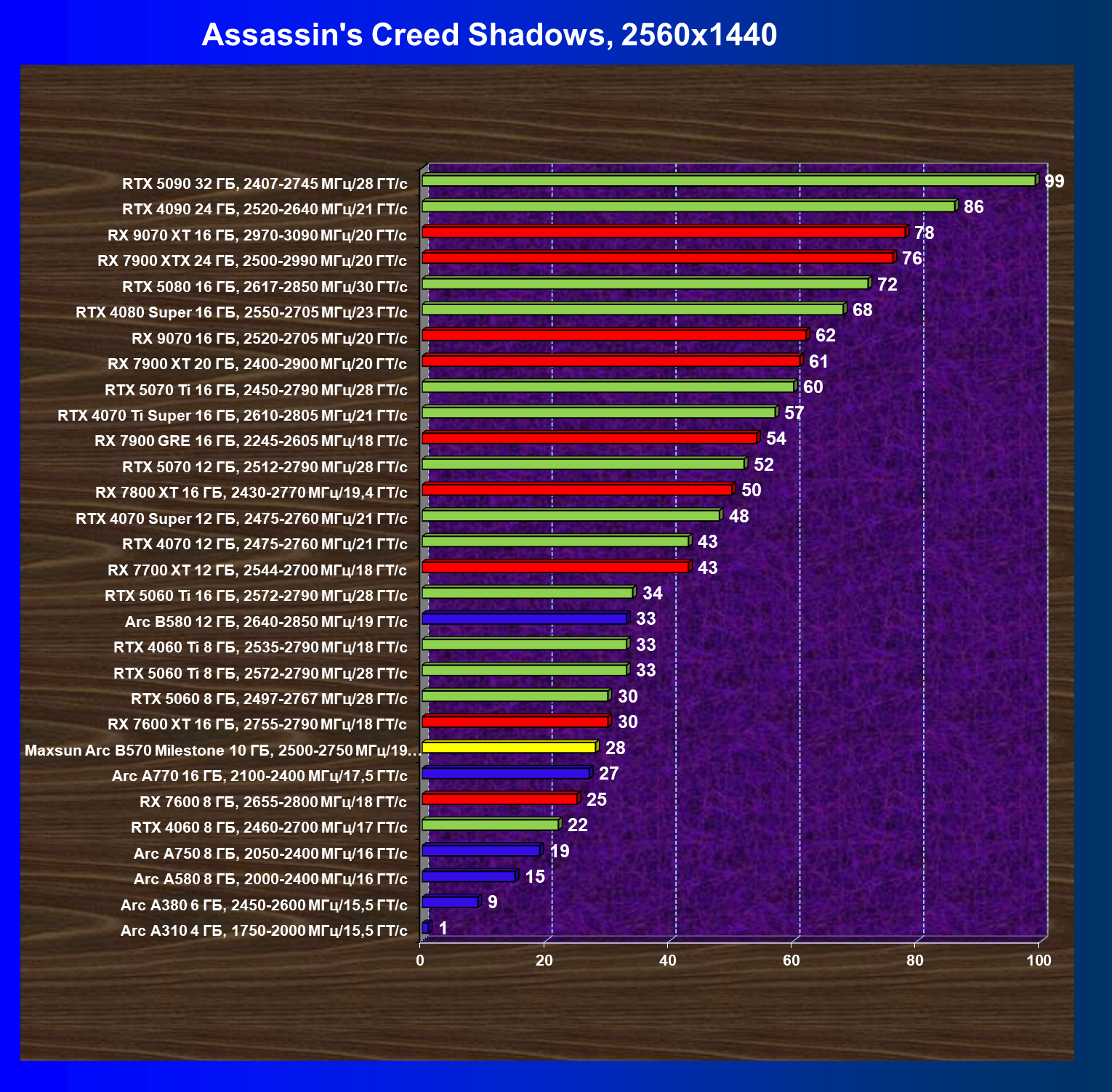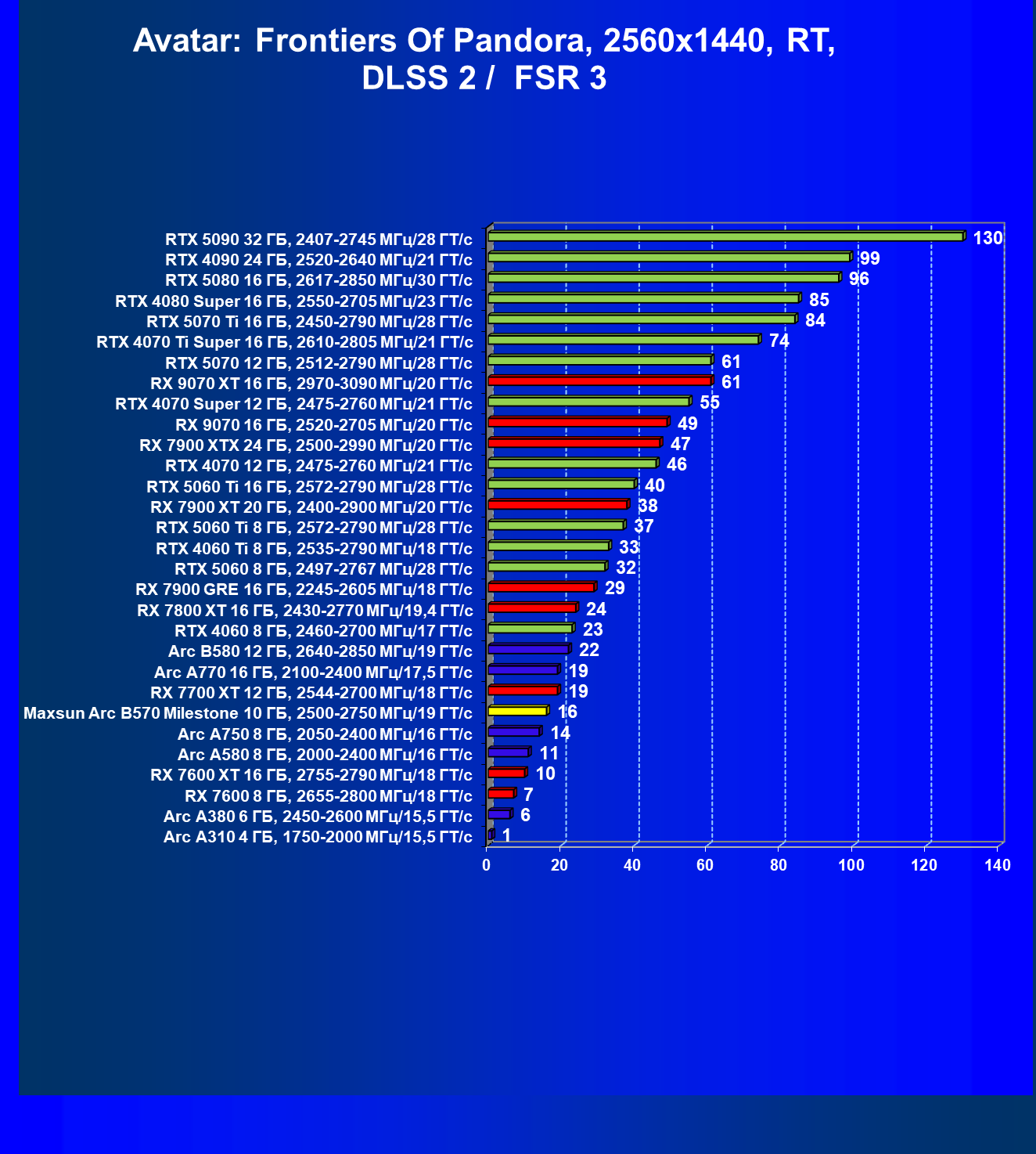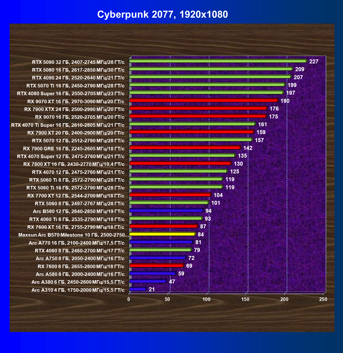 | 21 | Arc B580 12 ГБ, 2640—2850 МГц/19 ГТ/с | 516 | 143 | 36 000 |