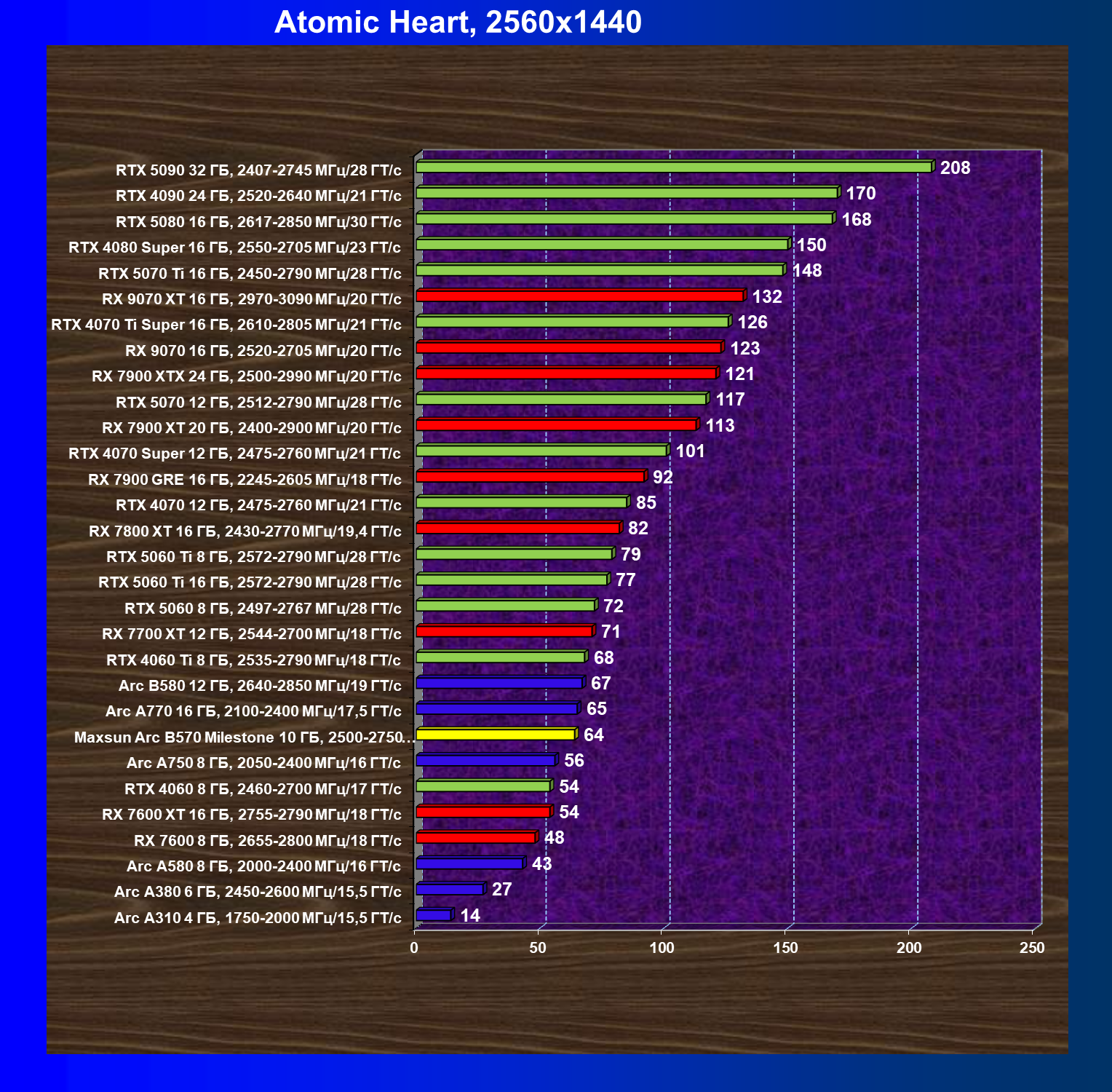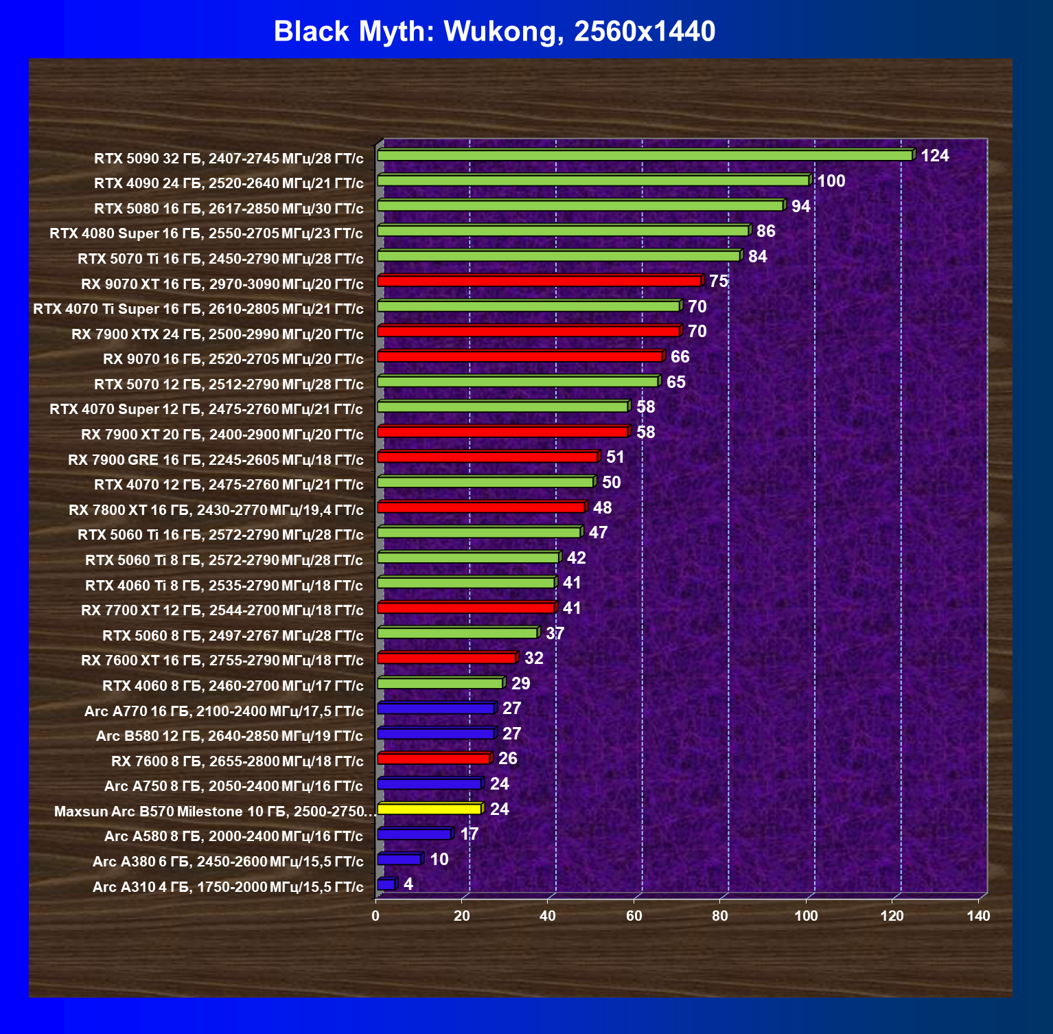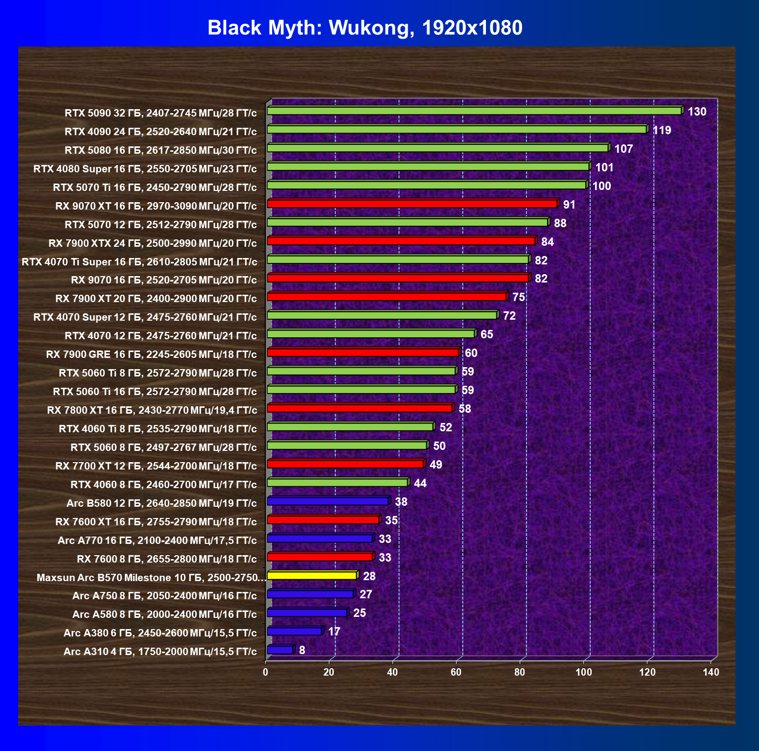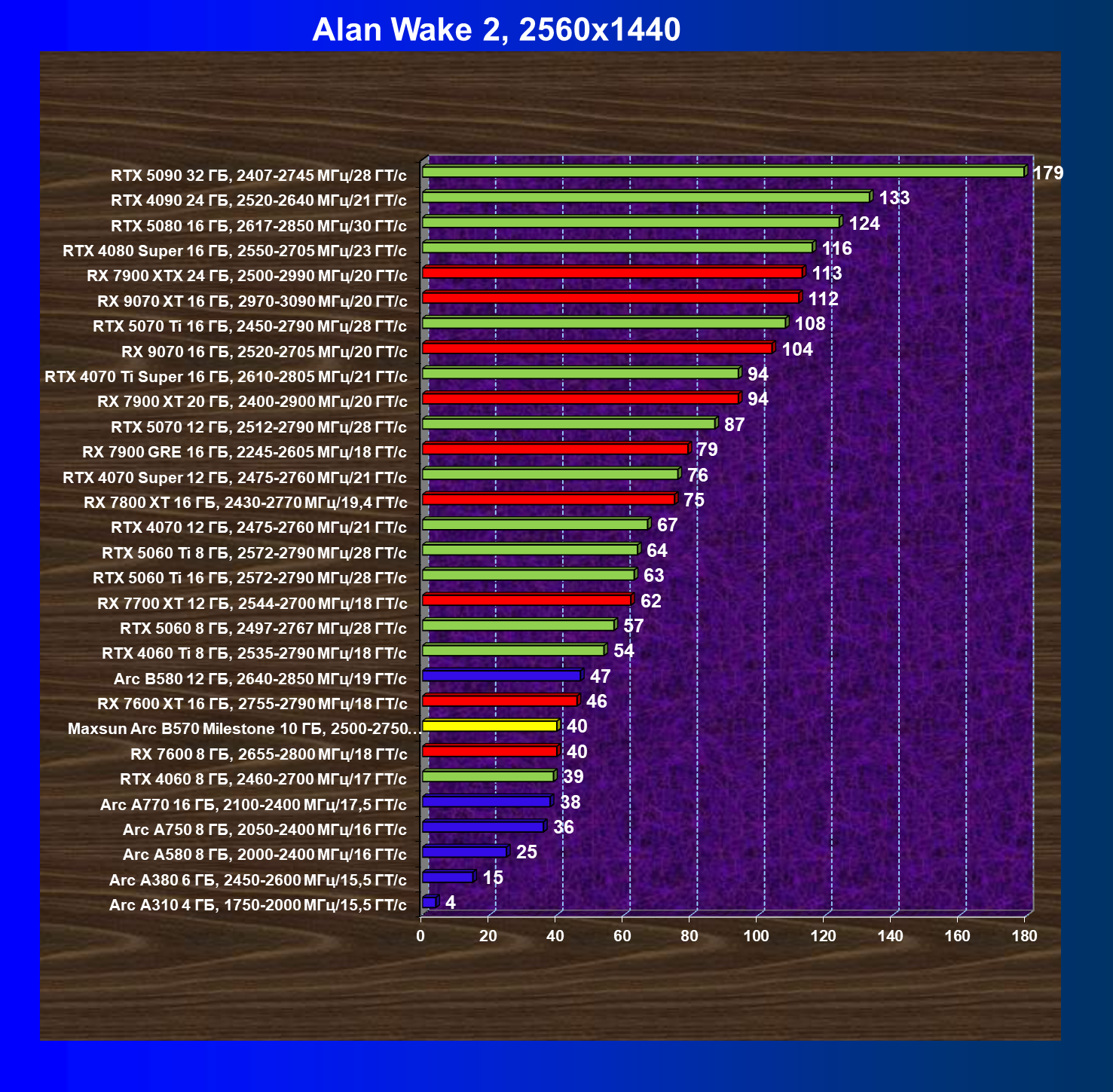 | 21 | Arc B580 12 ГБ, 2640—2850 МГц/19 ГТ/с | 516 | 143 | 36 000 |