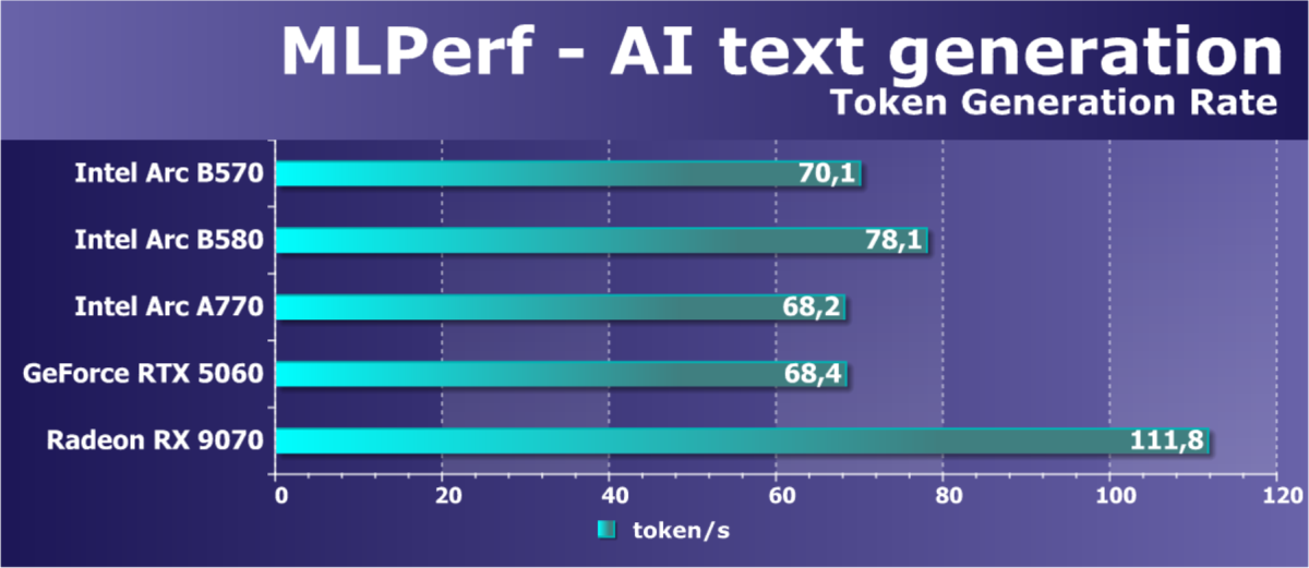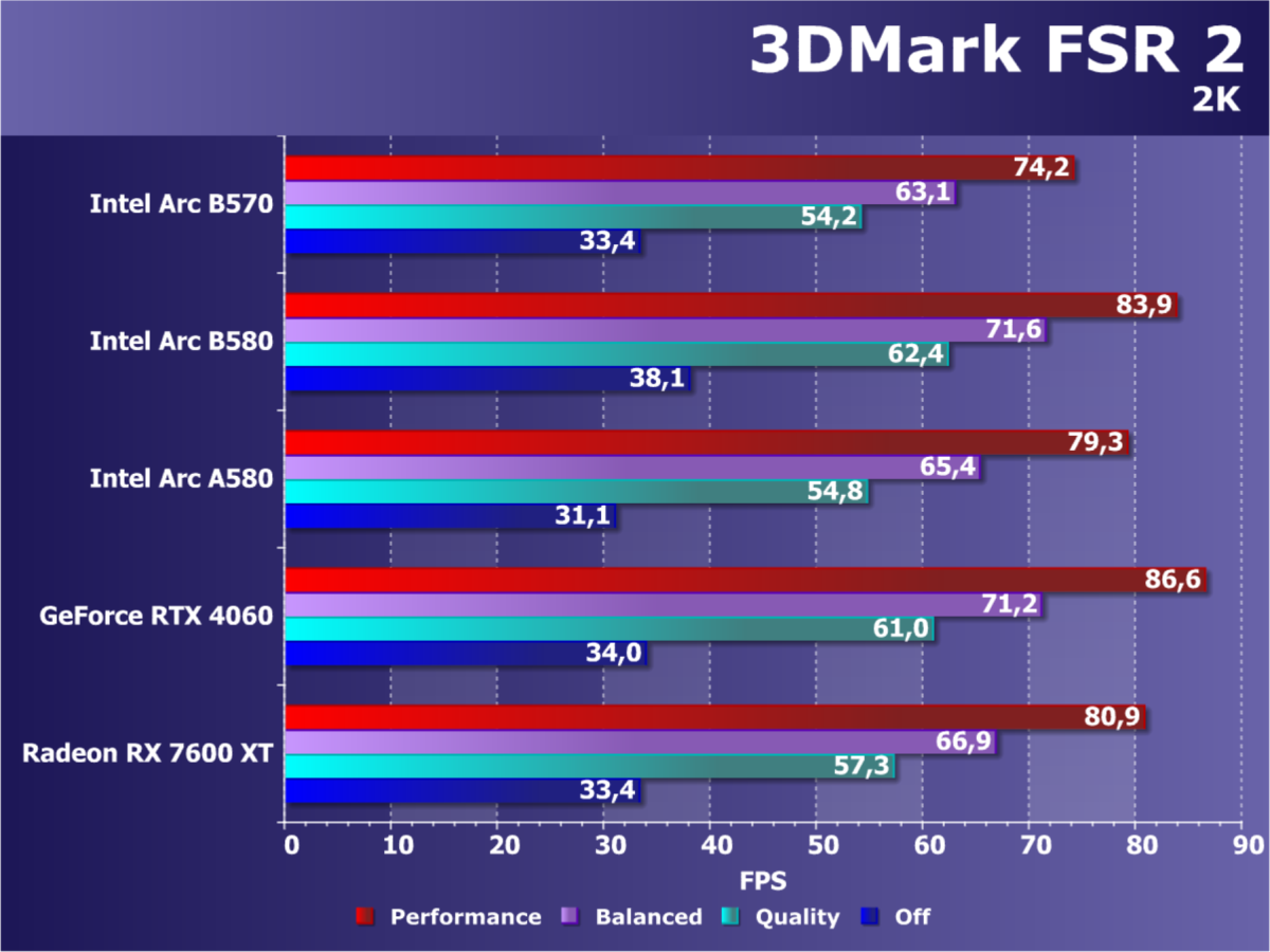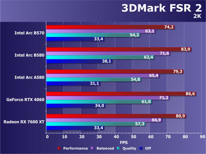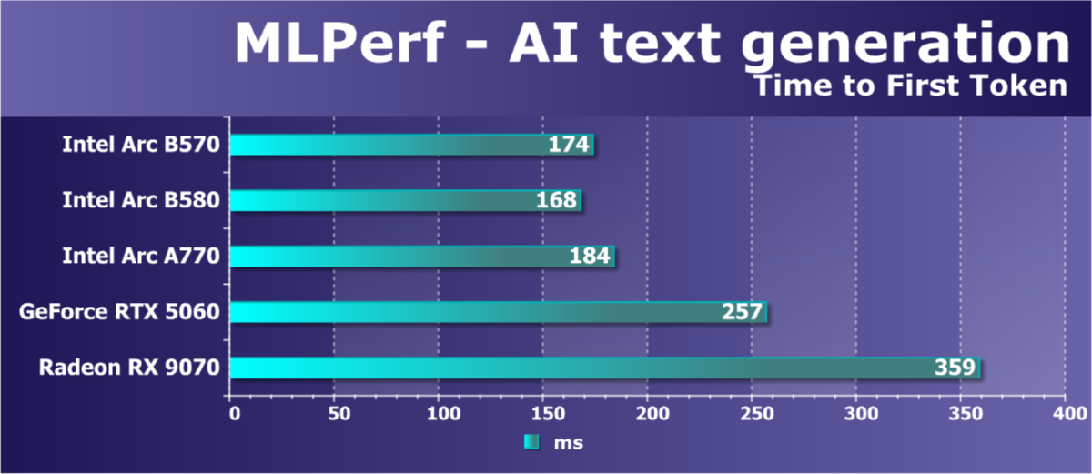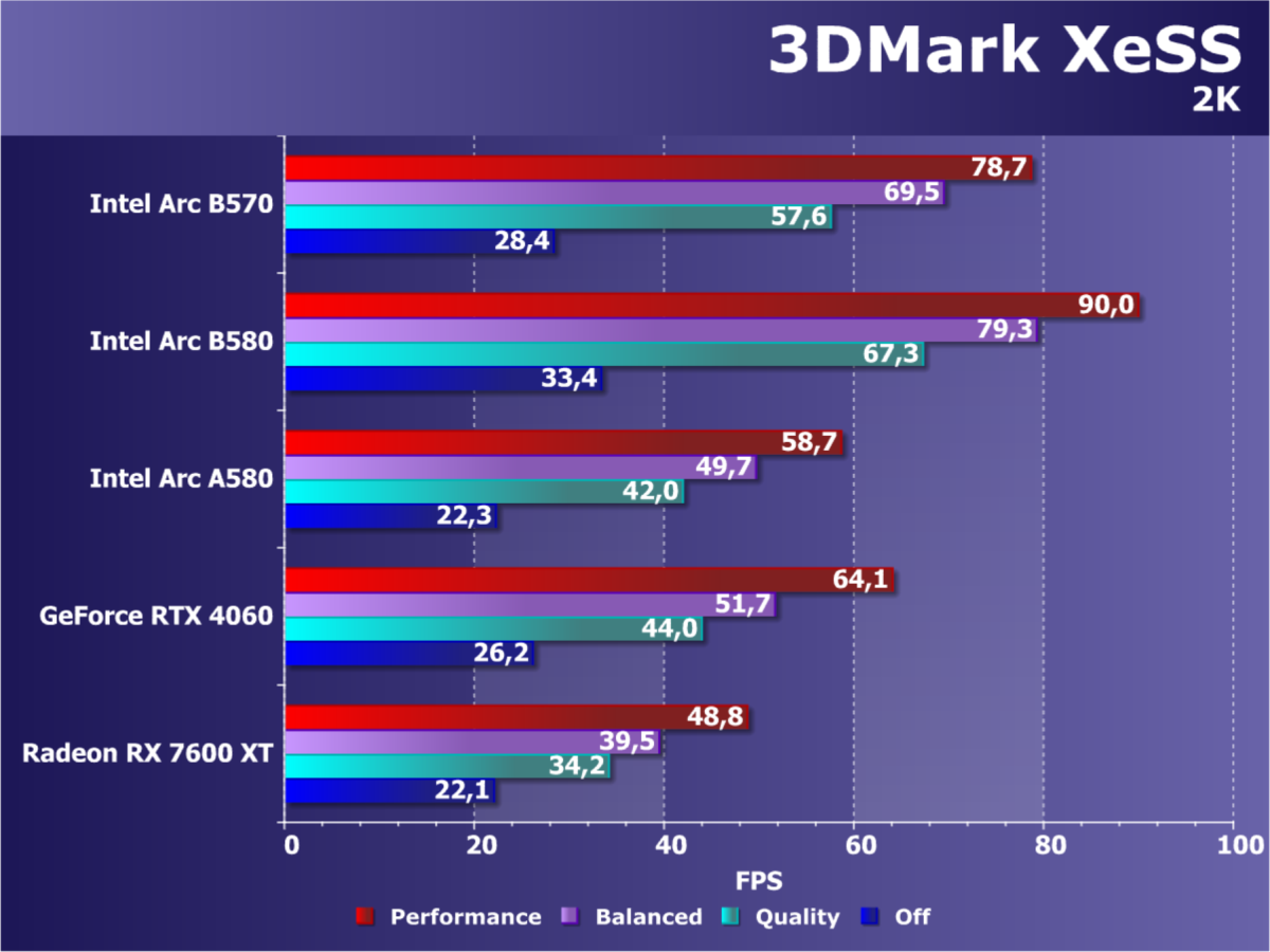 В итоге по производительности трассировки лучей Arc B570 (как и Arc B580) выглядят намного лучше решений AMD (того же ценового сегмента), хотя видеокарты Nvidia всё еще несколько эффективнее справляются конкретно с этой задачей. Также в Battlemage были улучшены движки по работе с матрицами XMX, что сказалось на появлении новой технологии повышения производительности XeSS 2 — уже с генерацией промежуточных кадров.