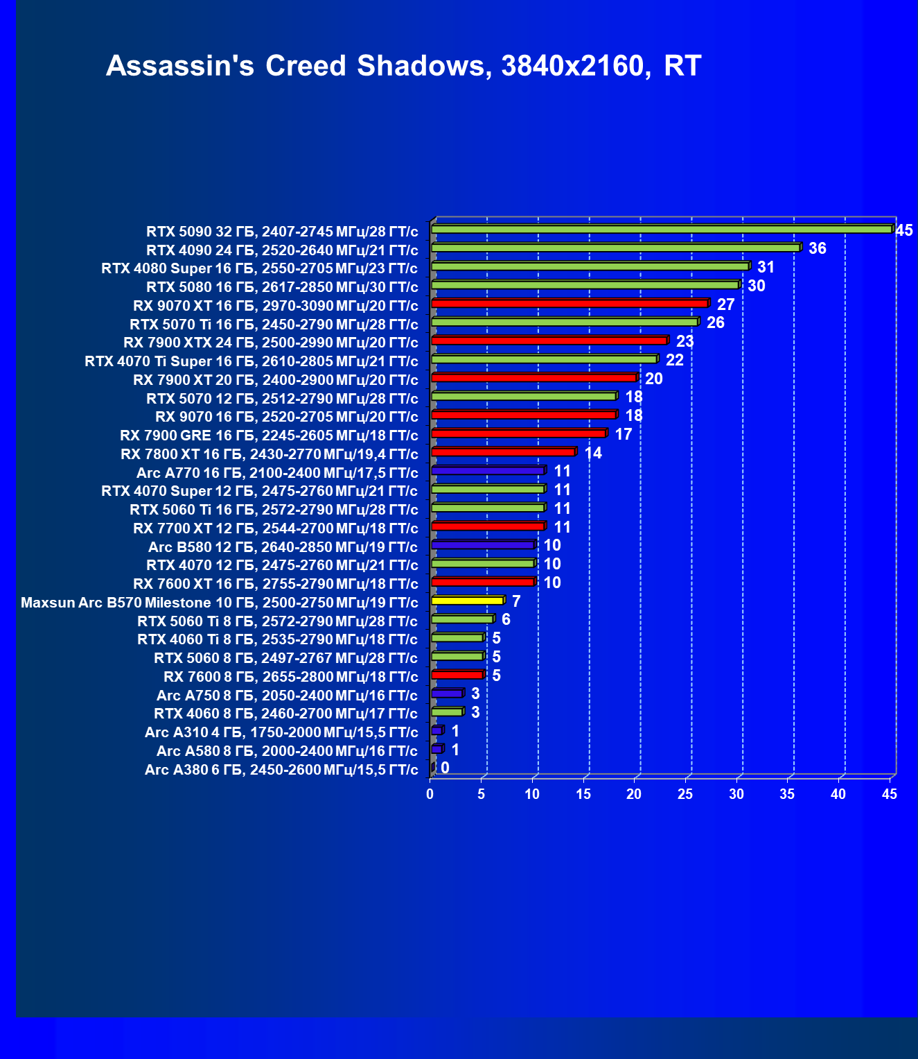 | 22 | Maxsun Arc B570 Milestone 10 ГБ, 2500—2750 МГц/19 ГТ/с | 451 | 155 | 29 000 |