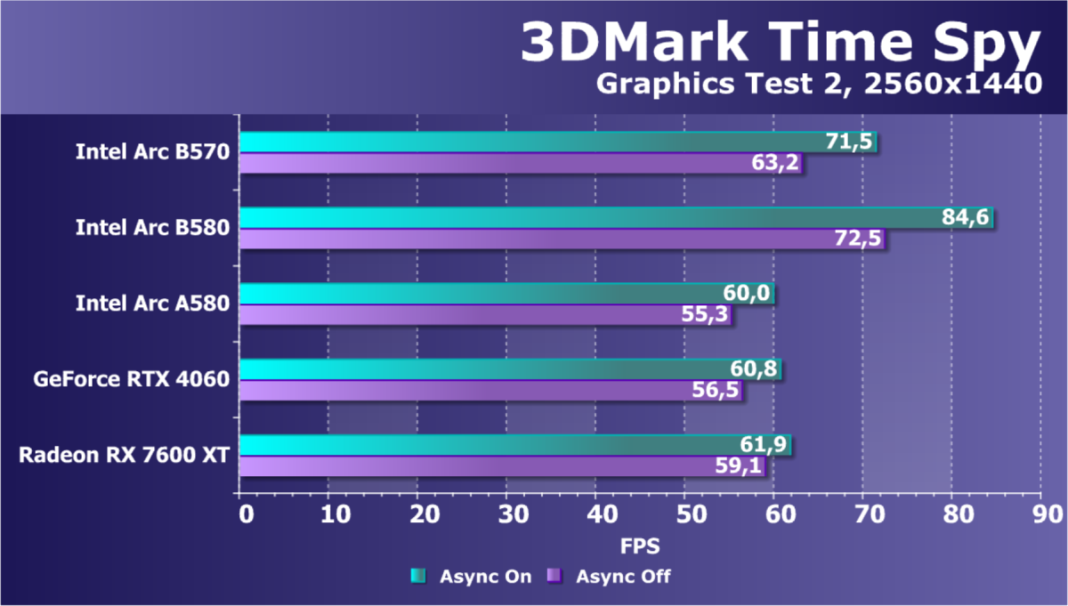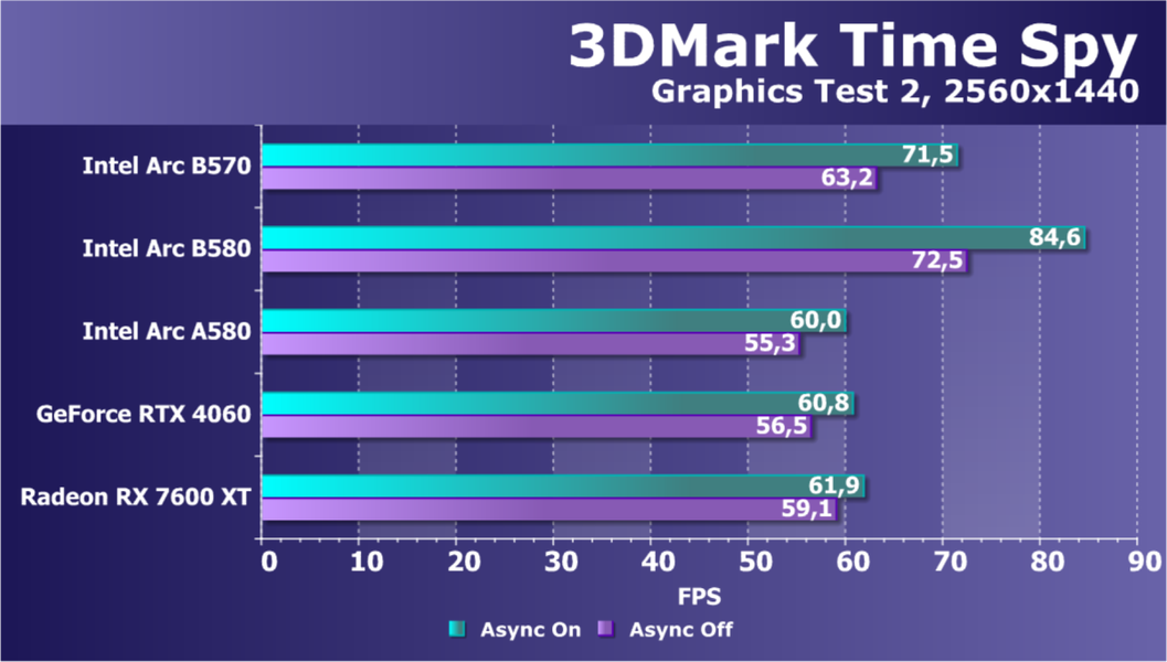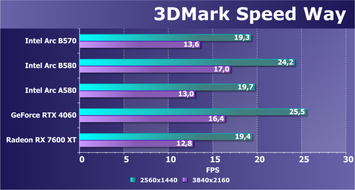 Разумеется, Arc B570 — это ускоритель для разрешения 1080p (Full HD), в котором можно получить хороший комфорт в играх при высоких настройках графики (но без использования трассировки лучей!). В ряде игр можно получить неплохую играбельность и в разрешении 1440p (2.5K).