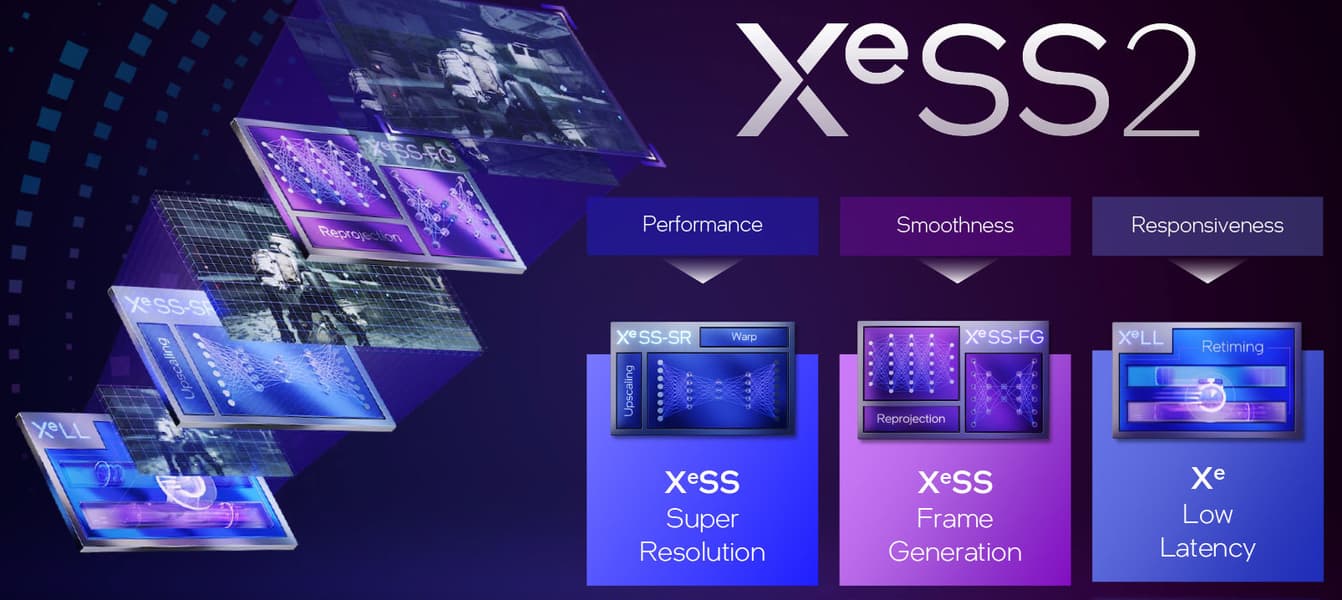 Еще в прошлом поколении компания представила собственную реализацию масштабирования разрешения для увеличения производительности — XeSS. Она теперь называется XeSS Super Resolution (XeSS-SR) и является частью второго поколения — XeSS 2. SR включает исключительно рендеринг в меньшем разрешении и масштабирование результата в более высокое для повышения производительности, а XeSS 2 — это уже набор технологий, примерно как и DLSS последних версий, к XeSS-SR добавились XeSS Frame Generation (XeSS-FG), удваивающая частоту кадров при помощи генерации промежуточных кадров, а также Xe Low Latency (XeLL), снижающая задержку при выводе на экран.