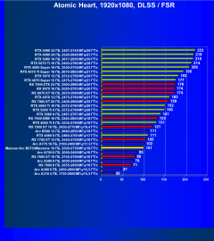 Рейтинг составлен по 10 тестам, в которых используется технология трассировки лучей и одновременно технология Nvidia DLSS, AMD FSR или Intel XeSS. Этот рейтинг нормирован по самому слабому ускорителю в данной группе — Arc A310 (то есть сочетание скорости и функций Arc A310 приняты за 100%).