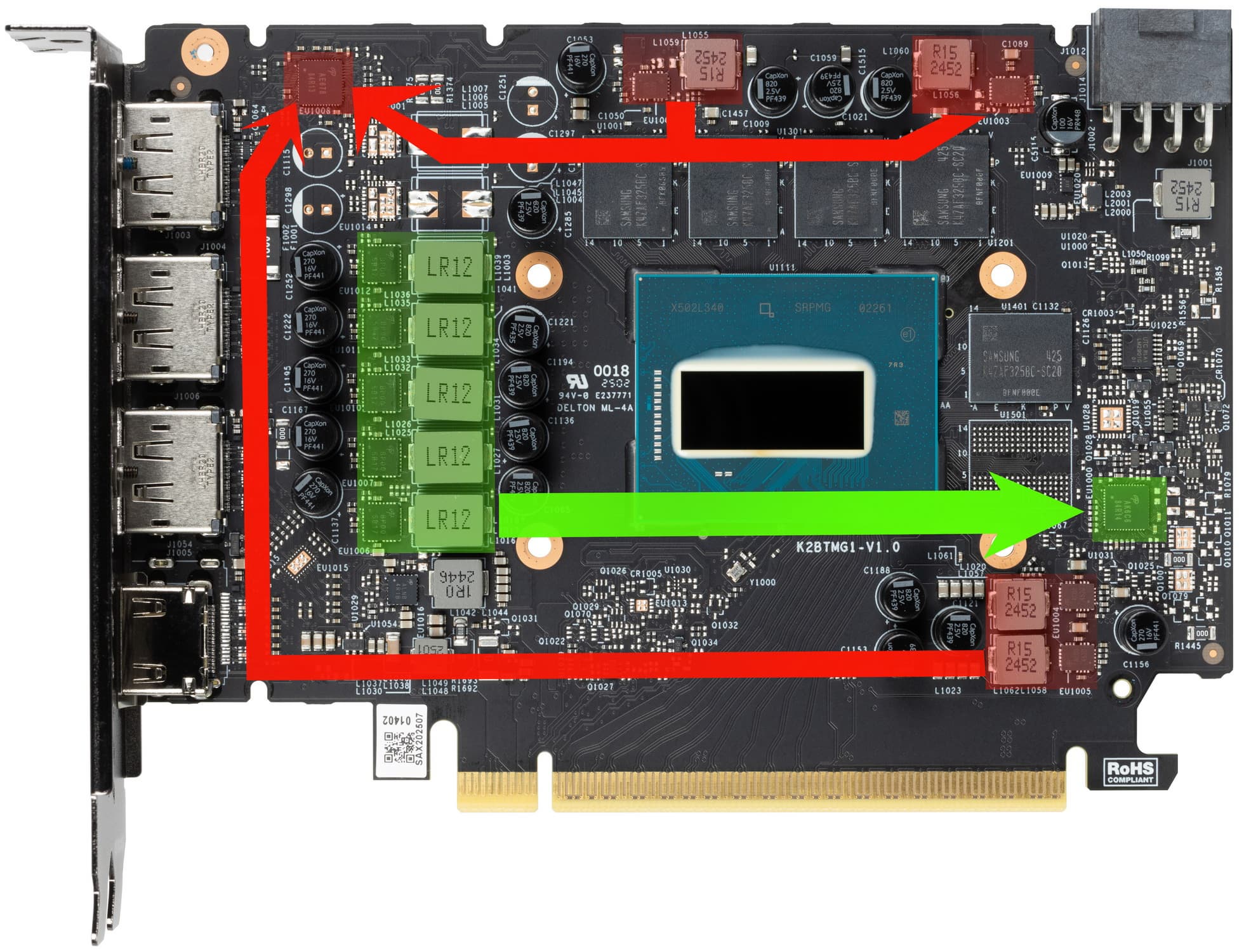 Есть нововведения в новых GPU и по видеовыходам и обработке видеоданных. Так, один из разъемов DisplayPort поддерживает более высокую скорость передачи данных — UHBR13.5, с возможностью вывода 4K-изображения с частотой до 360 Гц, а два других поддерживают в этом режиме лишь 240 Гц. Графические процессоры серии Battlemage поддерживают все современные кодеки, включая аппаратное ускоренное видеокодирование в форматах AV1, VP9, H.264 и H.265. В целом, все современные GPU поддерживают декодирование AV1, но есть разница в вопросах кодирования этого формата. Поддерживается также 10-битное кодирование и декодирование формата HEVC с цветовой субдискретизацией 4:2:2, а также кодирование AV1 Screen Content Coding (SCC), хорошо подходящее для записи содержимого экрана. Но большинству людей всё это просто не нужно, не все же создатели контента и стримеры, а для остальных и H.265 с H.264 вполне сгодятся. С подключением по видеовыходам то же самое — поддержка 4K до 360 Гц — это прекрасно, но в этом ценовом сегменте большинство людей использует Full HD мониторы.