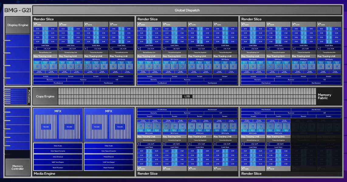 Каждый раздел Render Slice физически содержит несколько Xe-ядер, блоков трассировки лучей, движков обработки геометрии, блоков текстурирования и ROP. Кроме Render Slice, в чипе есть еще блок Media Engine, состоящий из пары многоформатных аппаратных кодировщиков и декодеров MFX. Также в чипе есть контроллер памяти GDDR6 и движок Display Engine с поддержкой четырех дисплейных выходов. Изменяя количество блоков Render Slice в графическом процессоре и регулируя количество Xe-ядер в них, можно создавать GPU разного уровня.