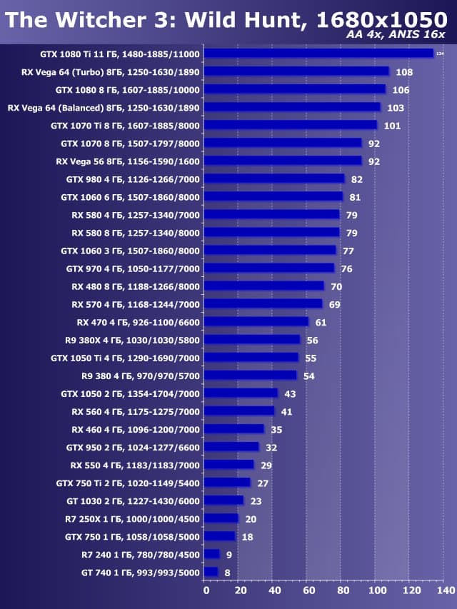 | 19 | GTX 1050 Ti 4 ГБ, 1290—1690/7000 | 710 | 645 | 11 000 |