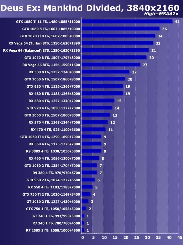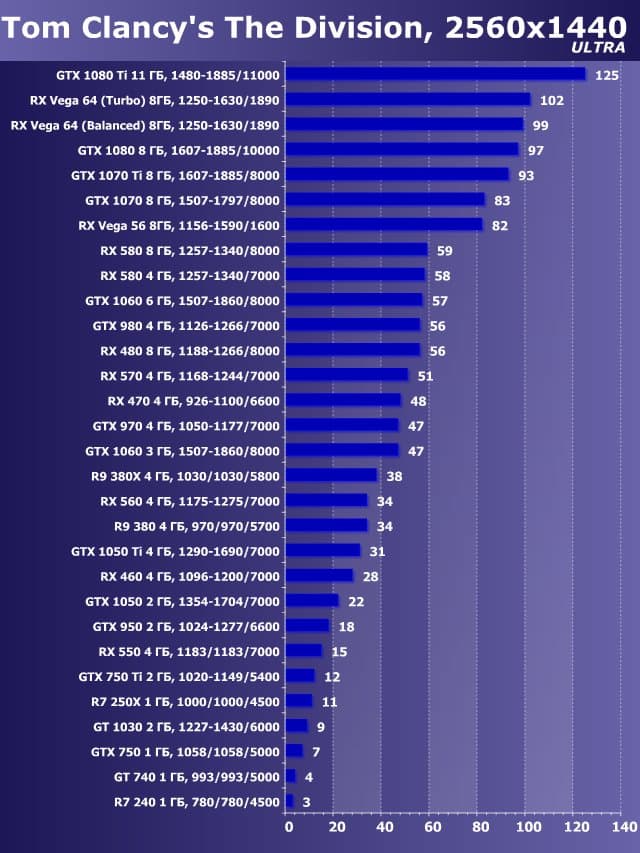 | 11 | GTX 1050 2 ГБ, 1354—1704/7000 | 558 | 530 | 9500 |