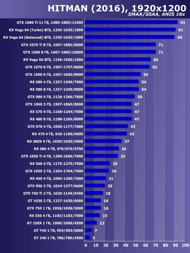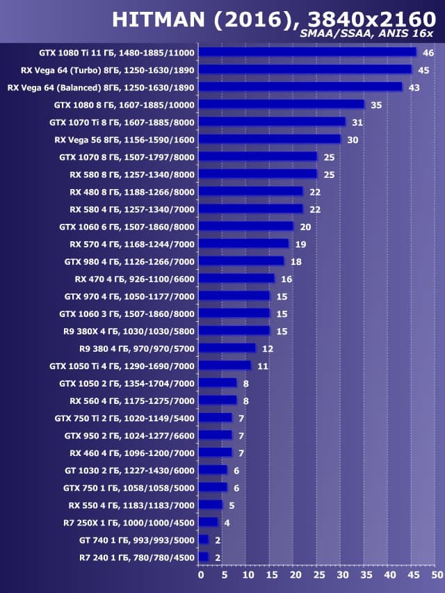 | 21 | RX 460 4 ГБ, 1096—1200/7000 | 550 | 705 | 7800 |