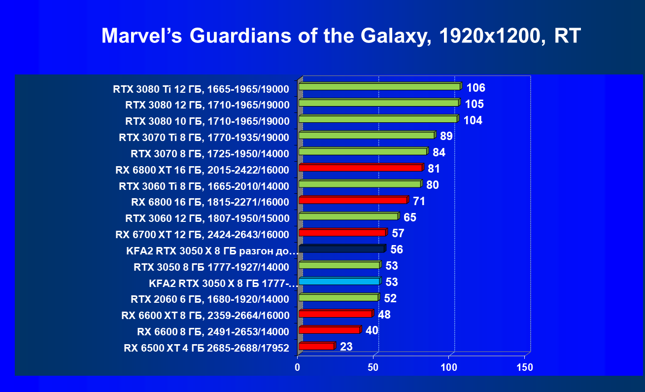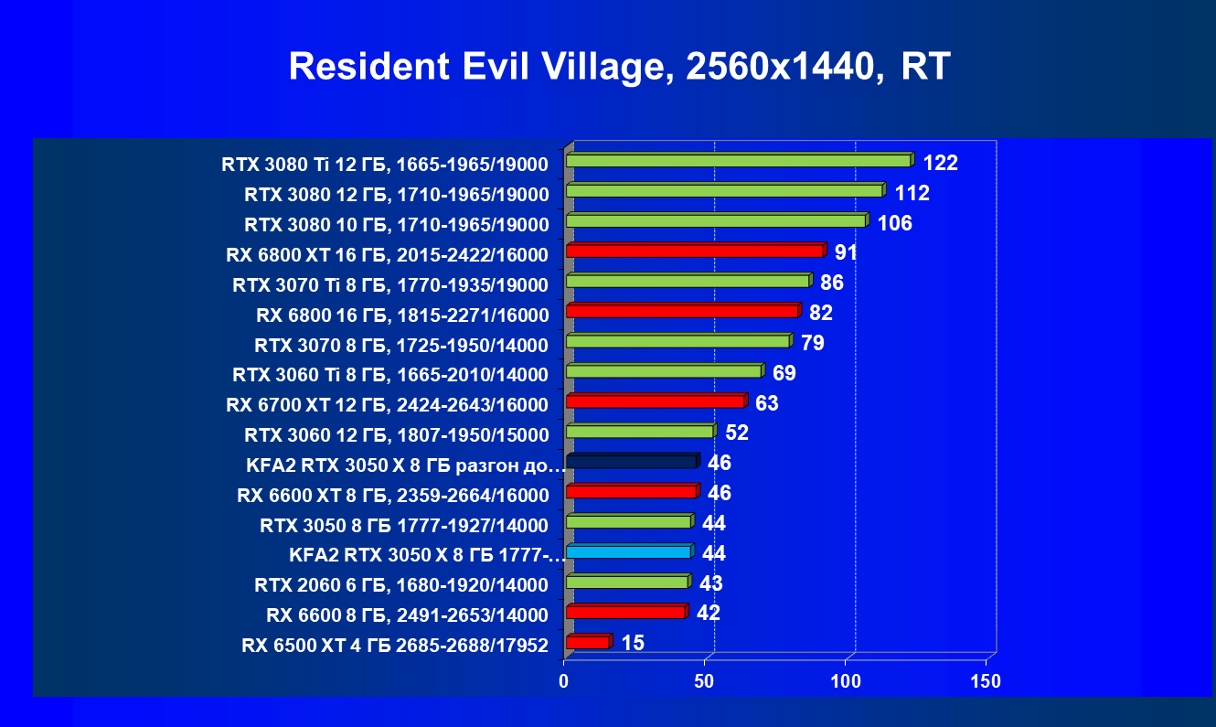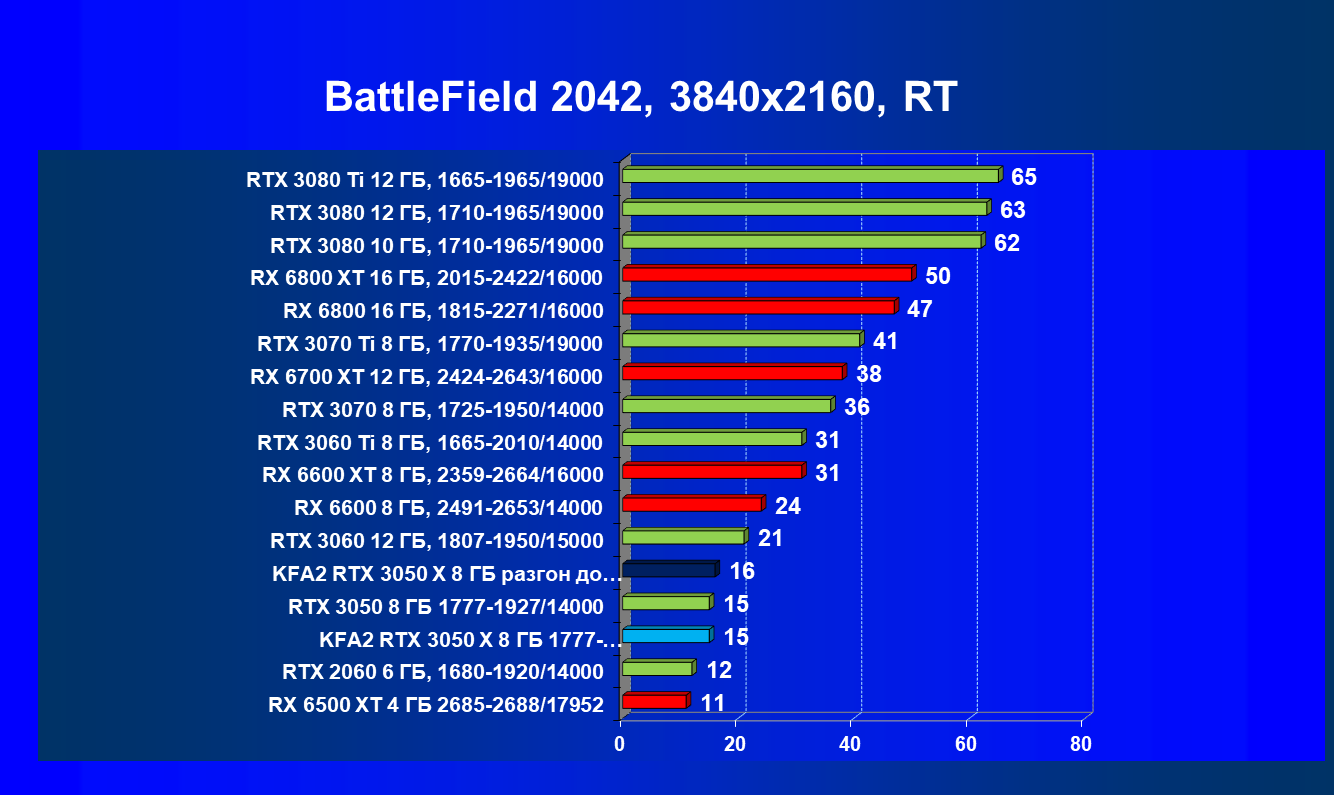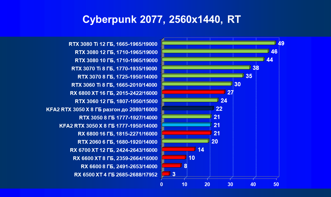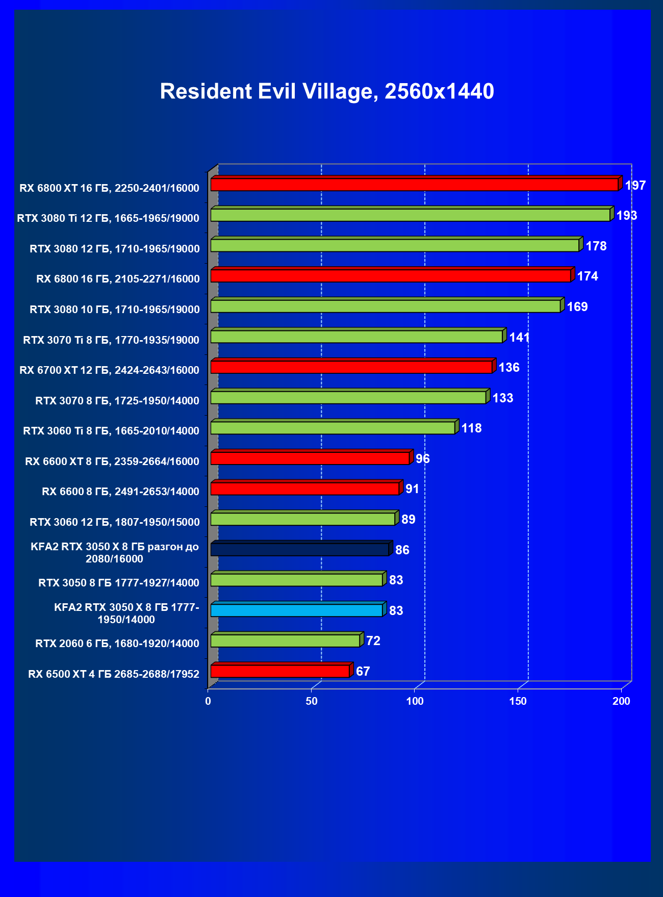 Результаты тестов в «классических» играх (без трассировки лучей) показали, что KFA2 GeForce RTX 3050 X находится на уровне между GeForce RTX 2060 и GeForce RTX 3060, обычно ближе к первому. При ручном разгоне производительность достигает видеокарты RX 6600, которая подороже.