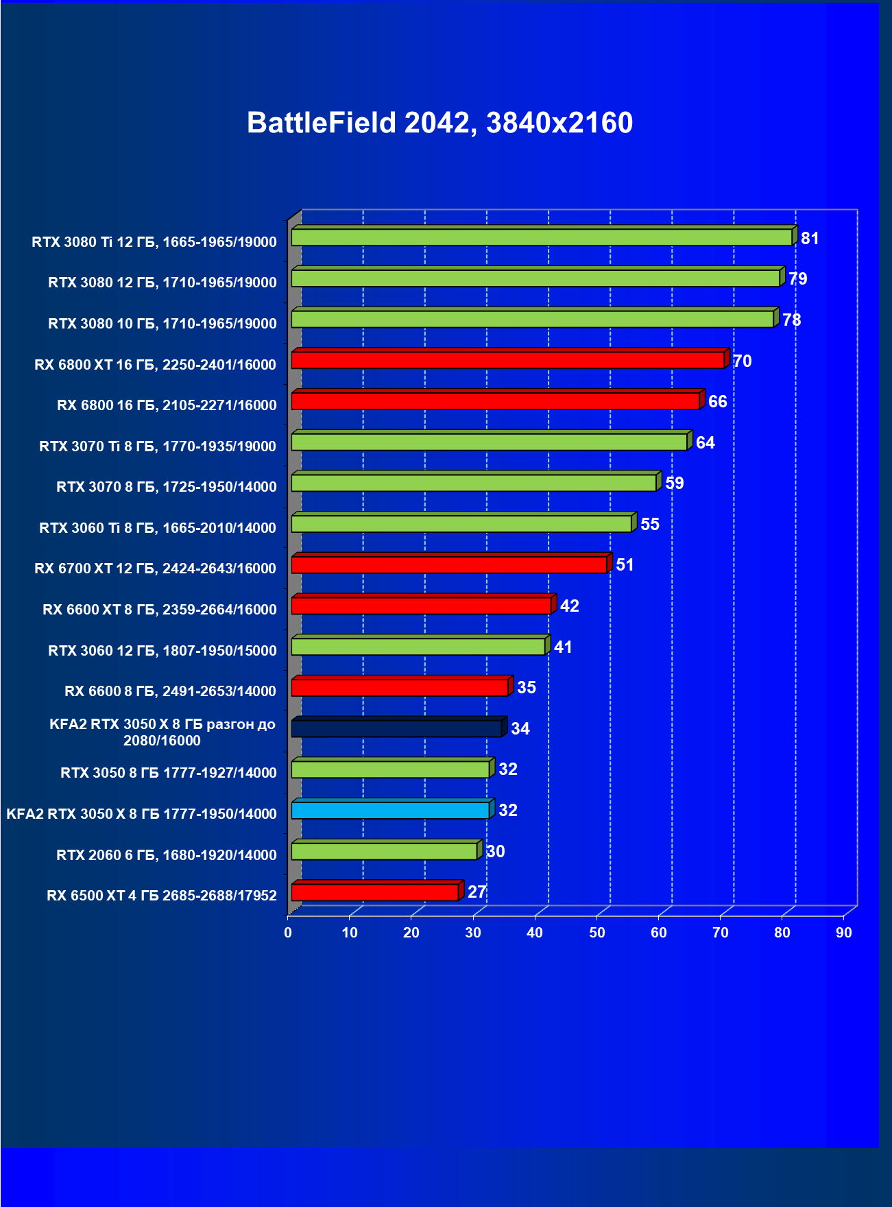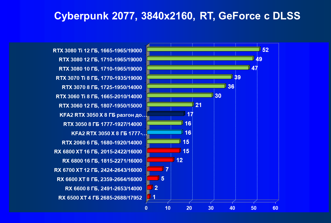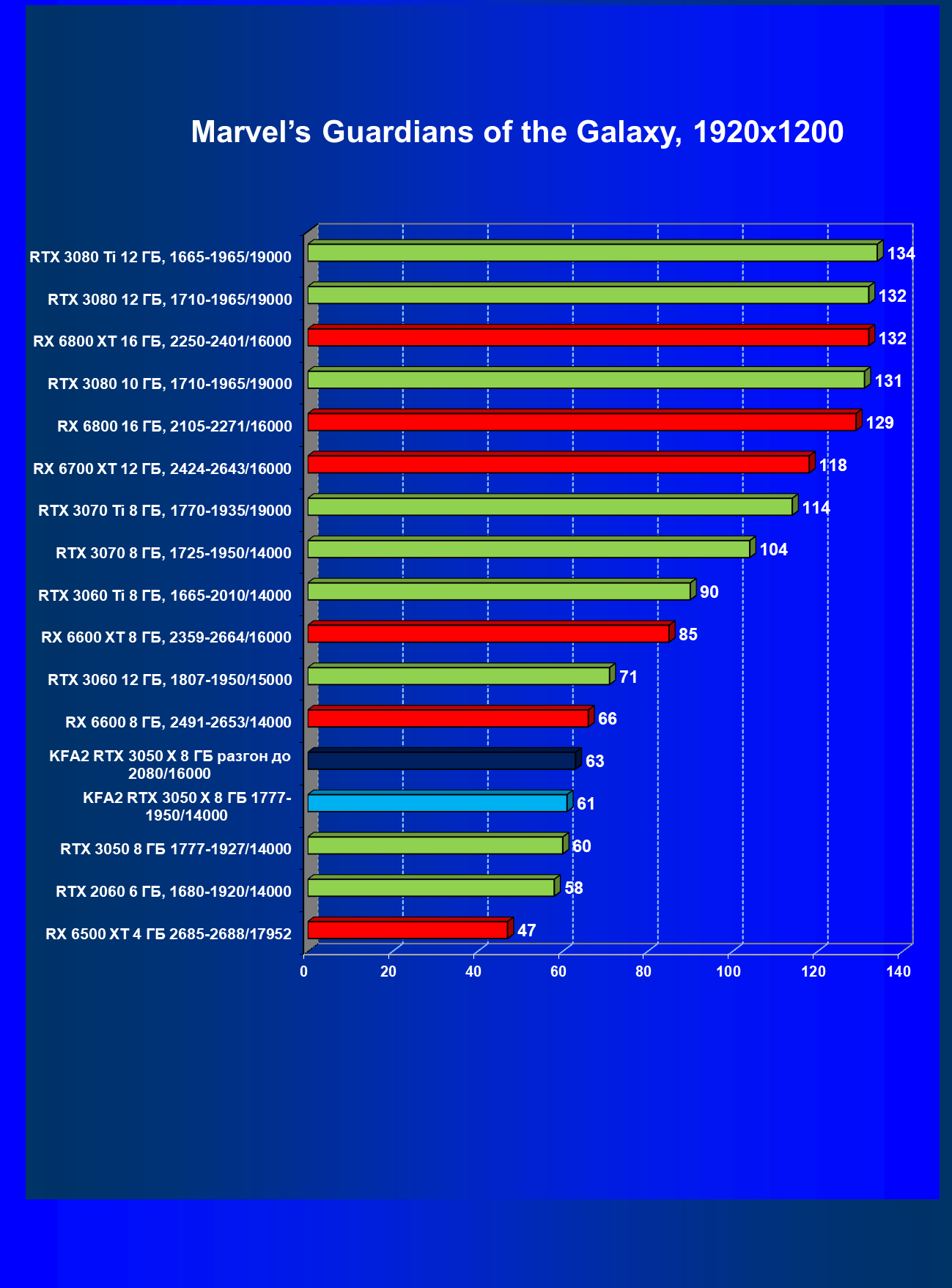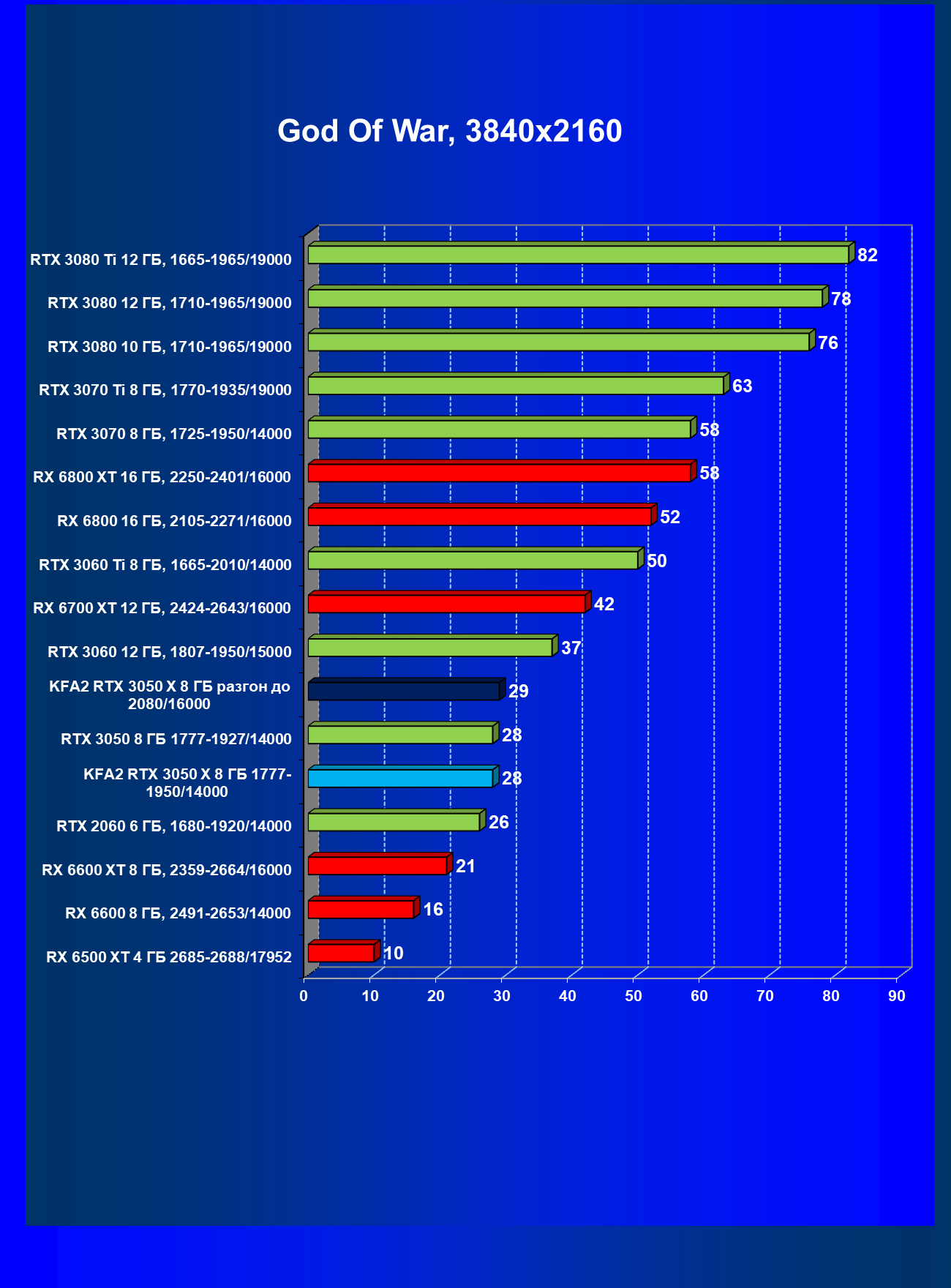 Результаты тестов в «классических» играх (без трассировки лучей) показали, что KFA2 GeForce RTX 3050 X находится на уровне между GeForce RTX 2060 и GeForce RTX 3060, обычно ближе к первому. При ручном разгоне производительность достигает видеокарты RX 6600, которая подороже.