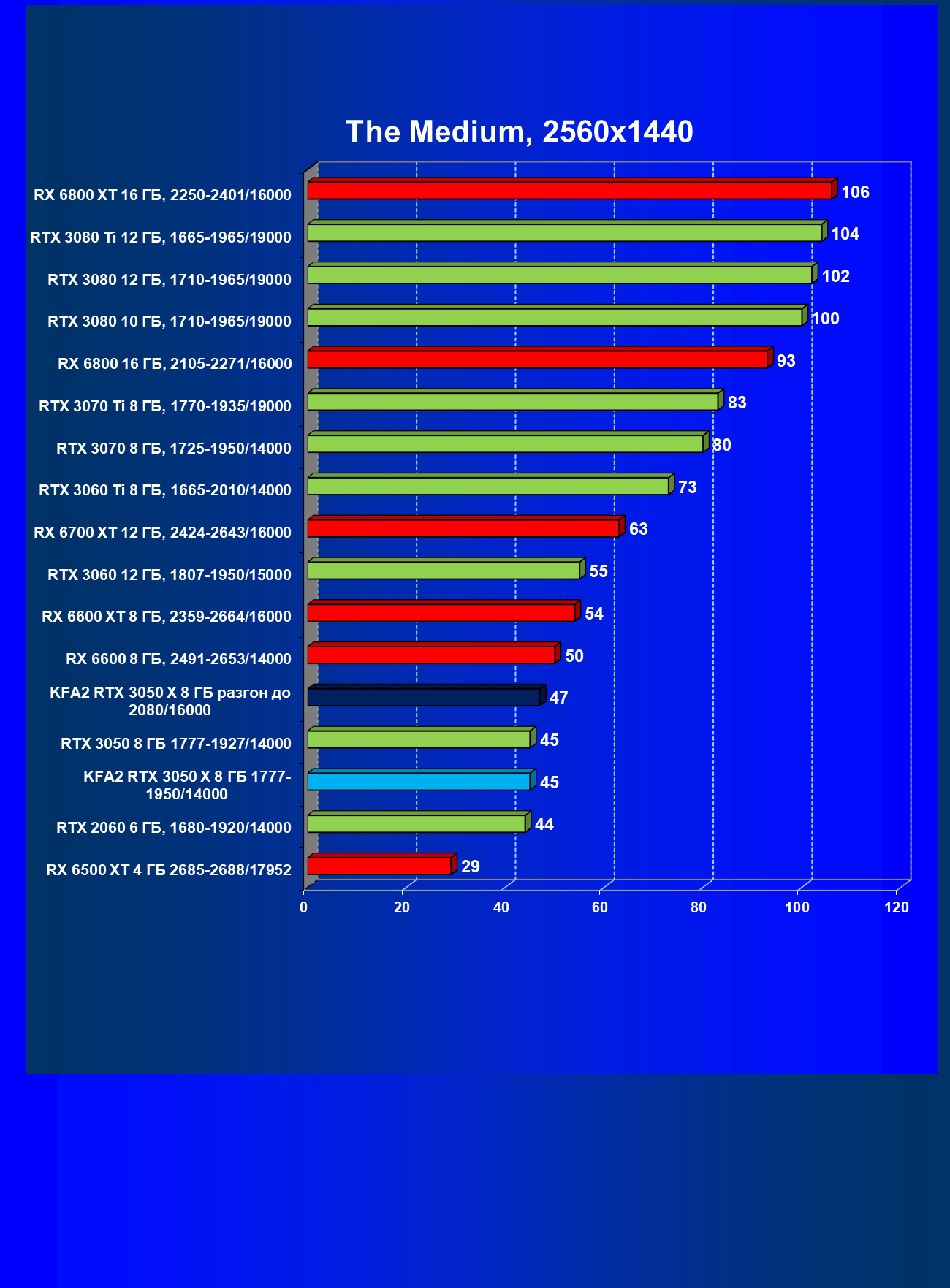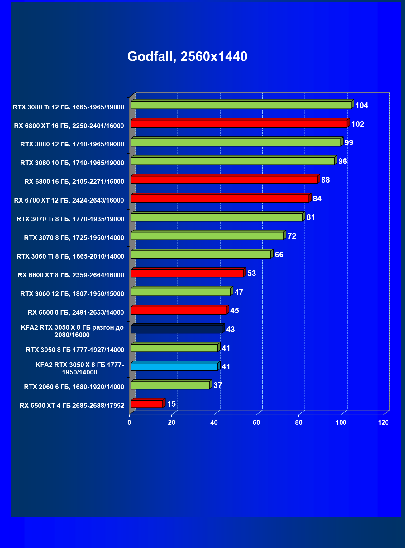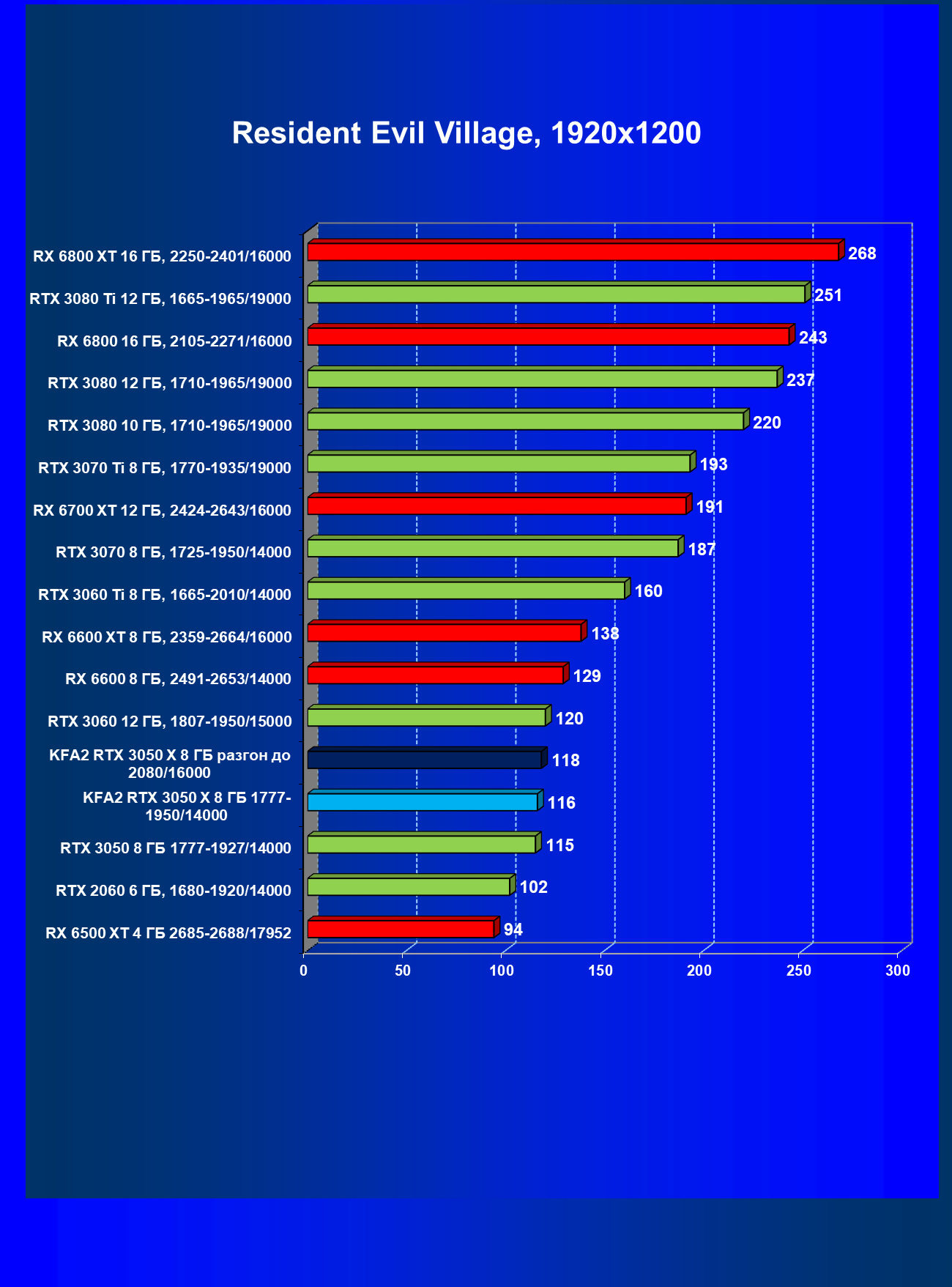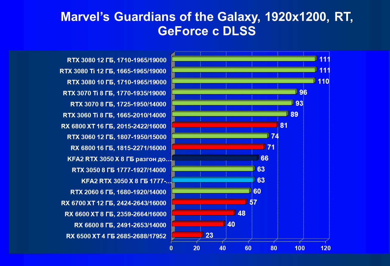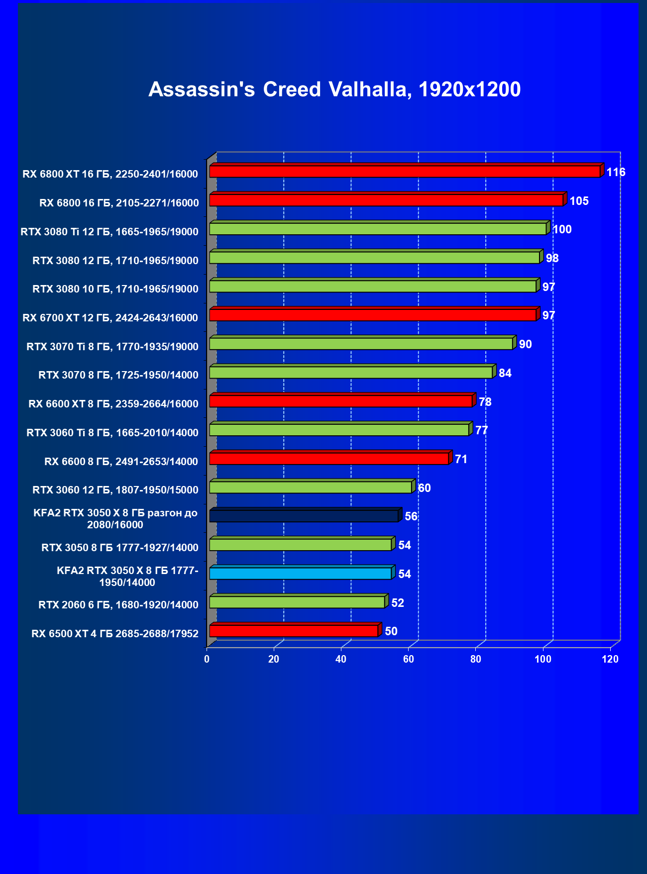 Результаты тестов в «классических» играх (без трассировки лучей) показали, что KFA2 GeForce RTX 3050 X находится на уровне между GeForce RTX 2060 и GeForce RTX 3060, обычно ближе к первому. При ручном разгоне производительность достигает видеокарты RX 6600, которая подороже.