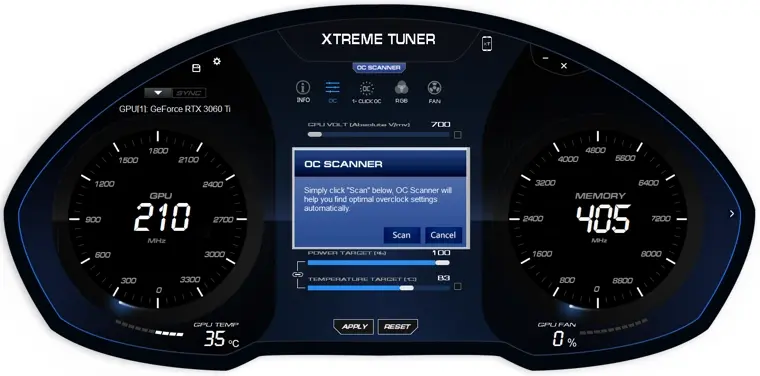 Также программа обеспечивает возможность автоматического разгона с помощью OC Scanner. OC Scanner постепенно увеличивает частоту с шагом 5-10 МГц, выполняя стресс-тест на каждой остановке и определяя таким образом наиболее высокую частоту, при которой система сможет работать стабильно. Весь процесс занимает 10—30 минут в зависимости от потенциала ГП.