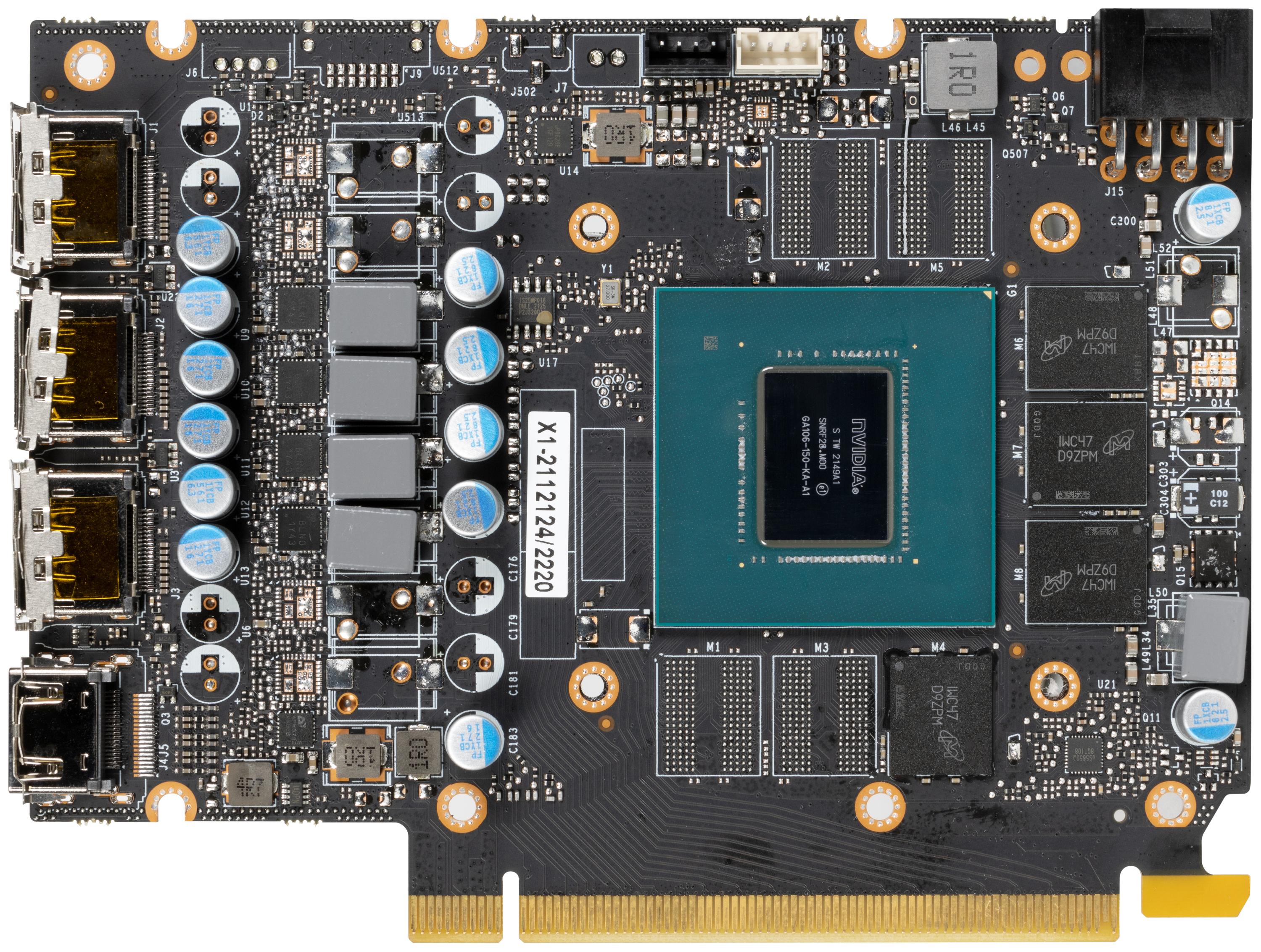Карта имеет 8 ГБ памяти GDDR6 SDRAM, размещенной в 4 микросхемах по 16 Гбит на лицевой стороне PCB. Микросхемы памяти Micron (GDDR6, D9ZPM) рассчитаны на условную номинальную частоту работы в 3500 (14000) МГц.