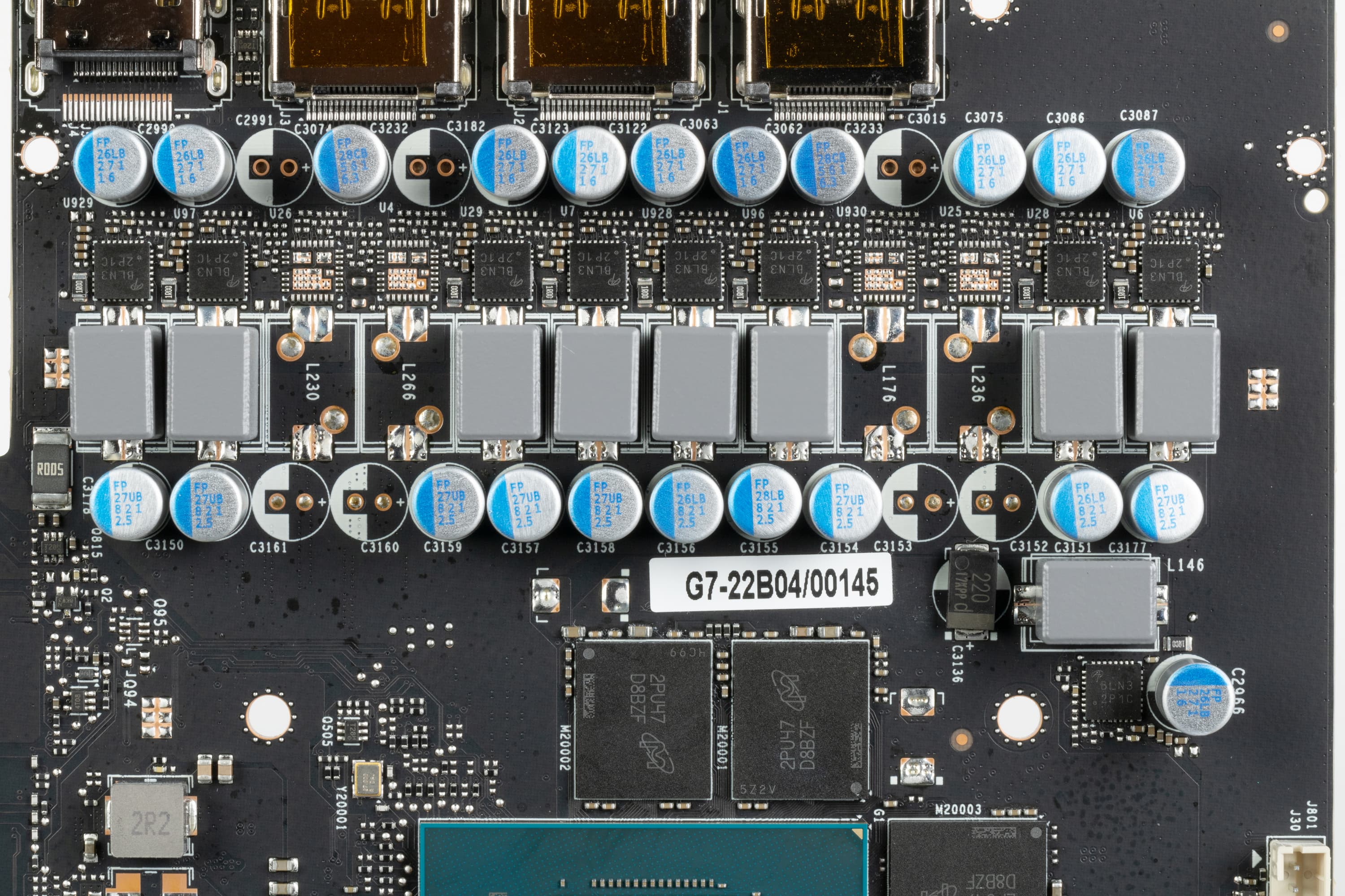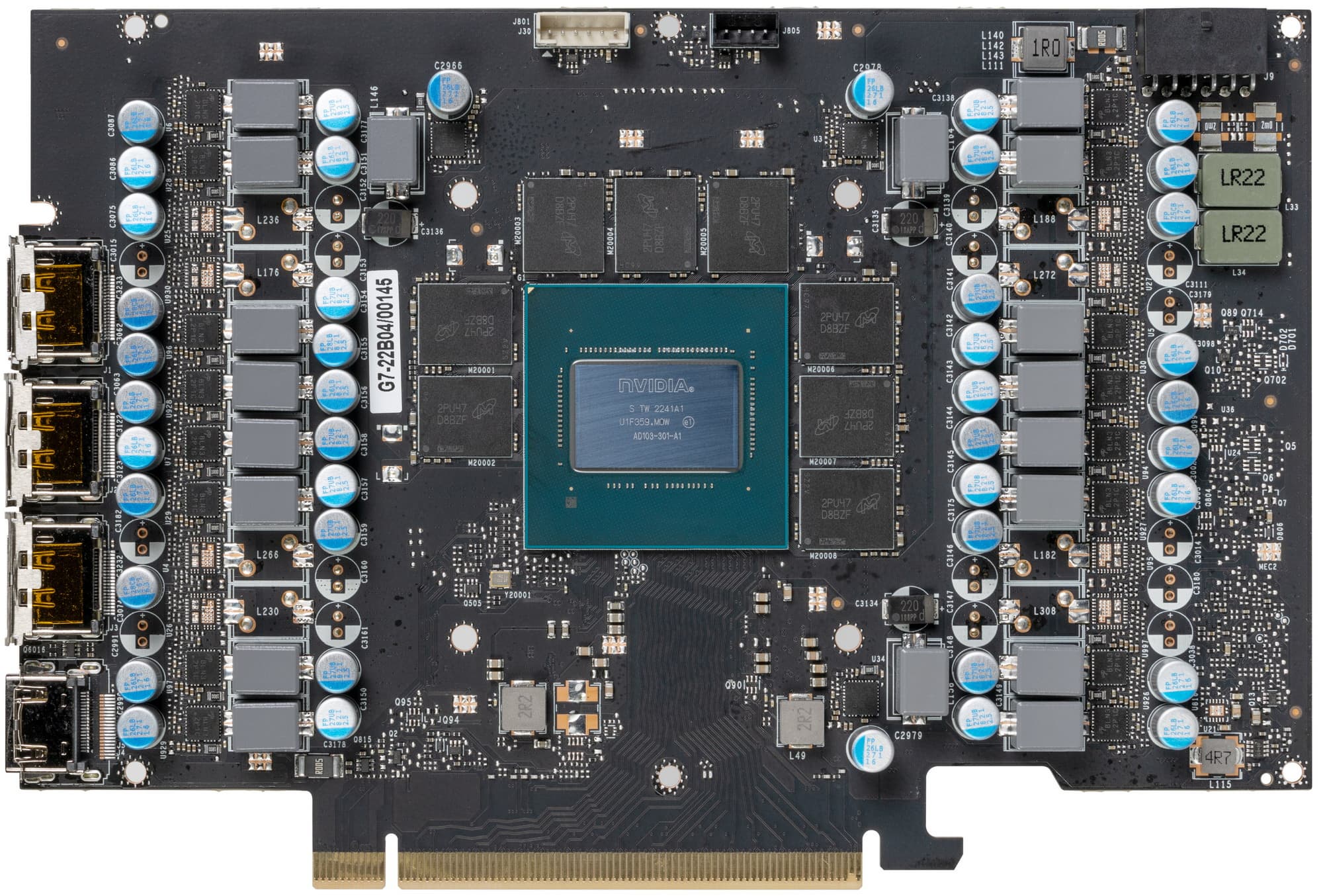 Карта имеет 16 ГБ памяти GDDR6X SDRAM, размещенной в 8 микросхемах по 16 Гбит на лицевой стороне PCB. Микросхемы памяти Micron (GDDR6X, MT61K512M32KPA-24 / D8BZF) рассчитаны на номинальную частоту работы в 3000 (24000) МГц.
